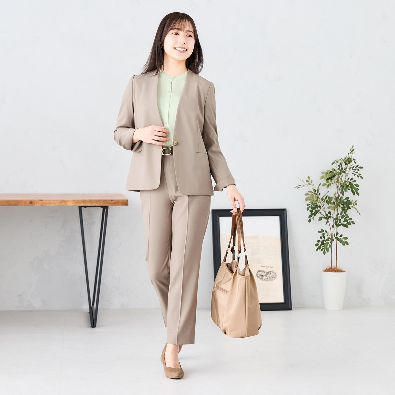 無領剪裁讓臉周輪廓顯得乾淨俐落,可搭配針織衫、領結襯衫等多種設計上衣,打造多樣穿搭變化,亦不失正式感。