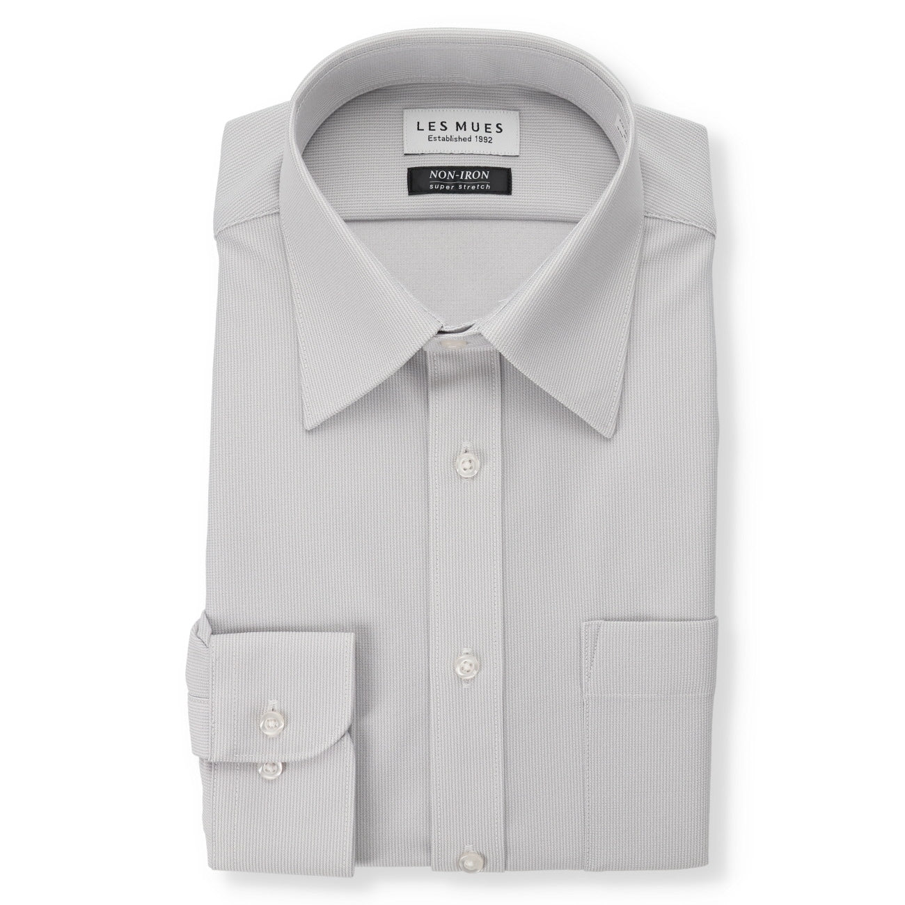 Long sleeves, point collar, left chest pocket, collar stay, convertible cuffs