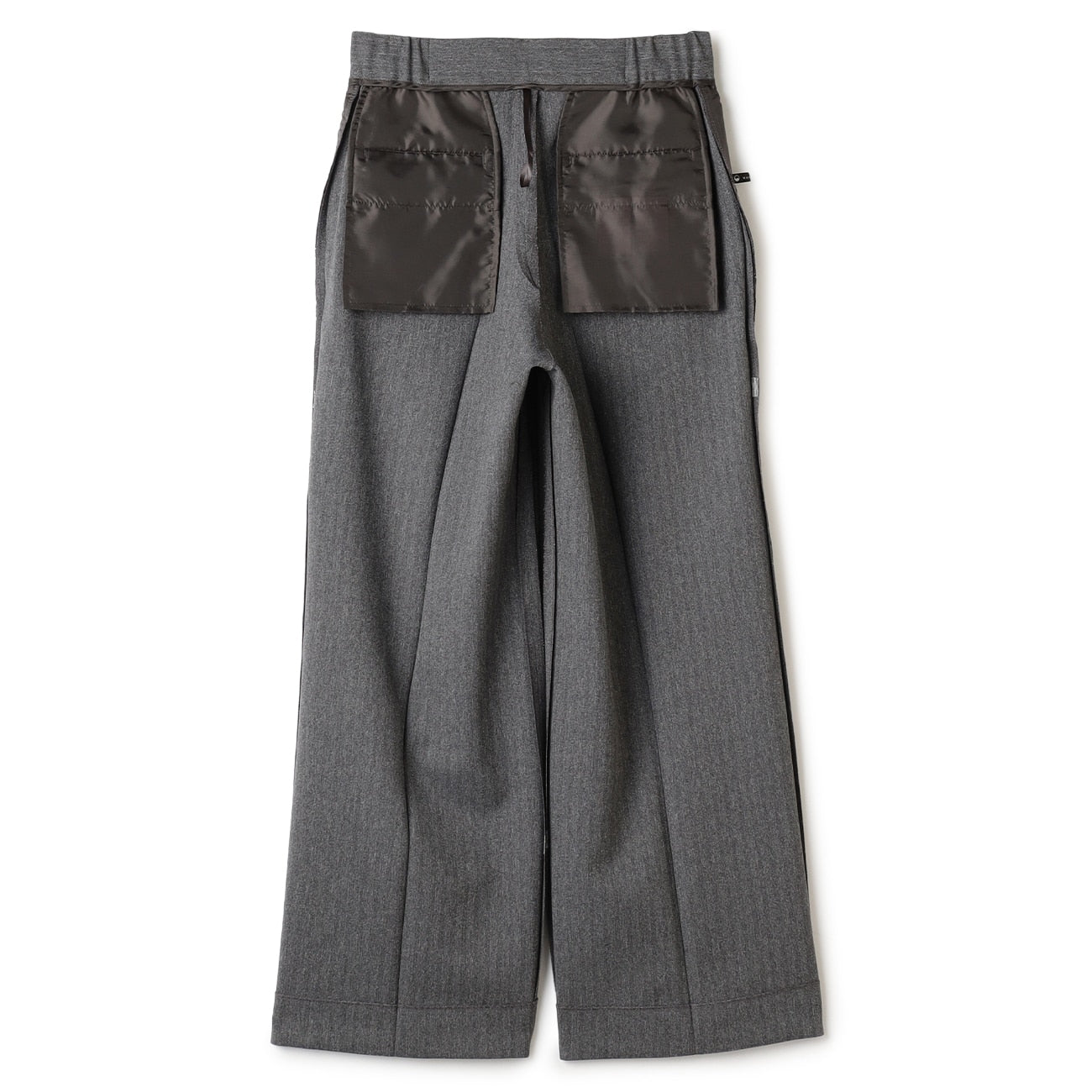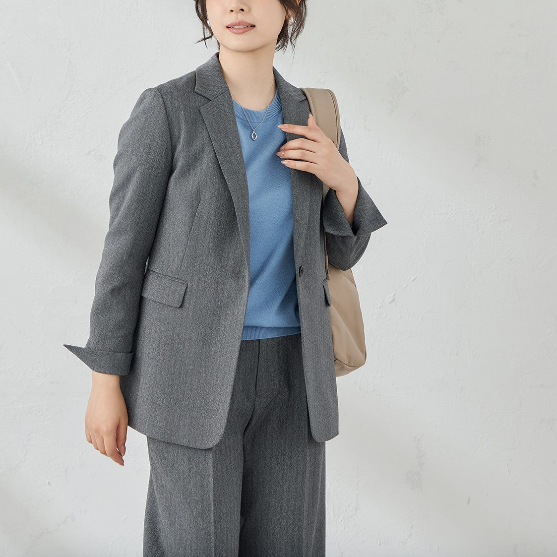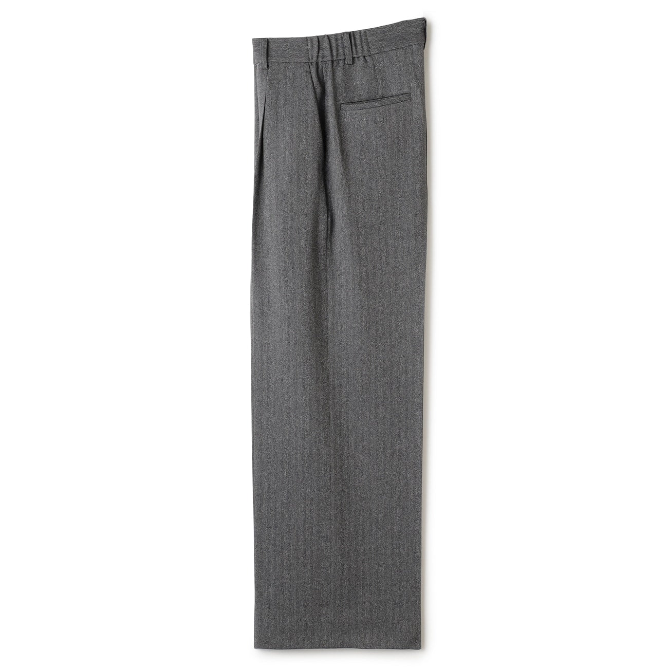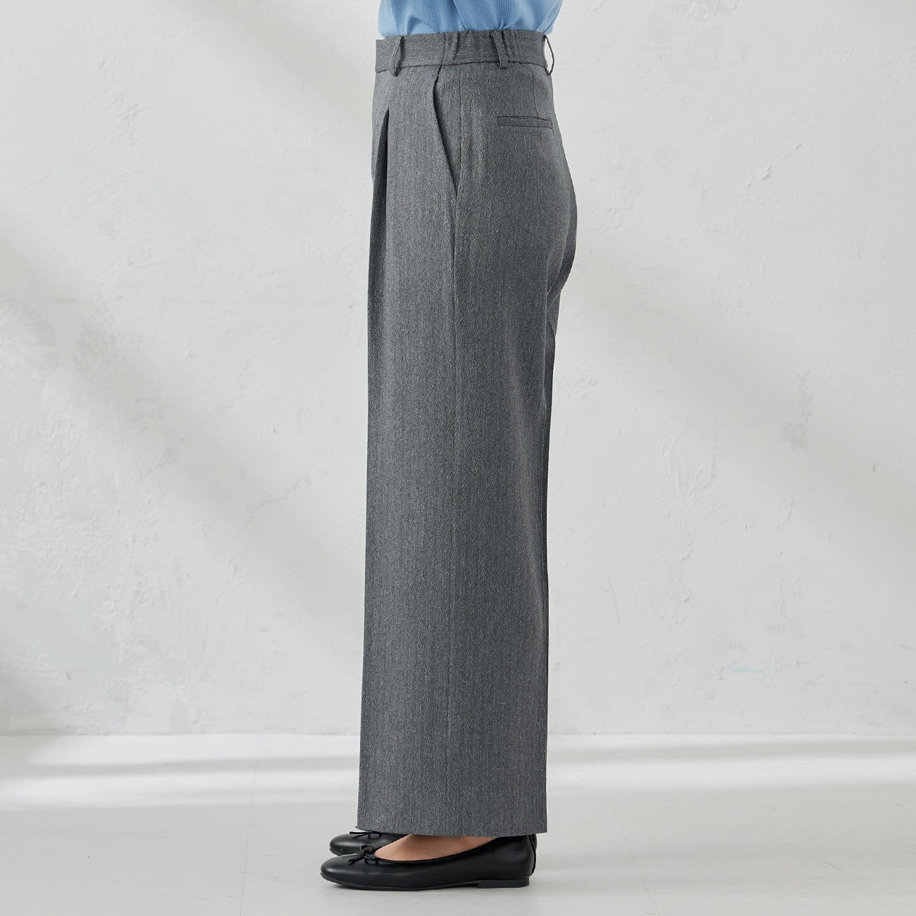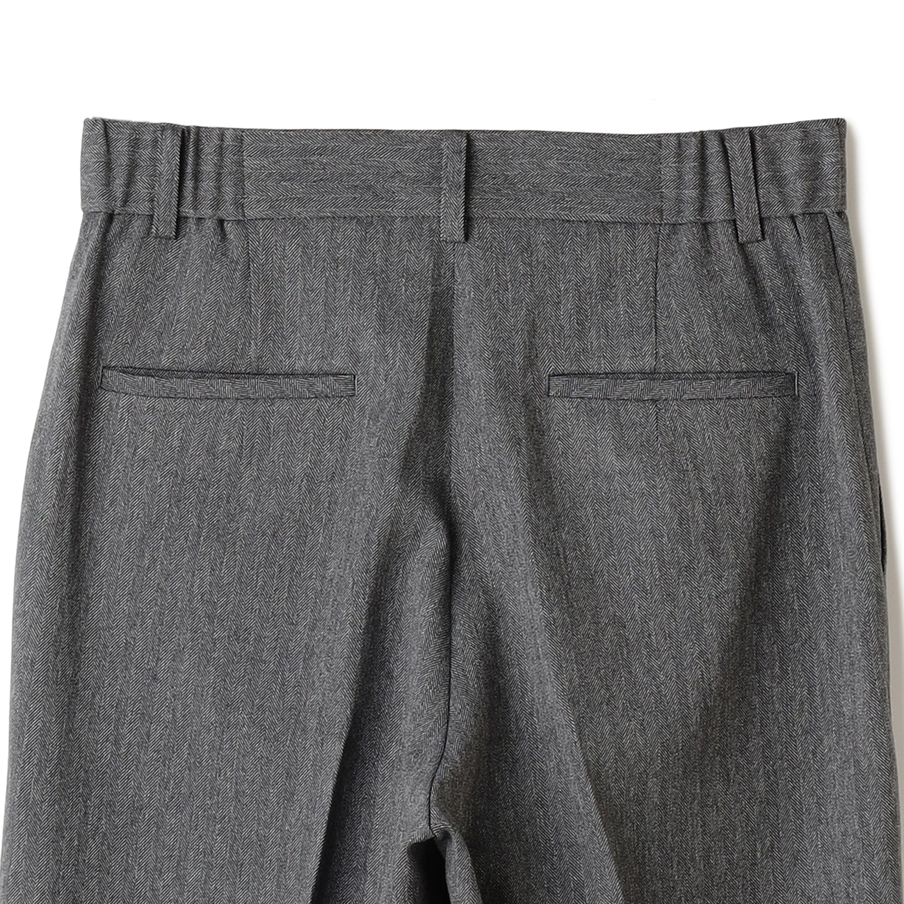 採用仿毛花呢風格的人字形布料,打造優雅的秋冬造型。立體前褶與適中的寬敞度,營造出精緻又輕鬆的感覺。
