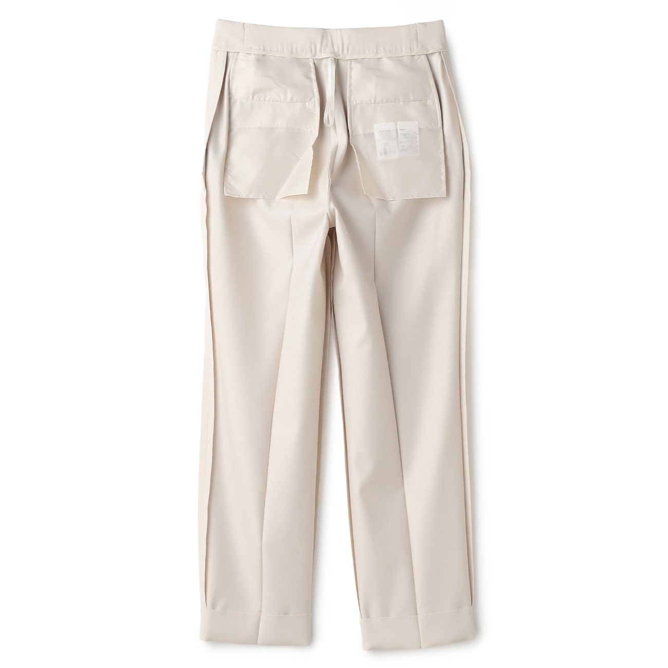 直筒剪裁,下擺收邊,前後口袋設計,後腰彈性收束,無內襯