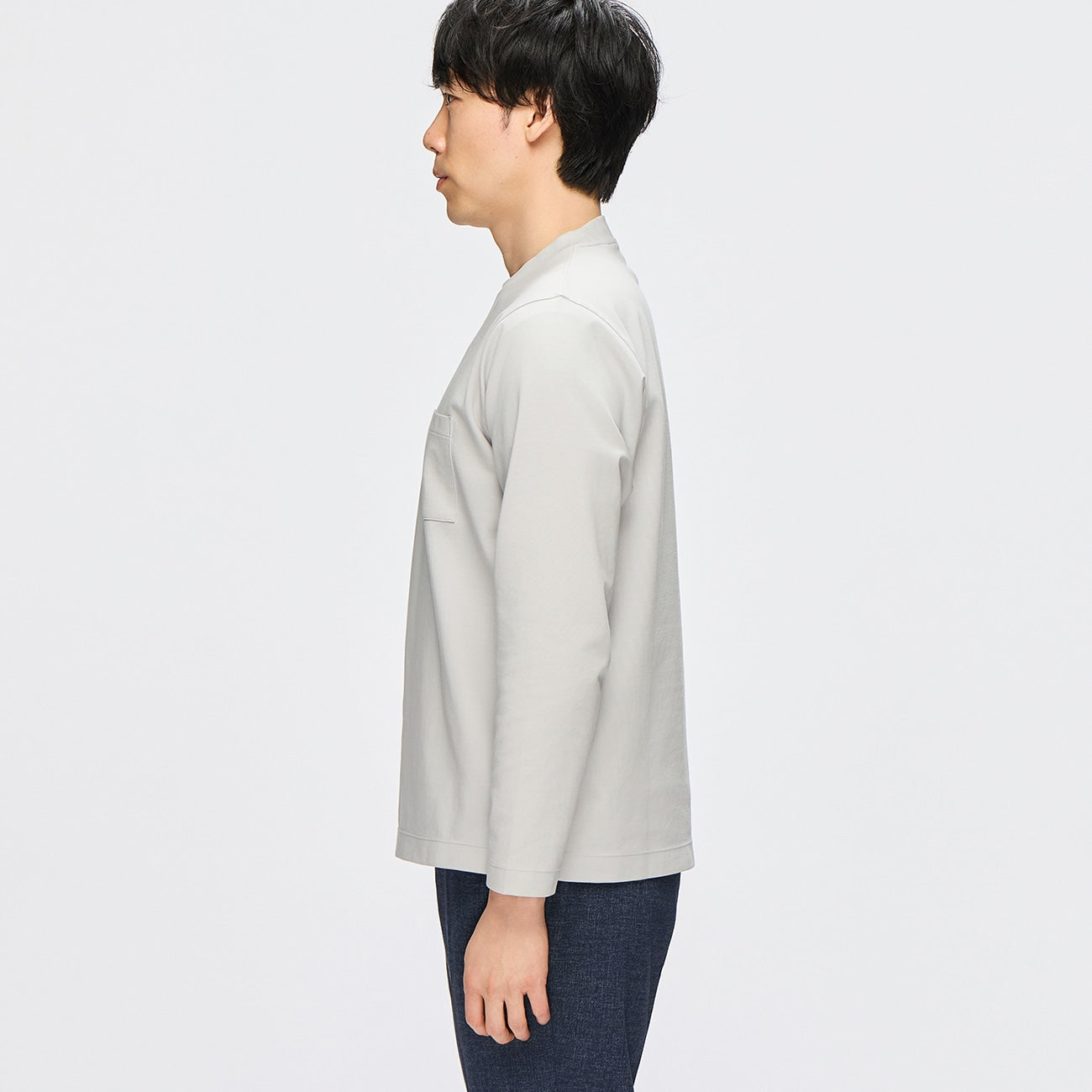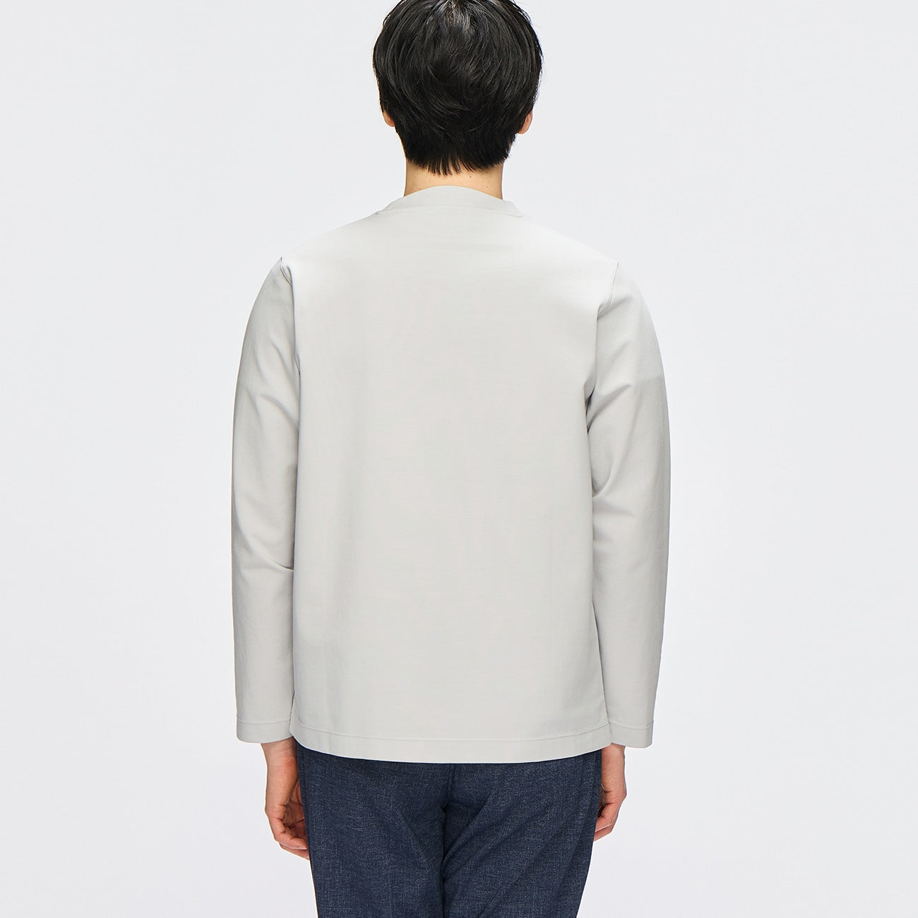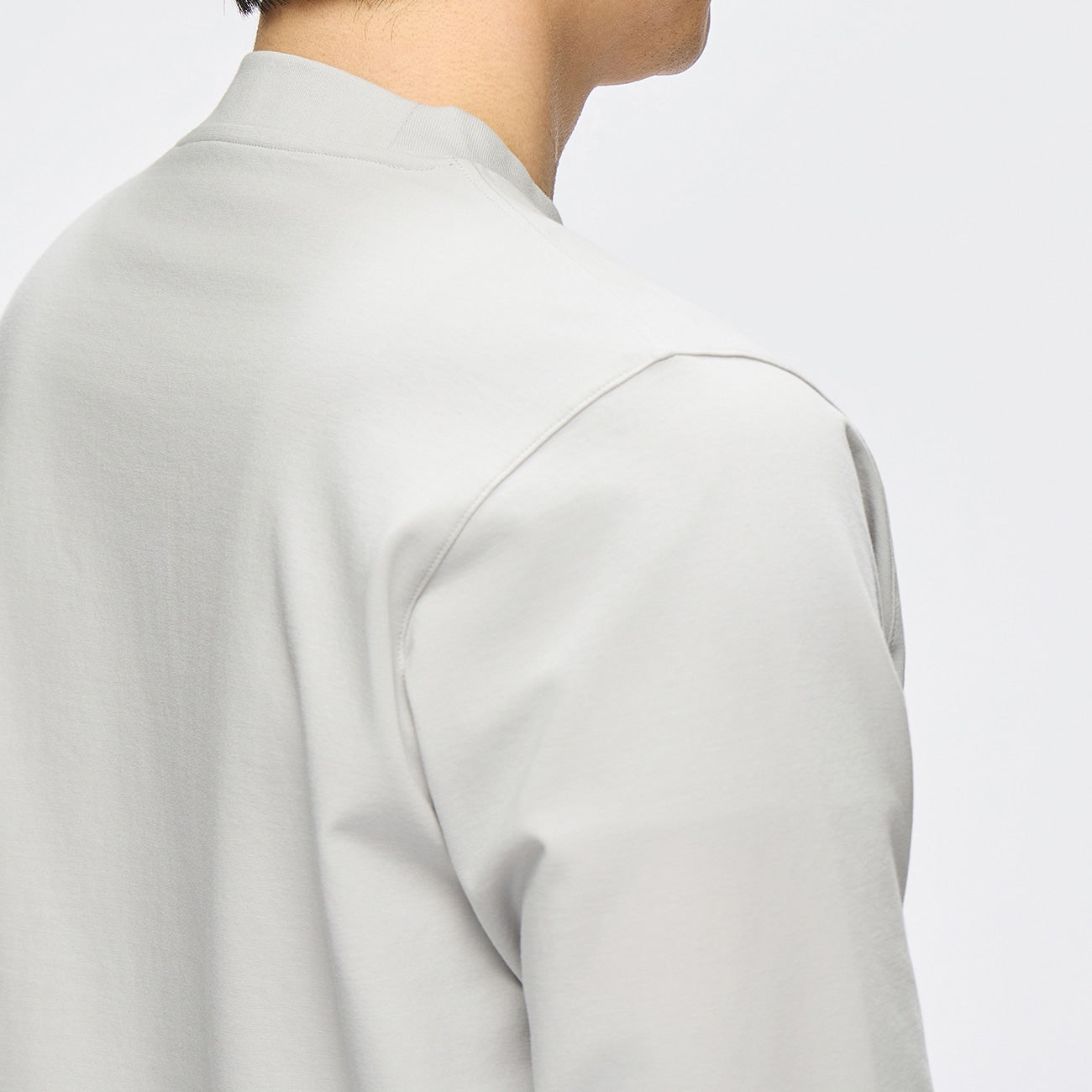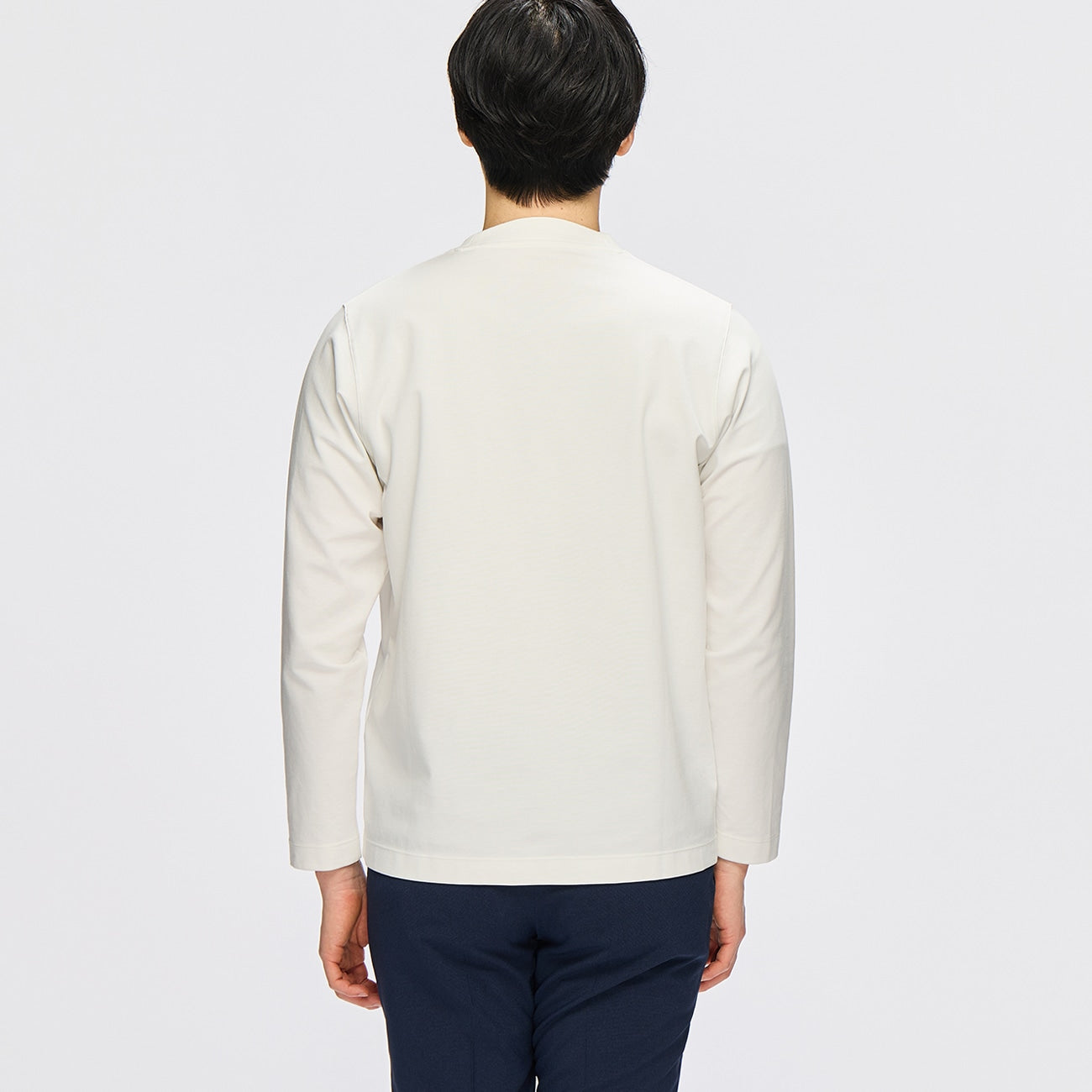 The updated design features no visible stitching on the front neckline and finer twin-needle stitching on the cuffs and hem. These subtle details create a sharp, dressy impression that stands out whether worn alone or as an inner layer.