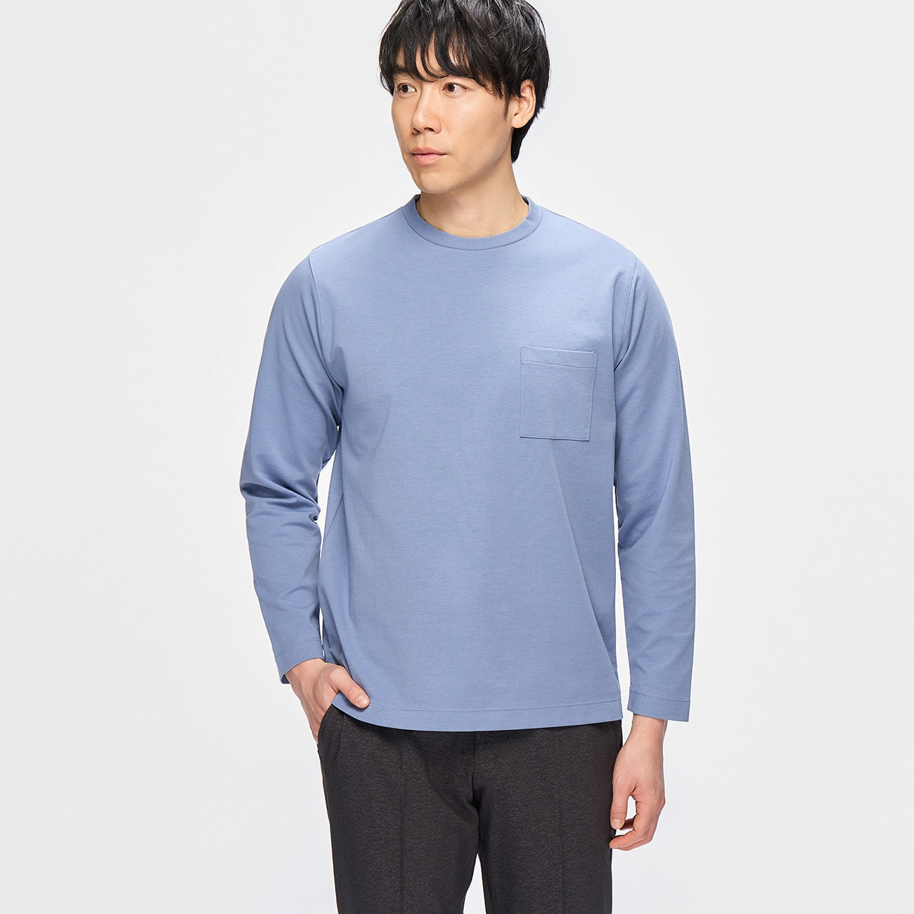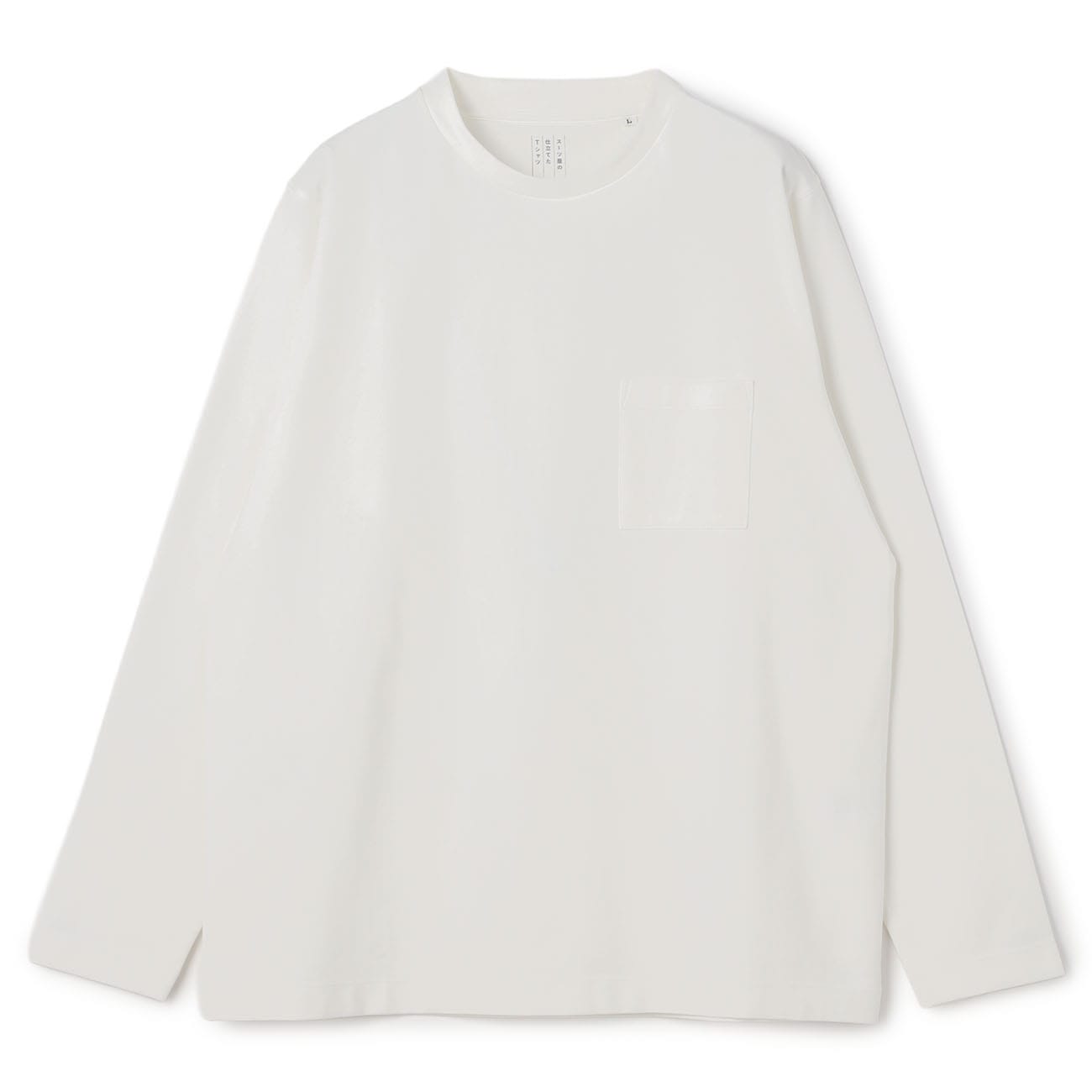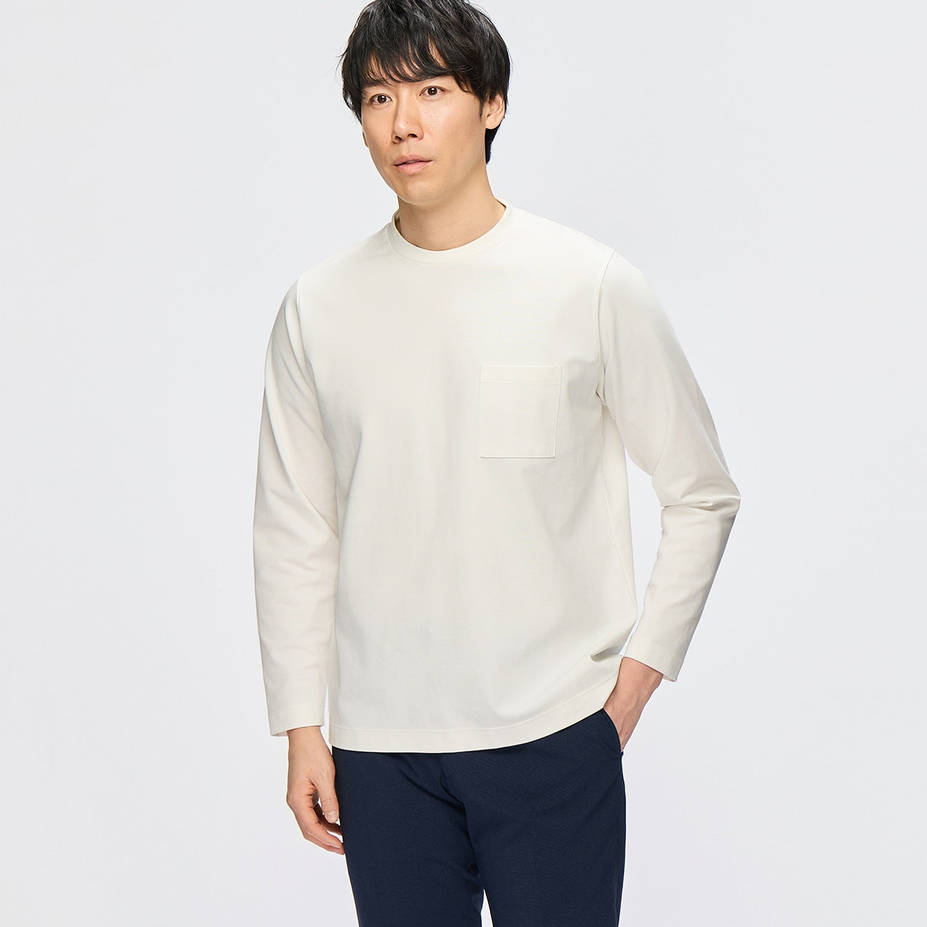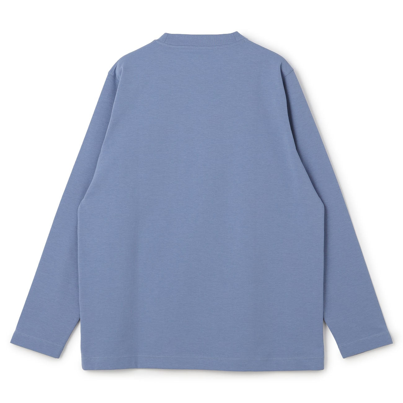 The updated design features no visible stitching on the front neckline and finer twin-needle stitching on the cuffs and hem. These subtle details create a sharp, dressy impression that stands out whether worn alone or as an inner layer.