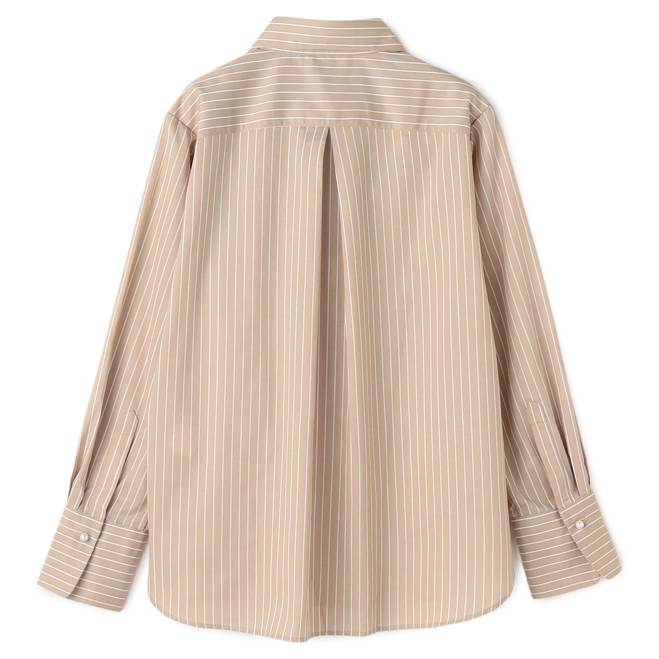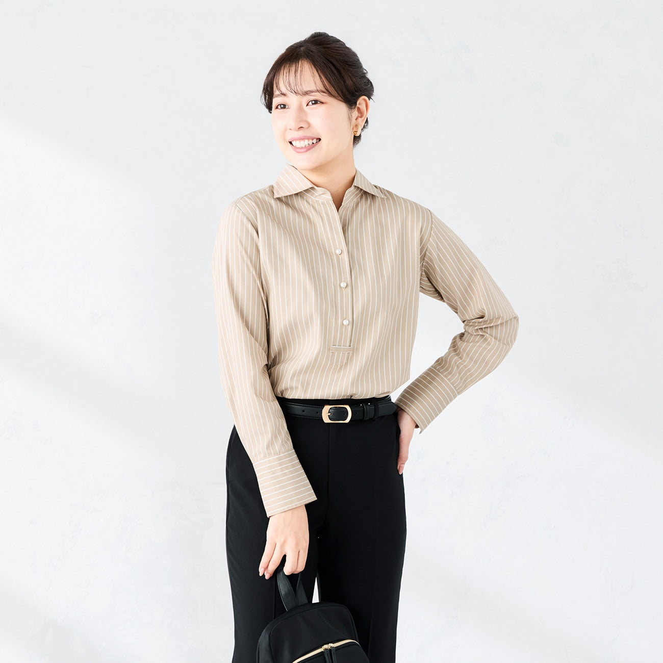Elegant pearl buttons that are neither too small nor too big. The cuffs are switched to a border pattern to add a sharp expression to the hands. The length covering the hips and round hem look stylish whether tucked in or out.