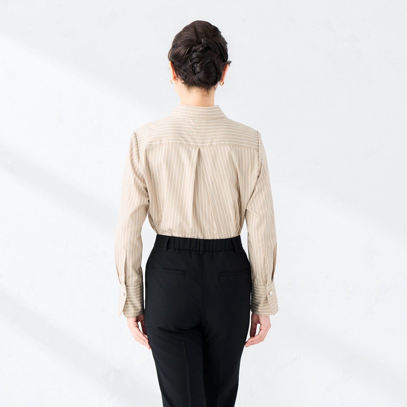大小恰到好處的珍珠扣,搭配袖口變換角度的條紋設計,為上班襯衫增添優美細節。襯衫衣長可紮、露出下擺也顯得俐落有型。