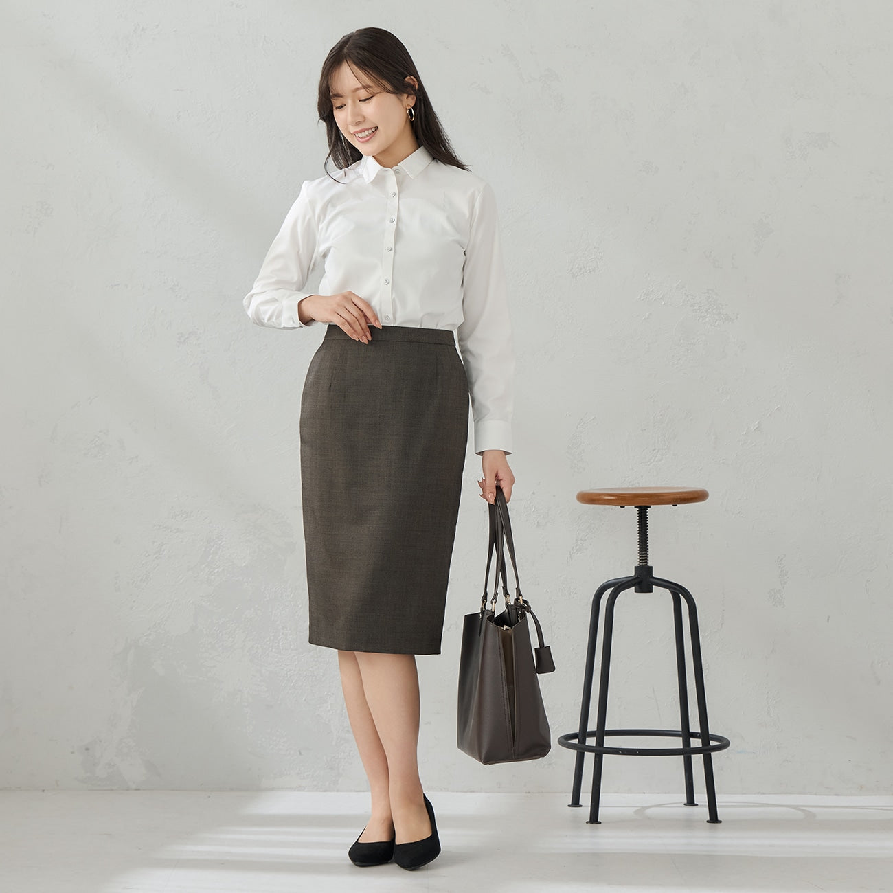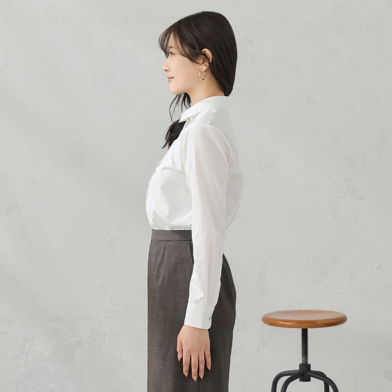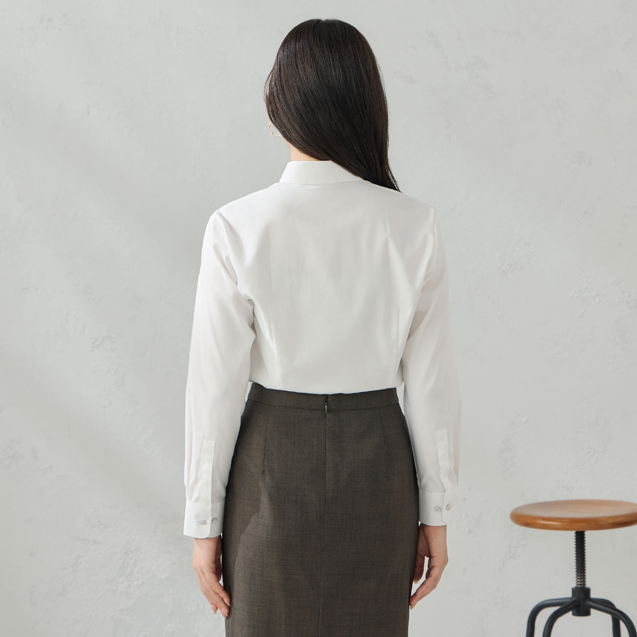 經典白襯衫採用梭織紋布料,展現精緻細節。無背摺,整體輪廓更俐落。胸前有隱藏式鈕扣,不擔心走光。