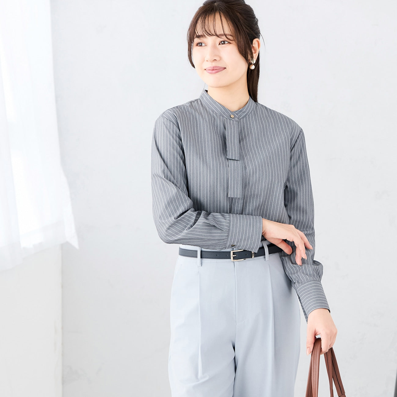 優雅辦公穿搭,金屬扣小領結設計上衣