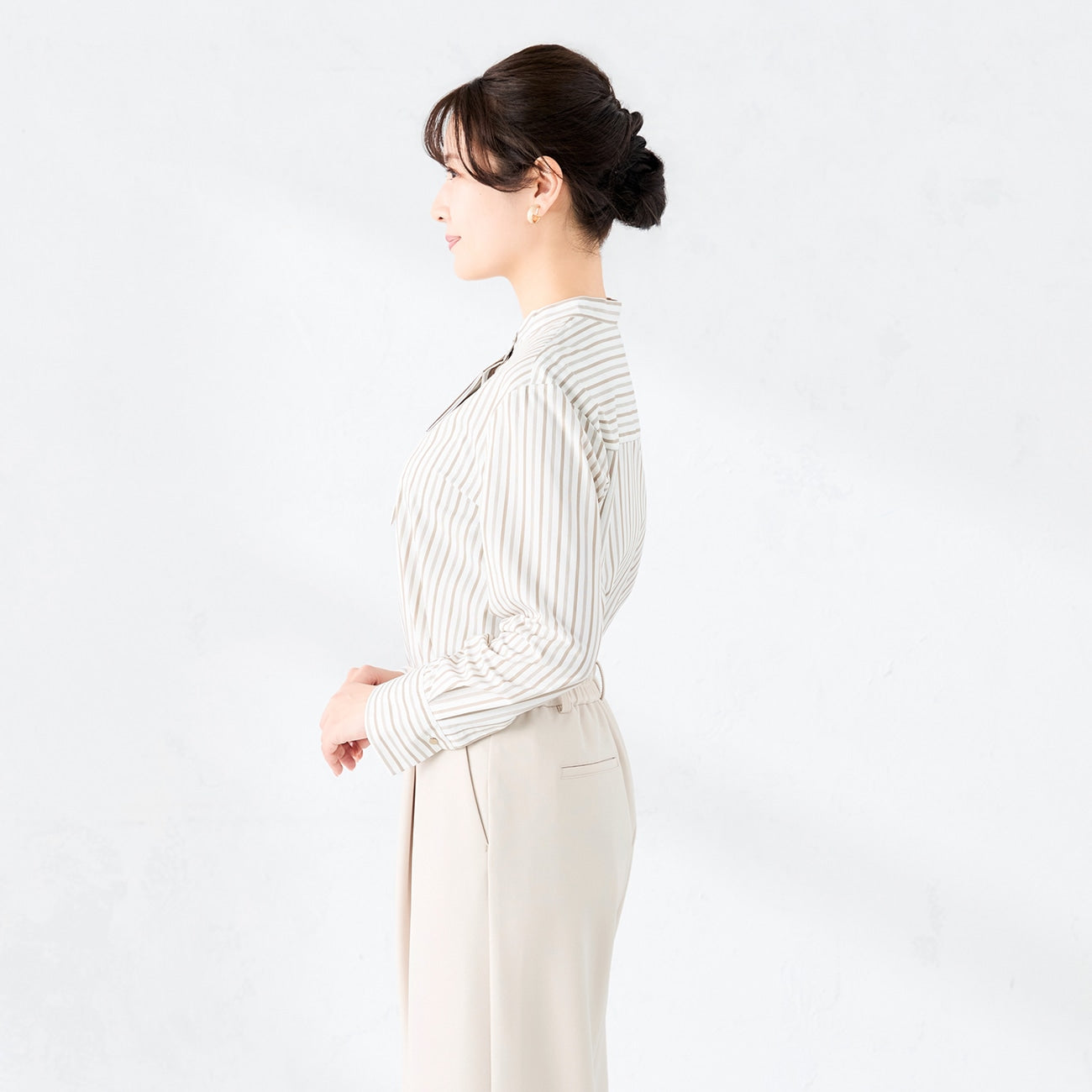 A refined band collar blouse that creates a sleek, elongating silhouette.