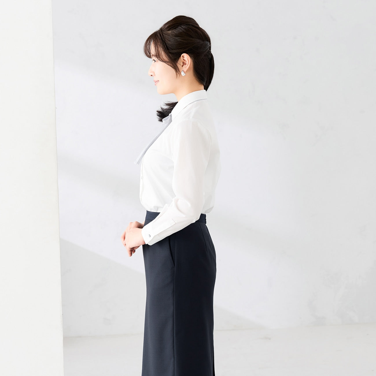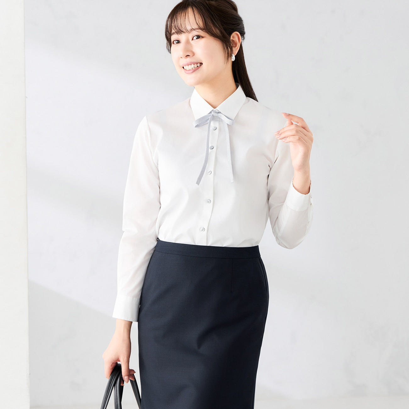 素面白色标准领衬衫搭配细条纹缎带,可随时变换风格。系上增添华美气息,拆下则展现专业俐落造型,面试、商务多场合适用。