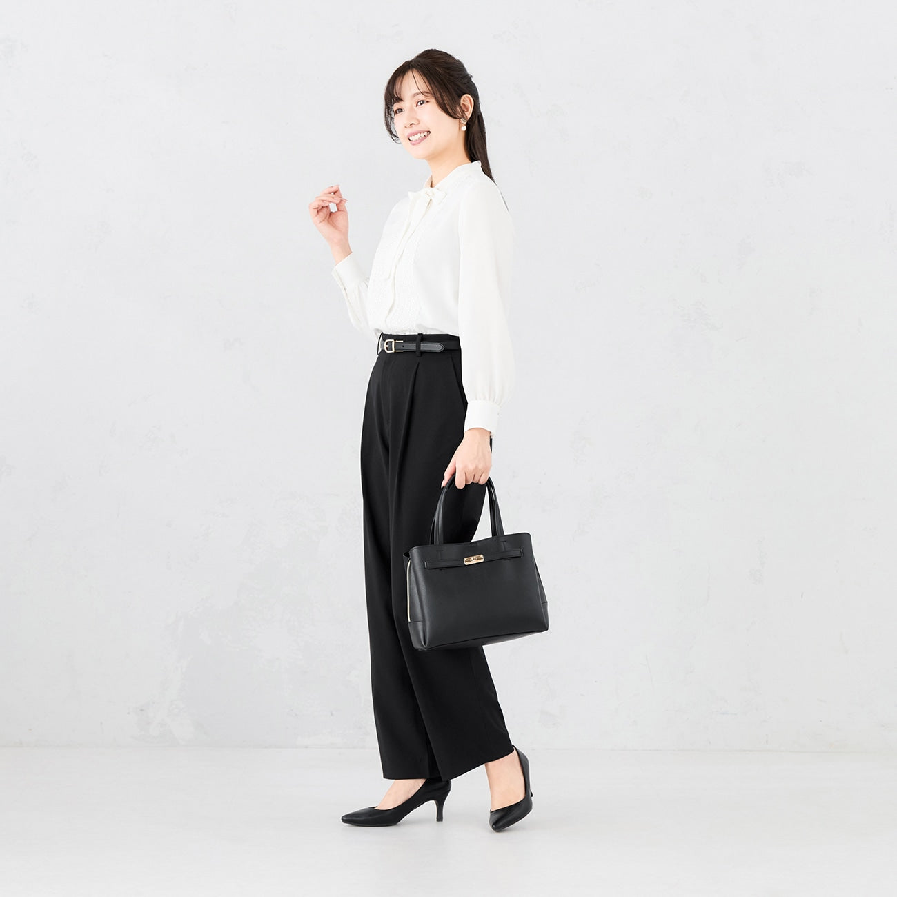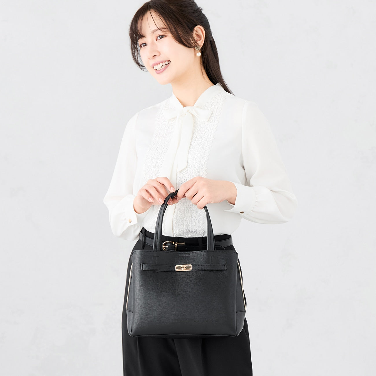 Square form with a sense of properness. Front belt & turn lock metal fittings add luxury. Excellent item that matches widely from suit style to holiday clean coordination and occasions.
