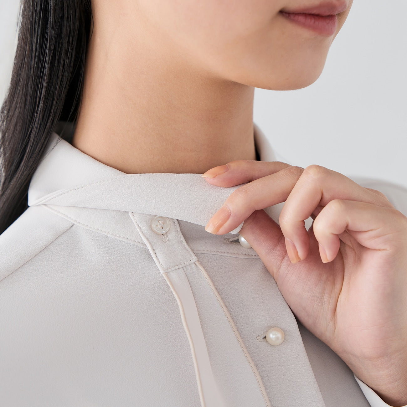Front body and cuffs buttons are elegant pearl buttons. Calculated length and silhouette that looks good whether tucked in or out.