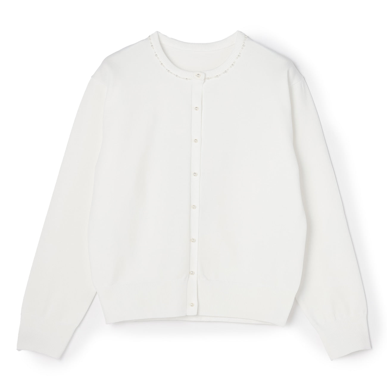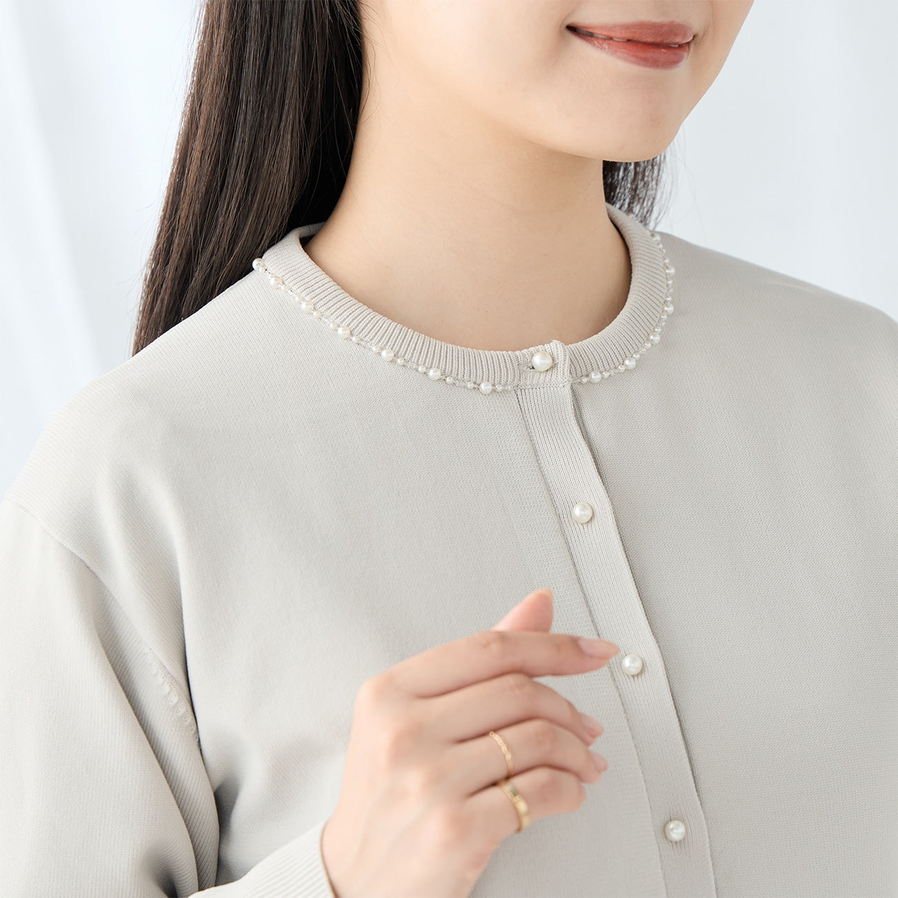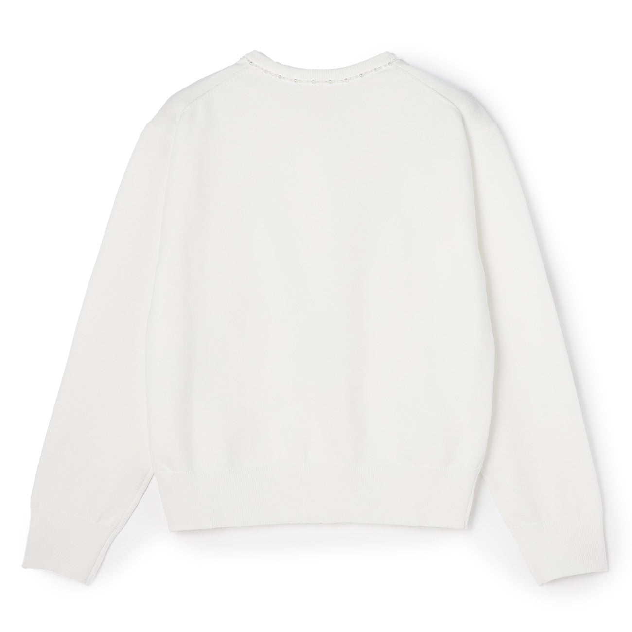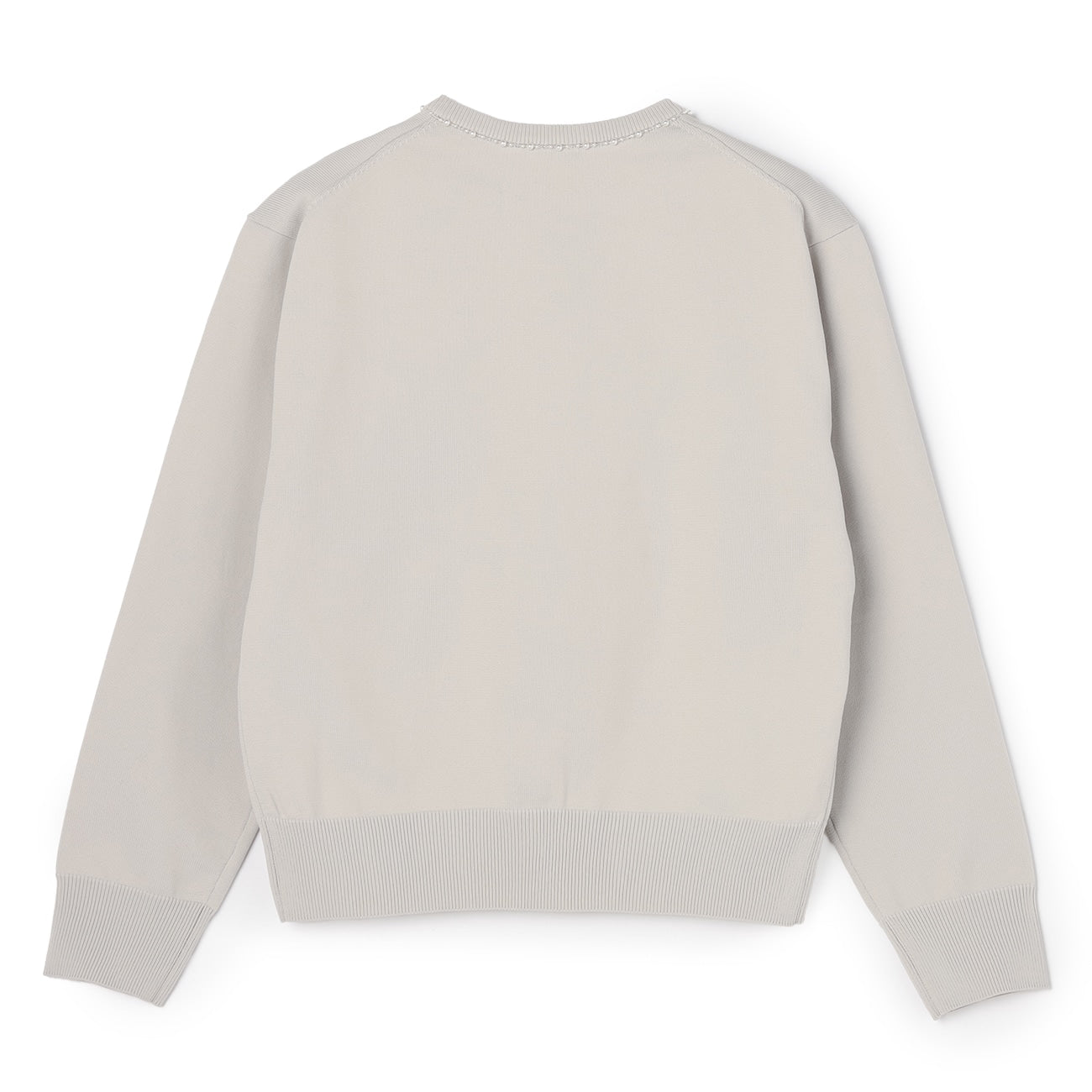頸部鑲有迷人的珠子和珍珠。寬鬆的剪裁創造出美麗的輪廓。平滑厚實的針織材質提供適度保暖,適合長季節穿著。