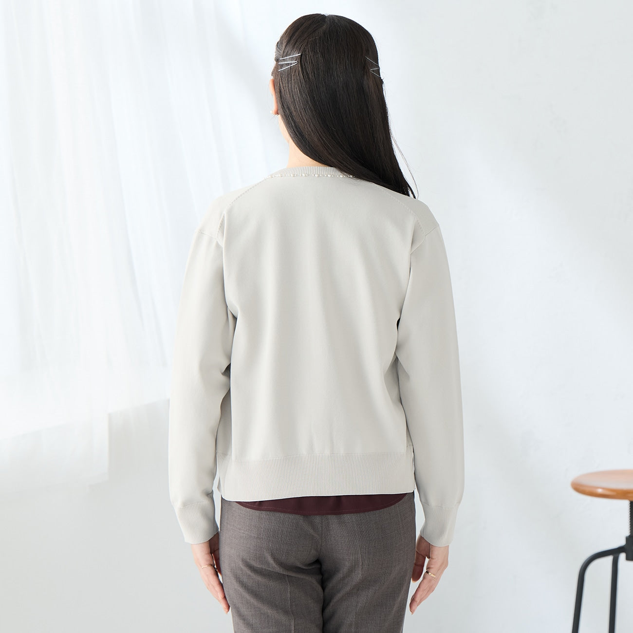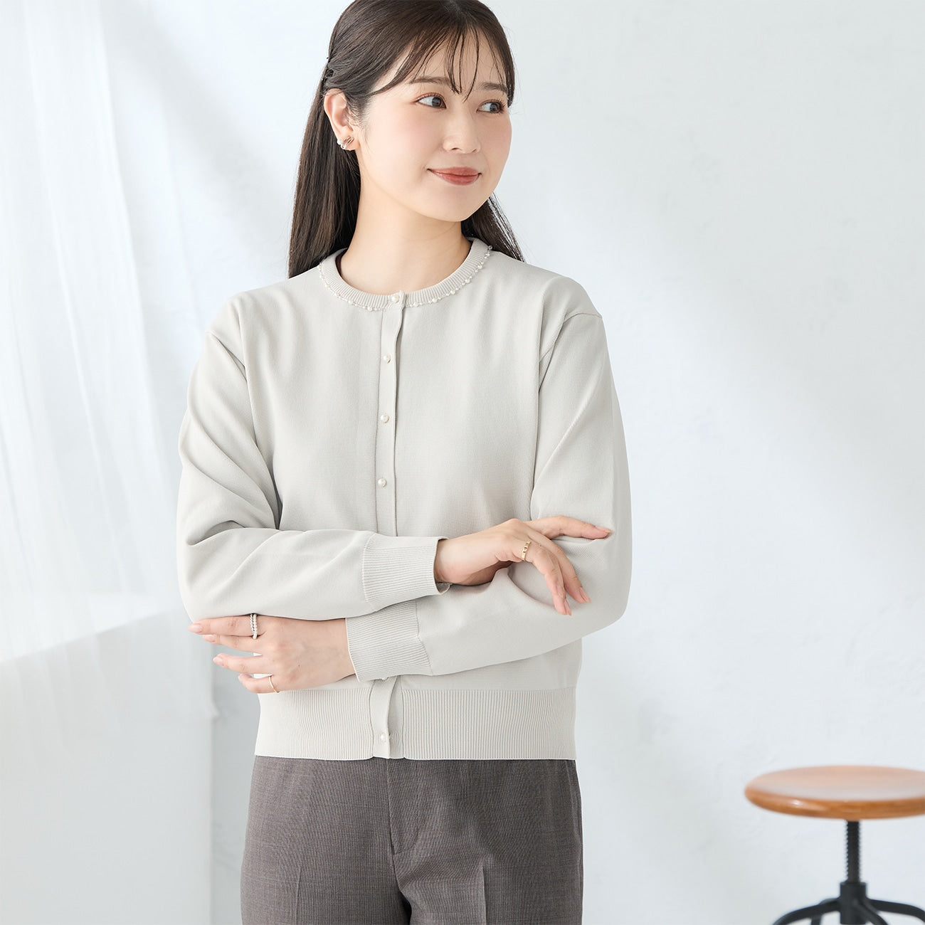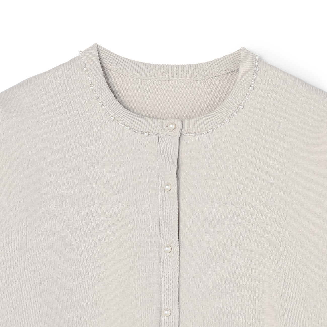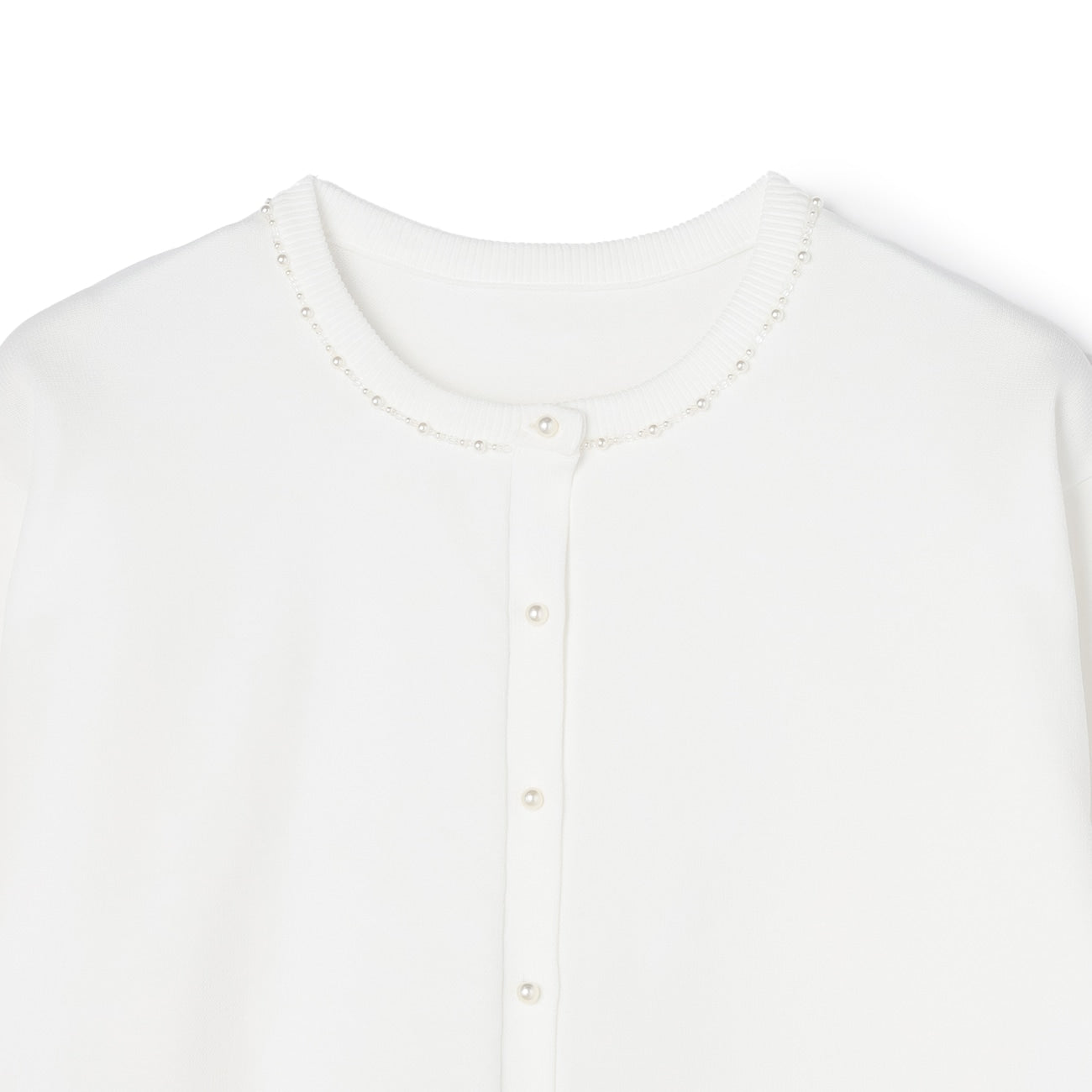 頸部鑲有迷人的珠子和珍珠。寬鬆的剪裁創造出美麗的輪廓。平滑厚實的針織材質提供適度保暖,適合長季節穿著。