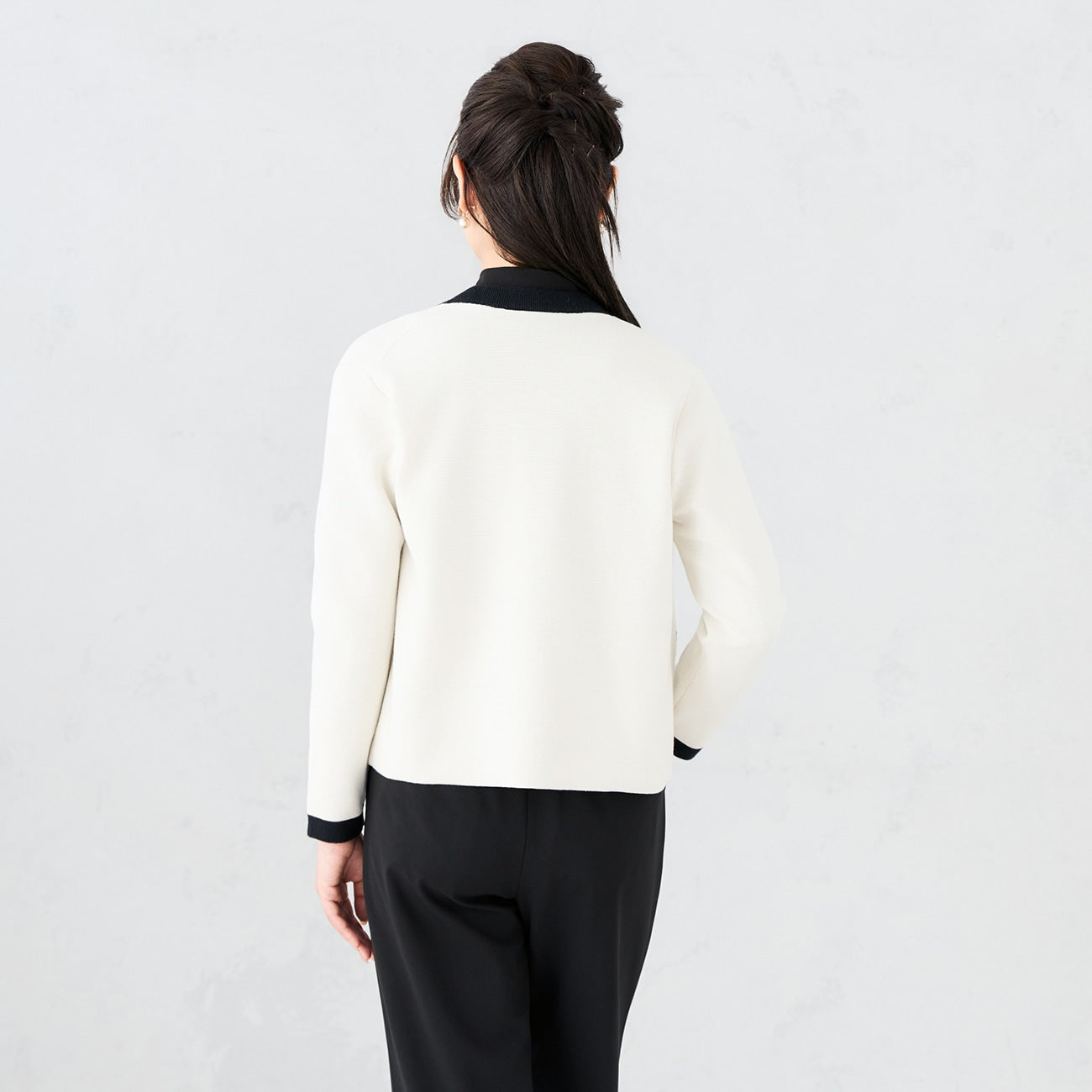 Crafted from a smooth silk blend with a subtle sheen, this seasonless piece features a flattering boxy silhouette with moderate structure that conceals body lines, highlighted by a sophisticated bicolor design and contrasting buttons.