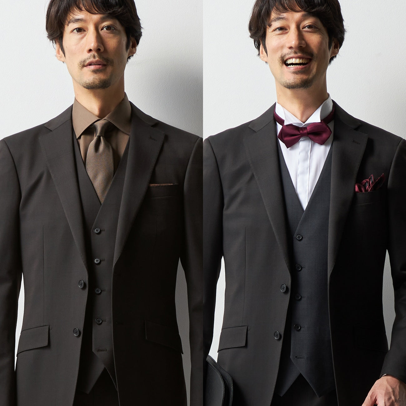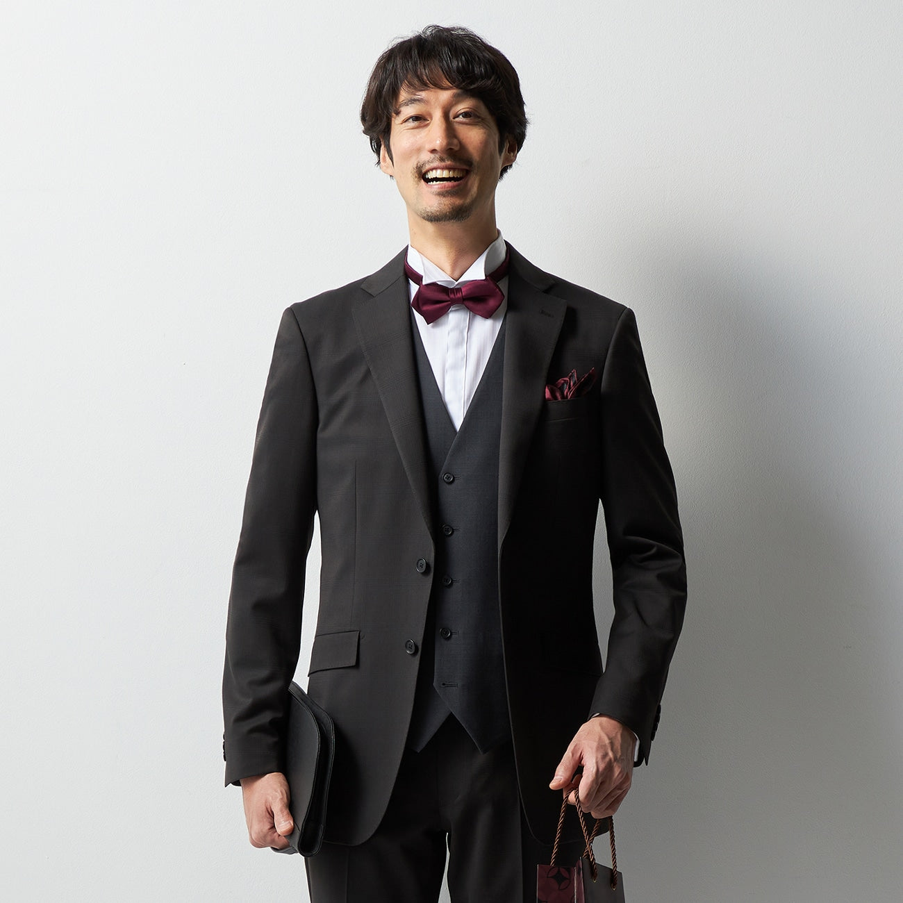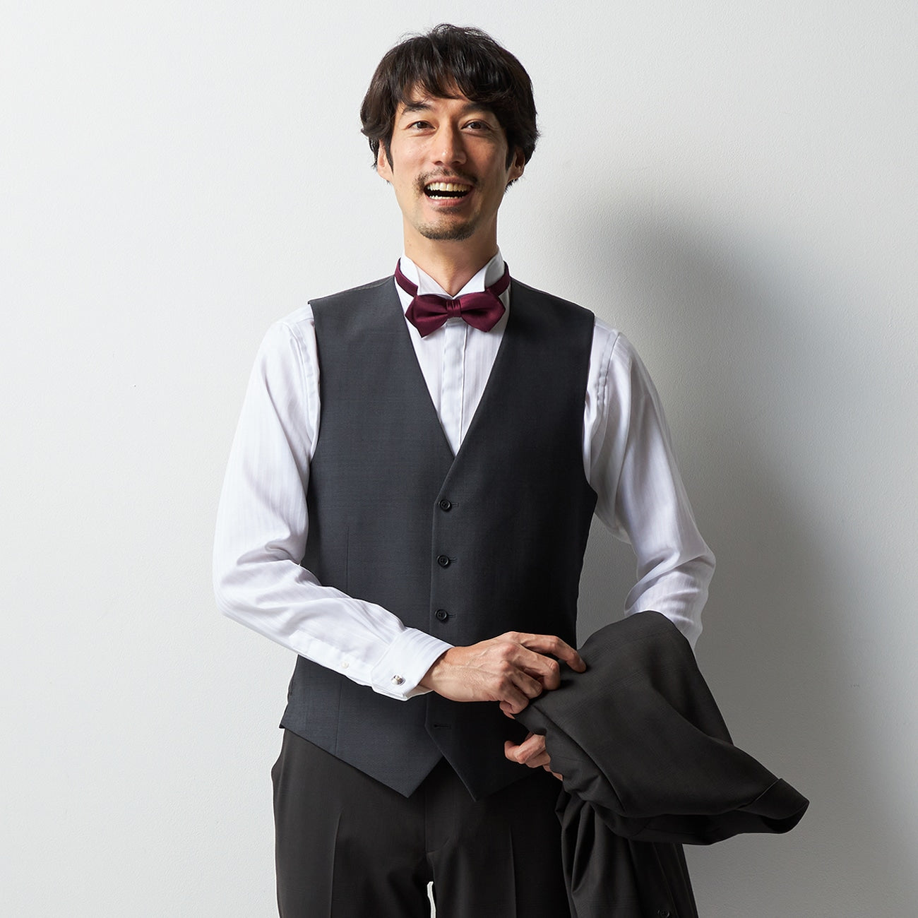 多功能三件式混紡羊毛西裝,附可反穿背心及腰部調節帶。