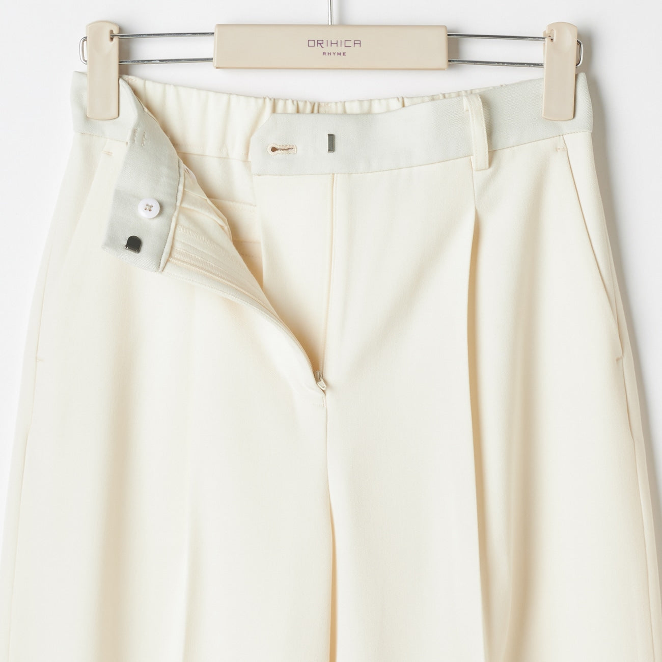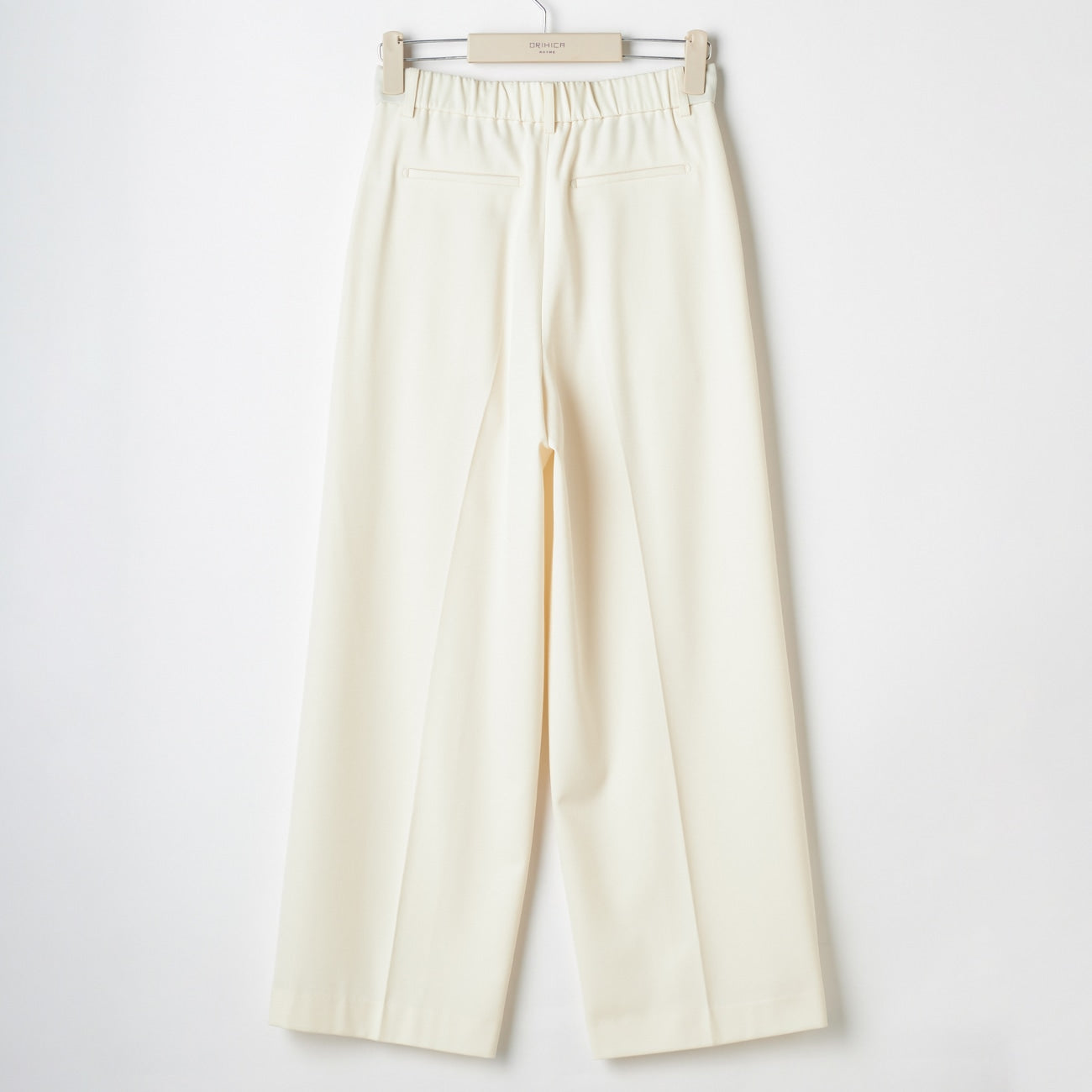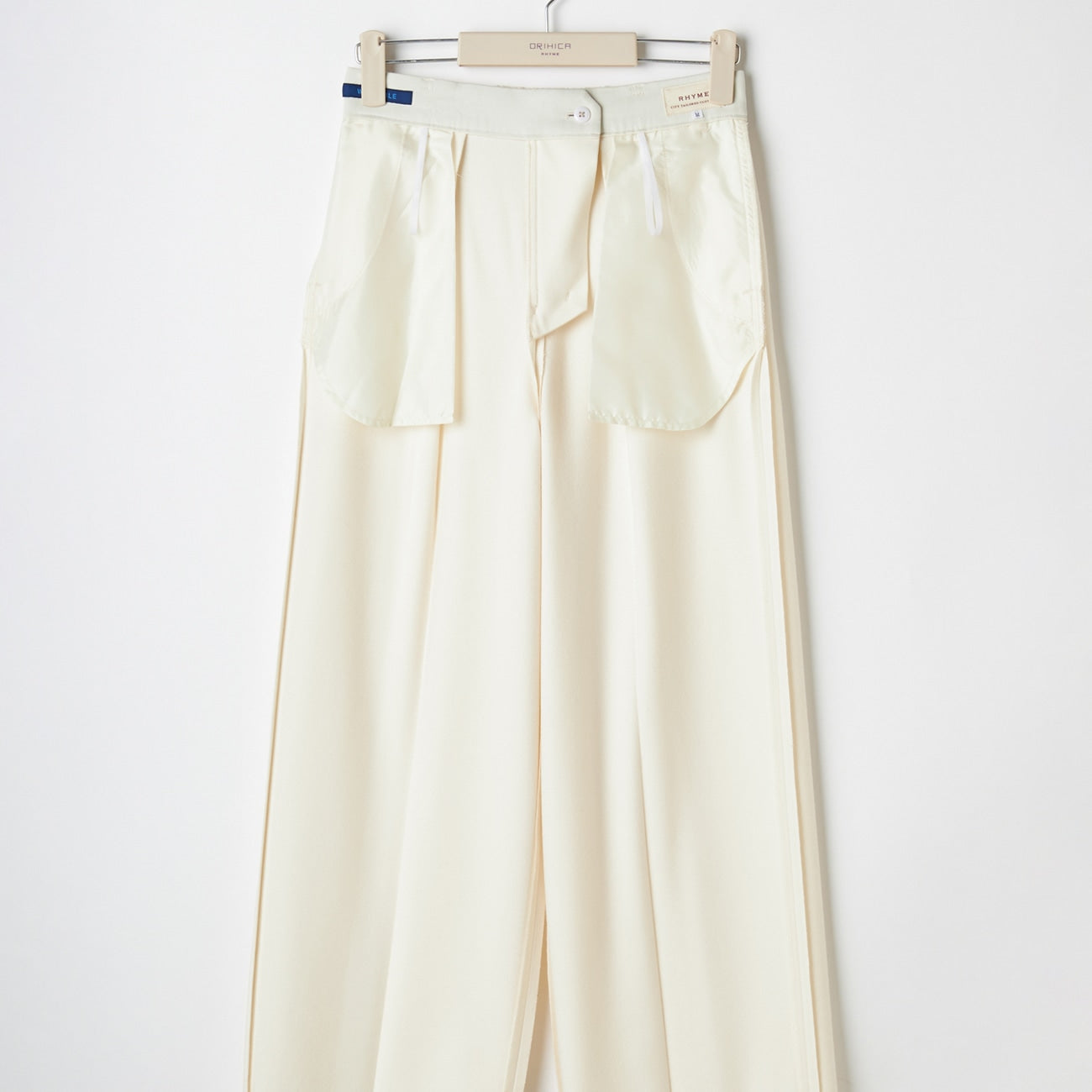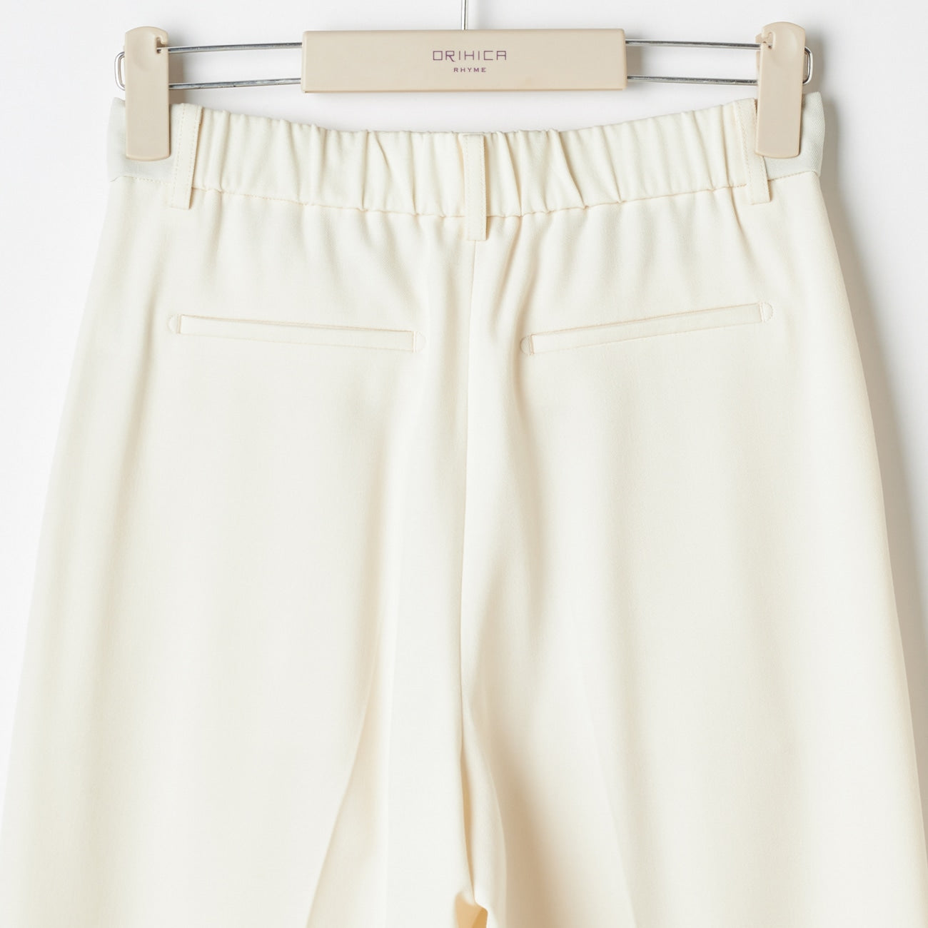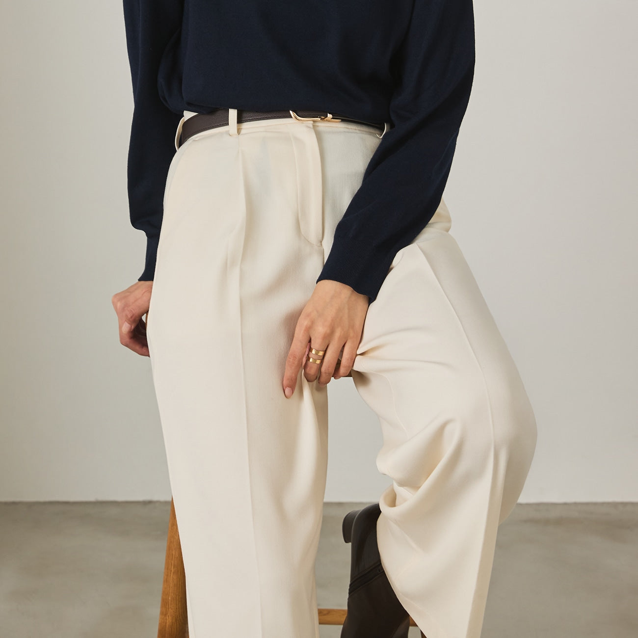 - 高腰設計從腰部至下襬視覺上拉長腿部。中間的壓線與直挺的針腳強調中線,創造出額外的腿部拉長效果。