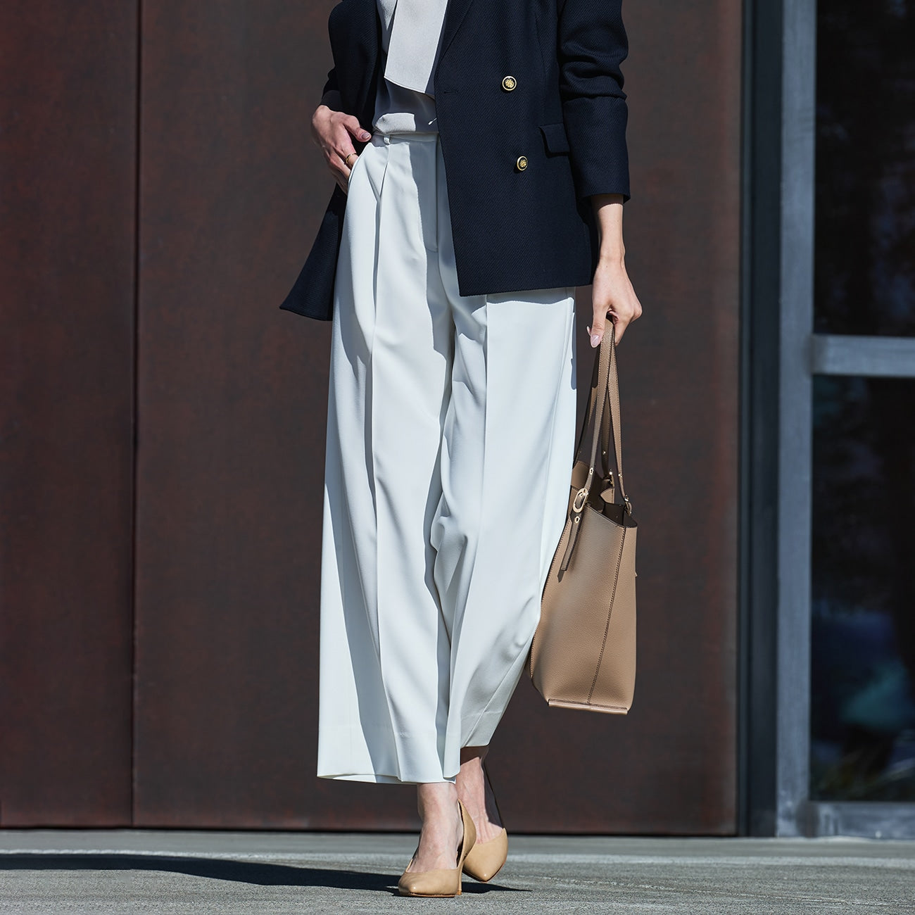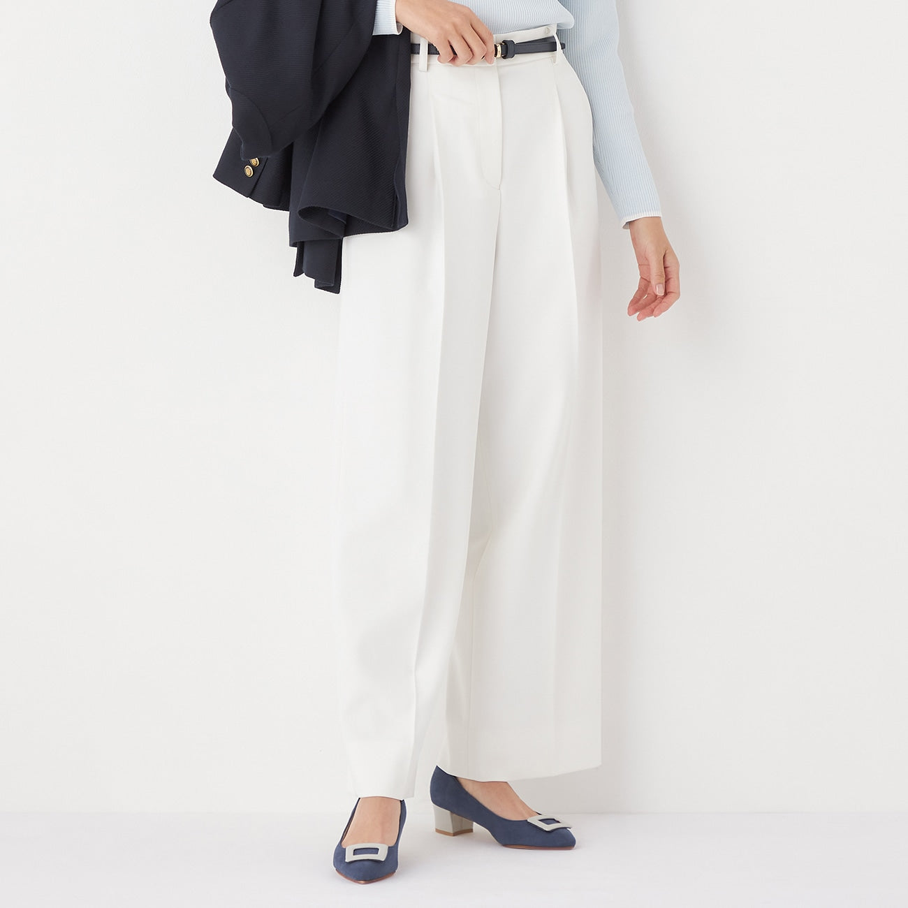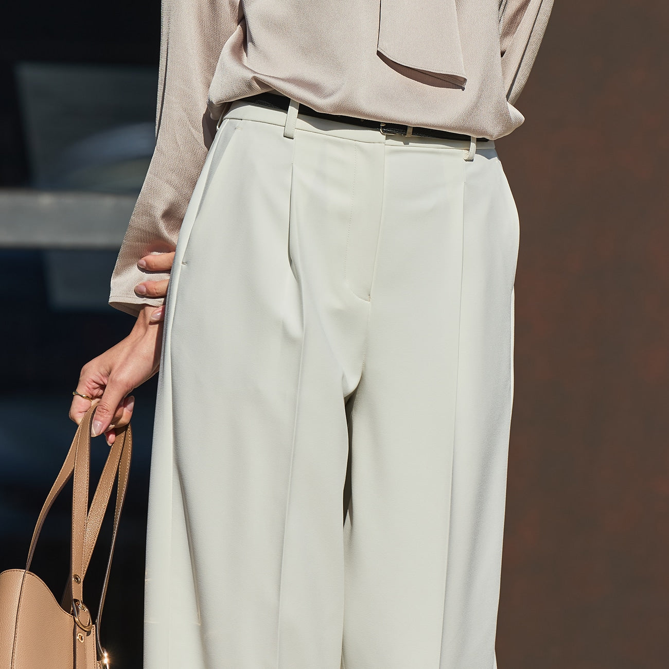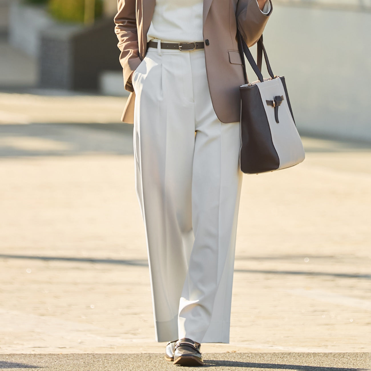 ・寬褲幅度略窄,營造俐落輪廓。