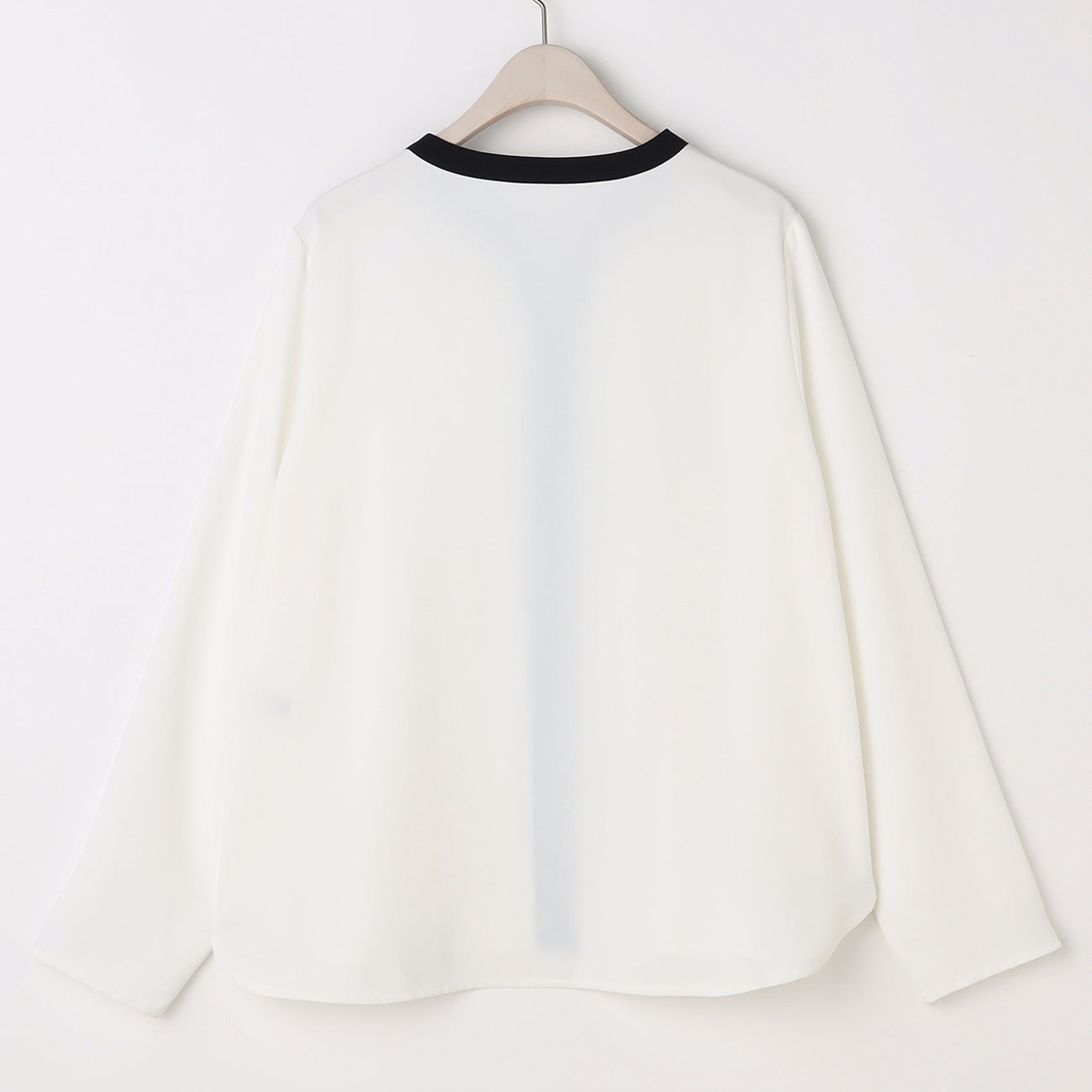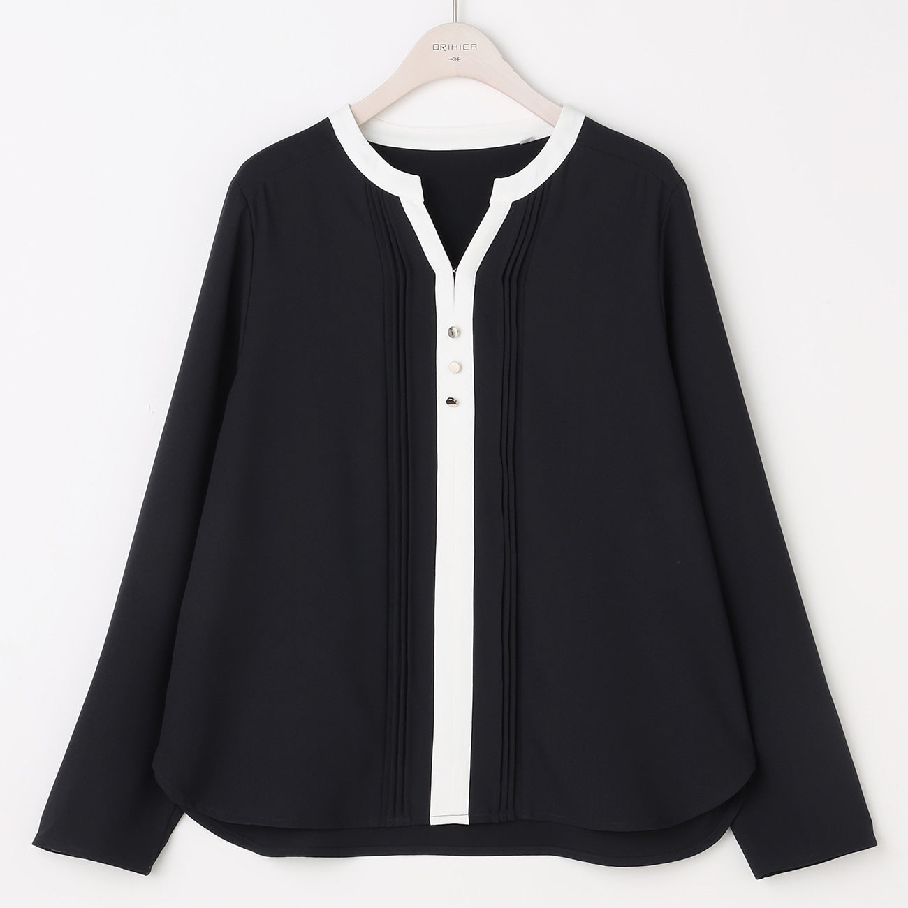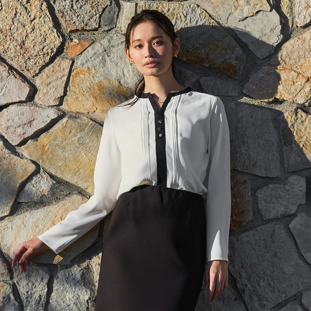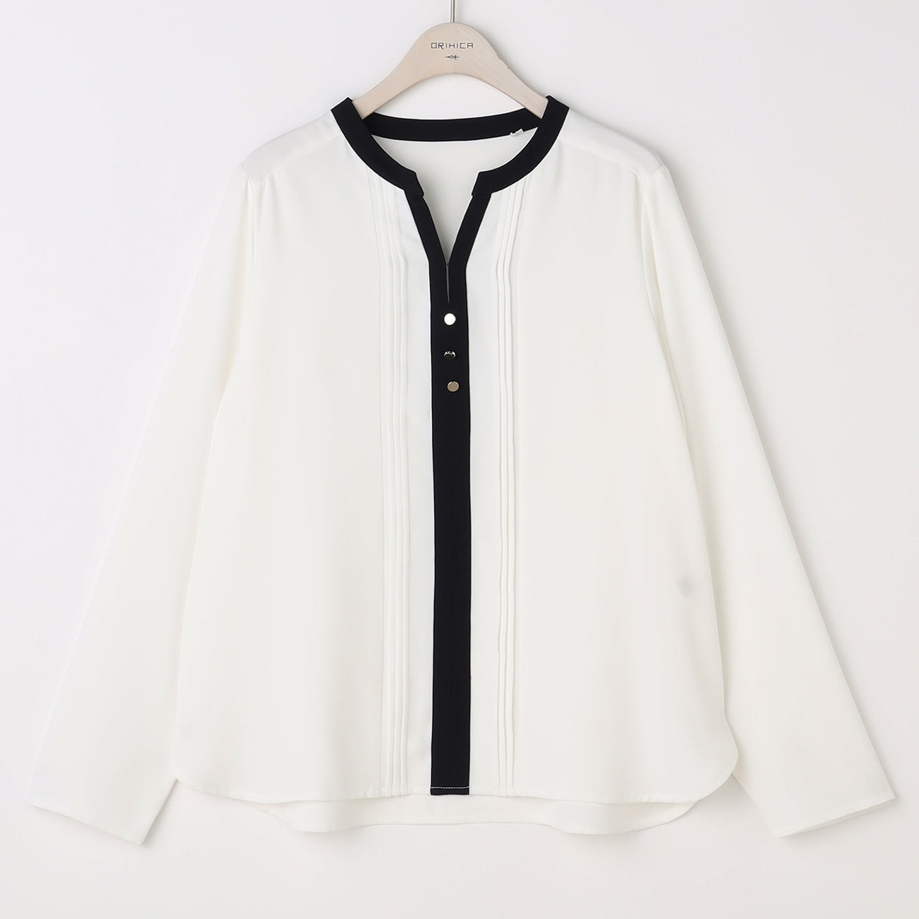 Sophisticated keyneck blouse with contrasting trim, ideal for professional settings.