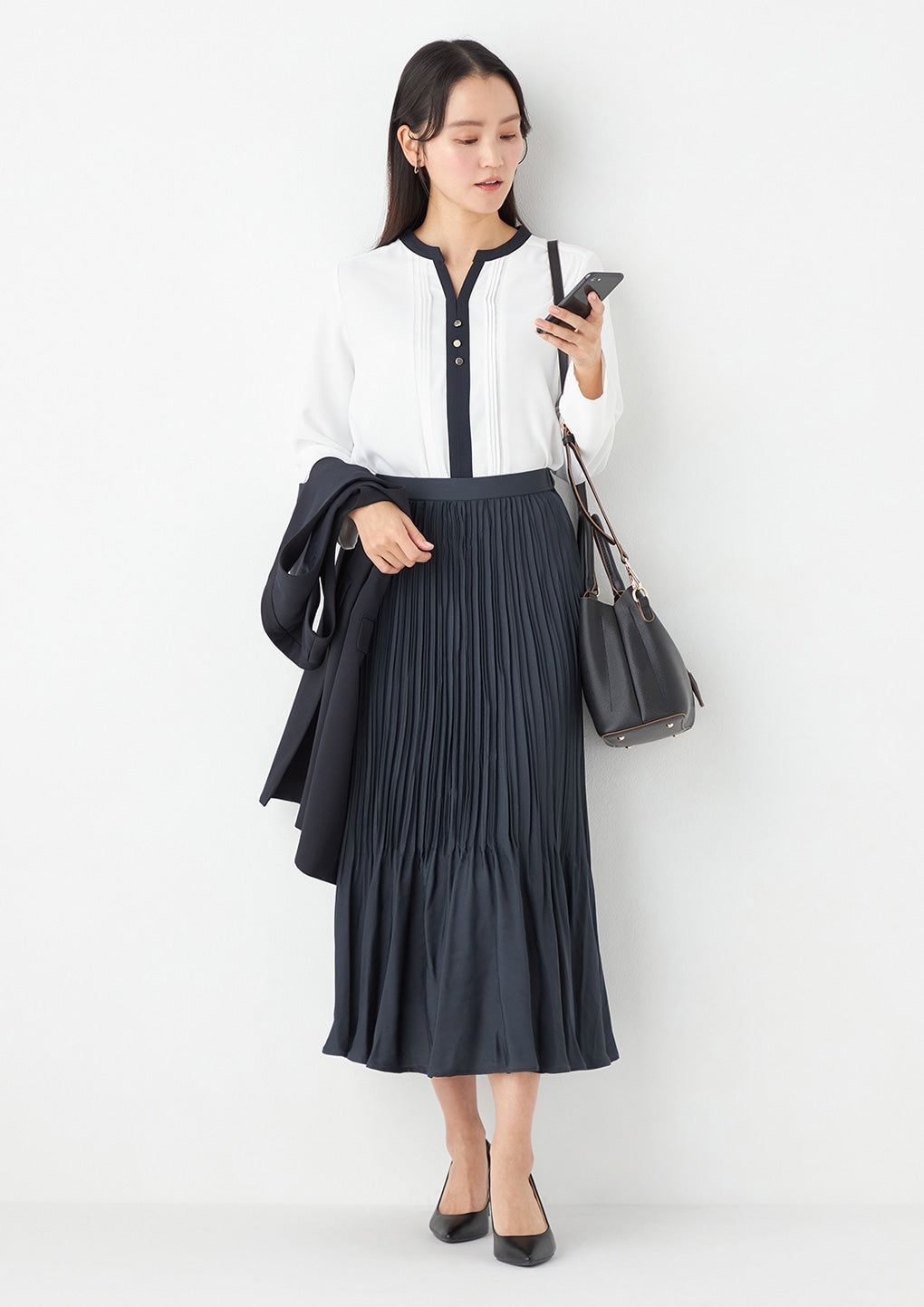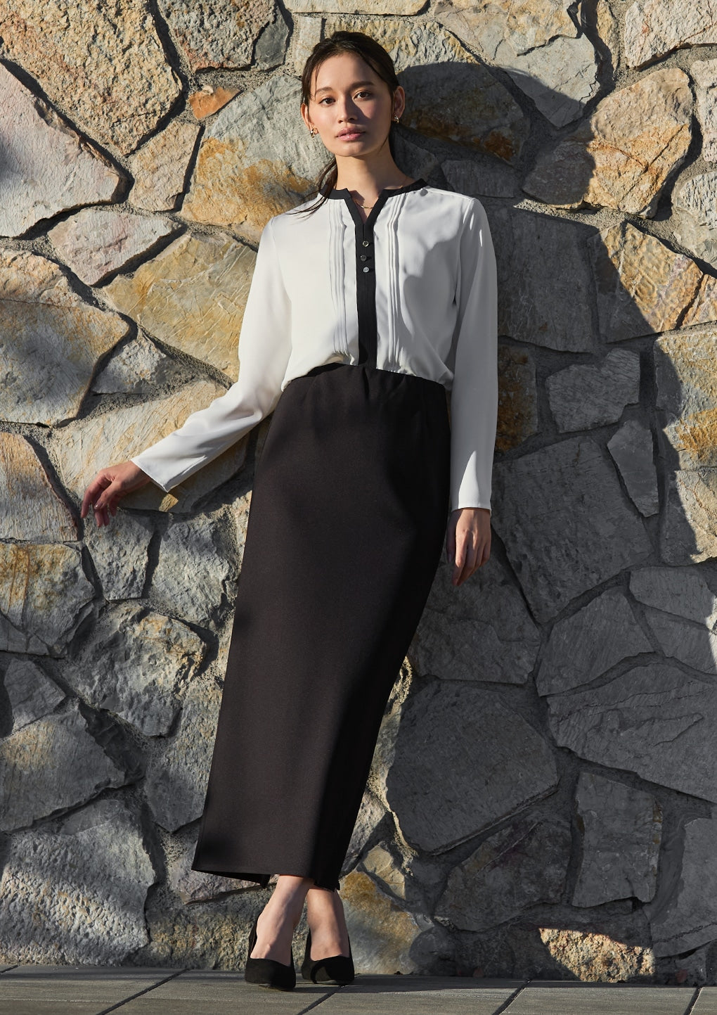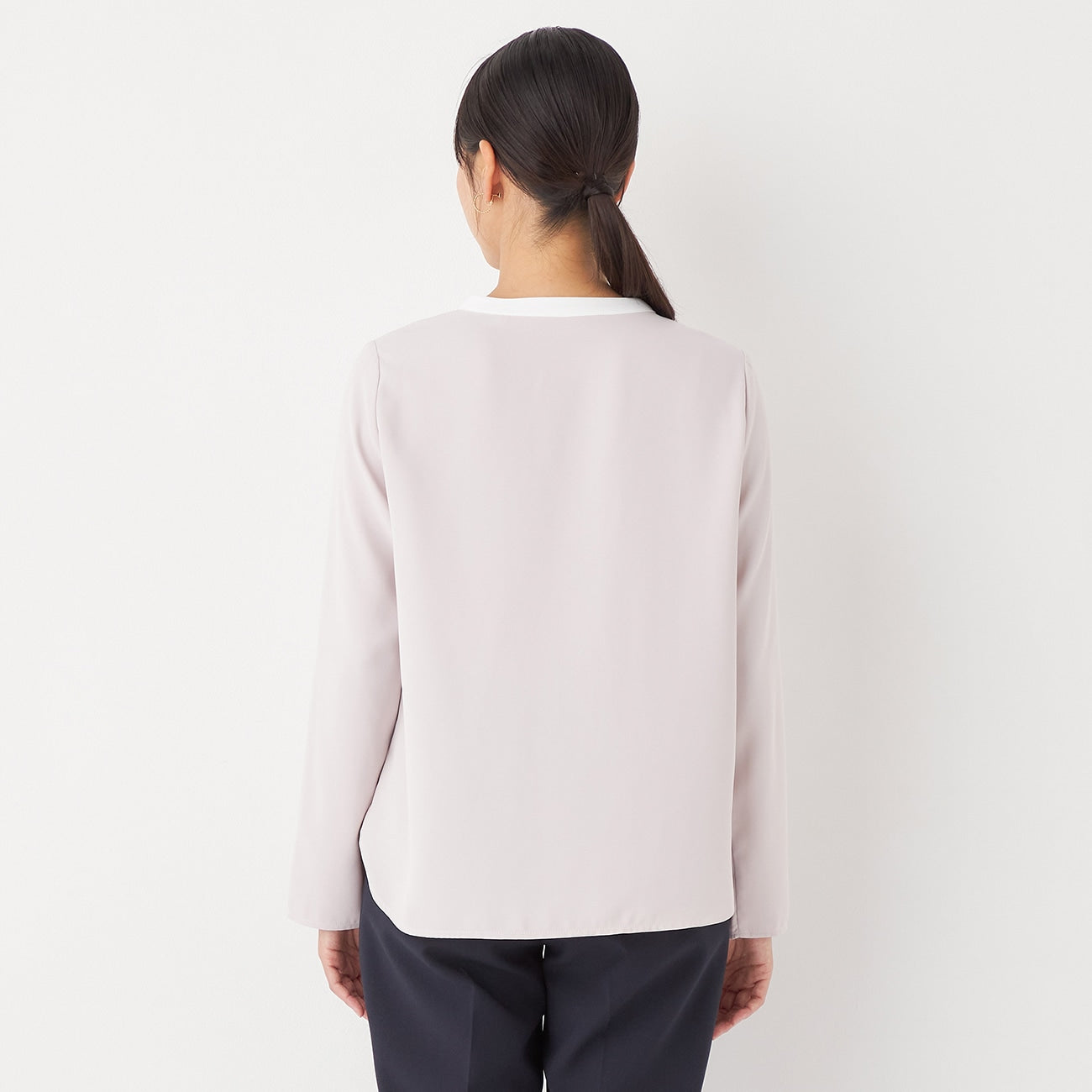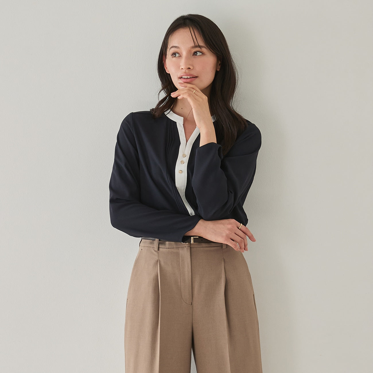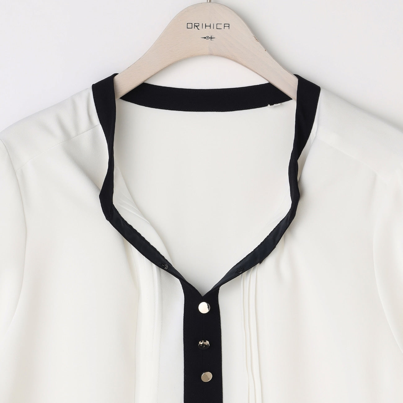 Sophisticated keyneck blouse with contrasting trim, ideal for professional settings.