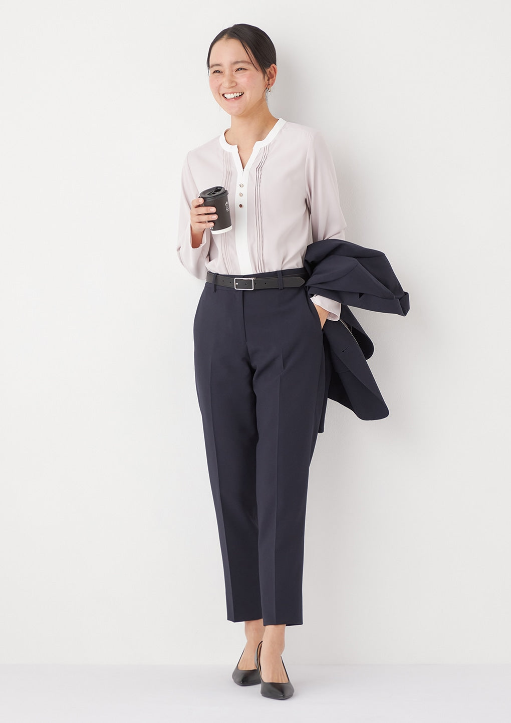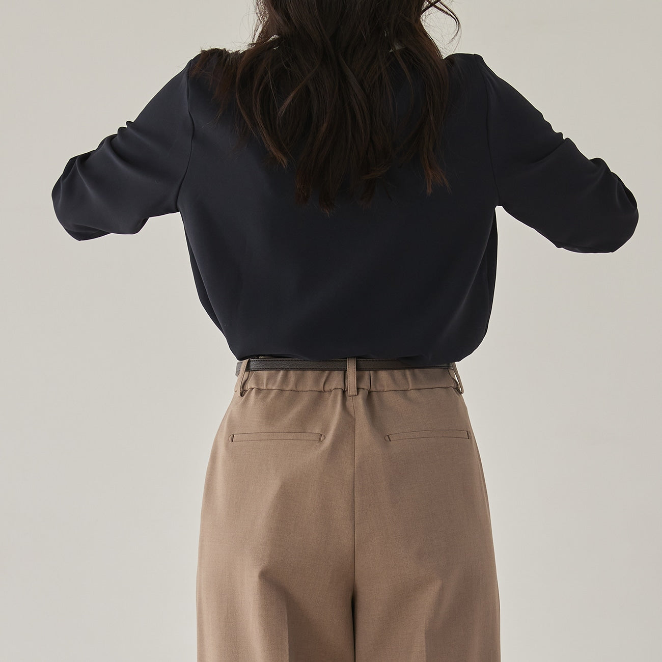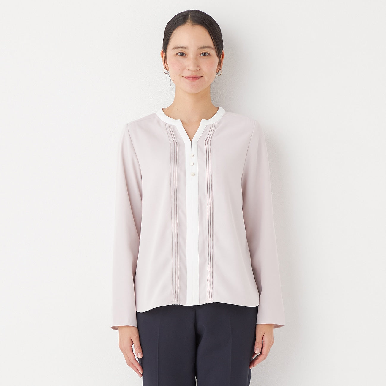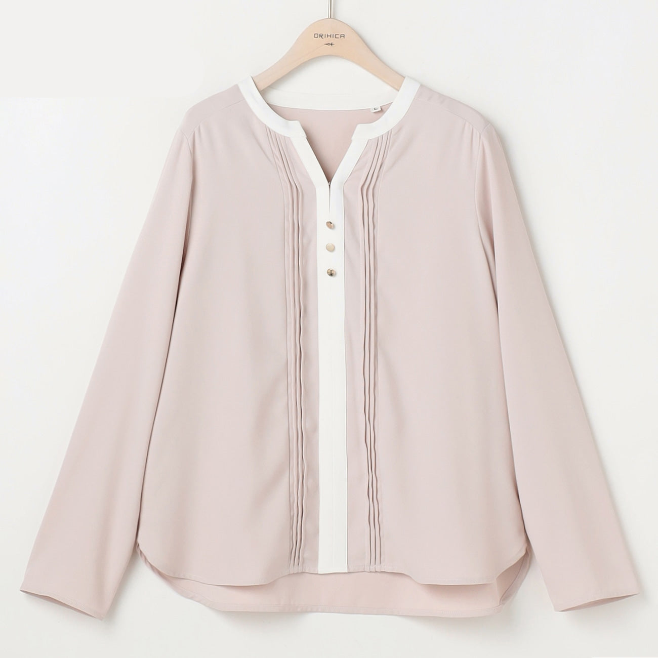 Sophisticated keyneck blouse with contrasting trim, ideal for professional settings.