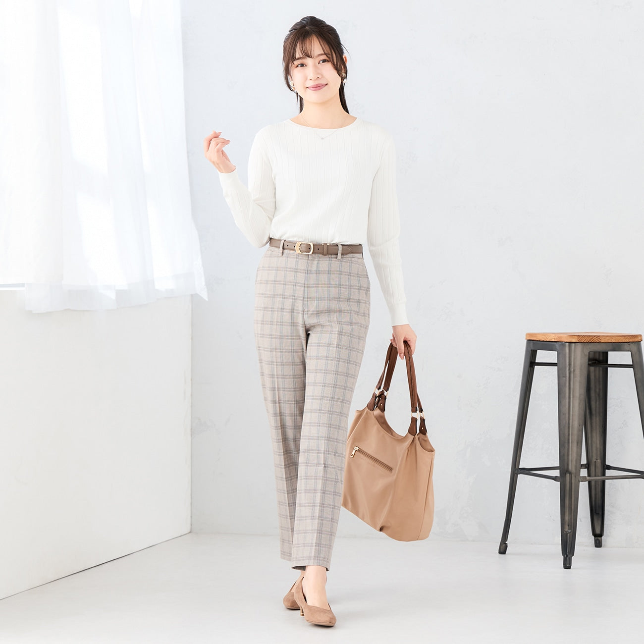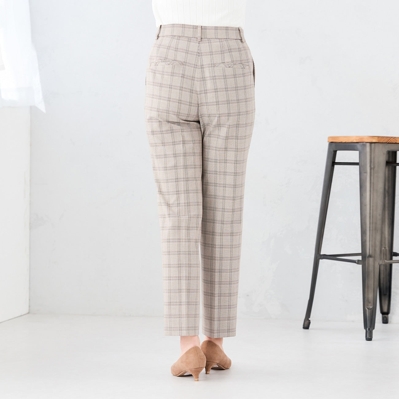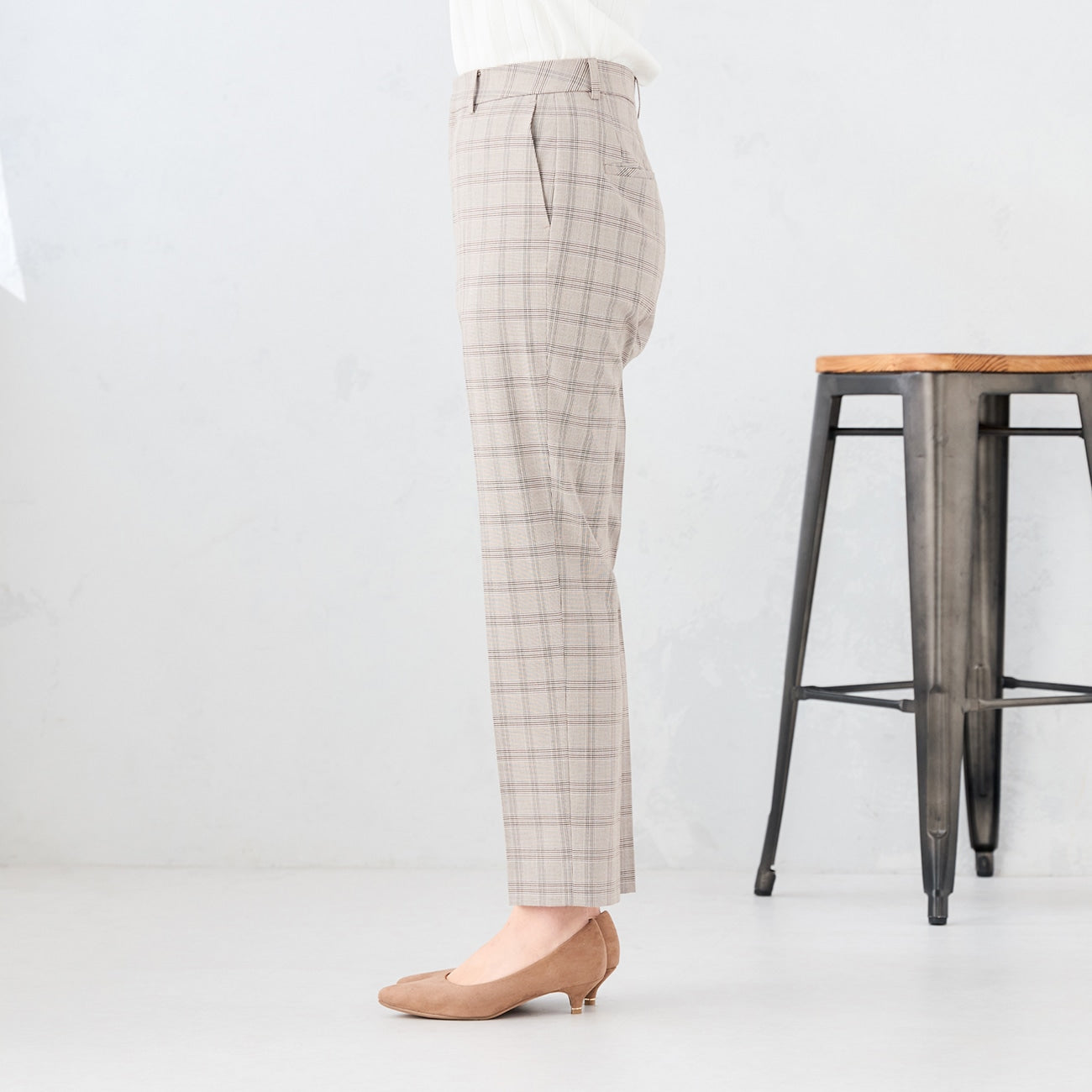弹力格纹直筒西装裤 灰米