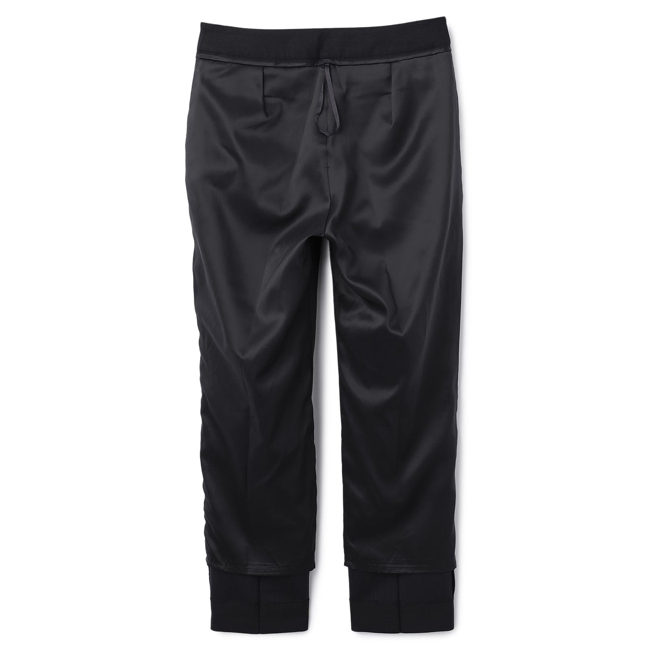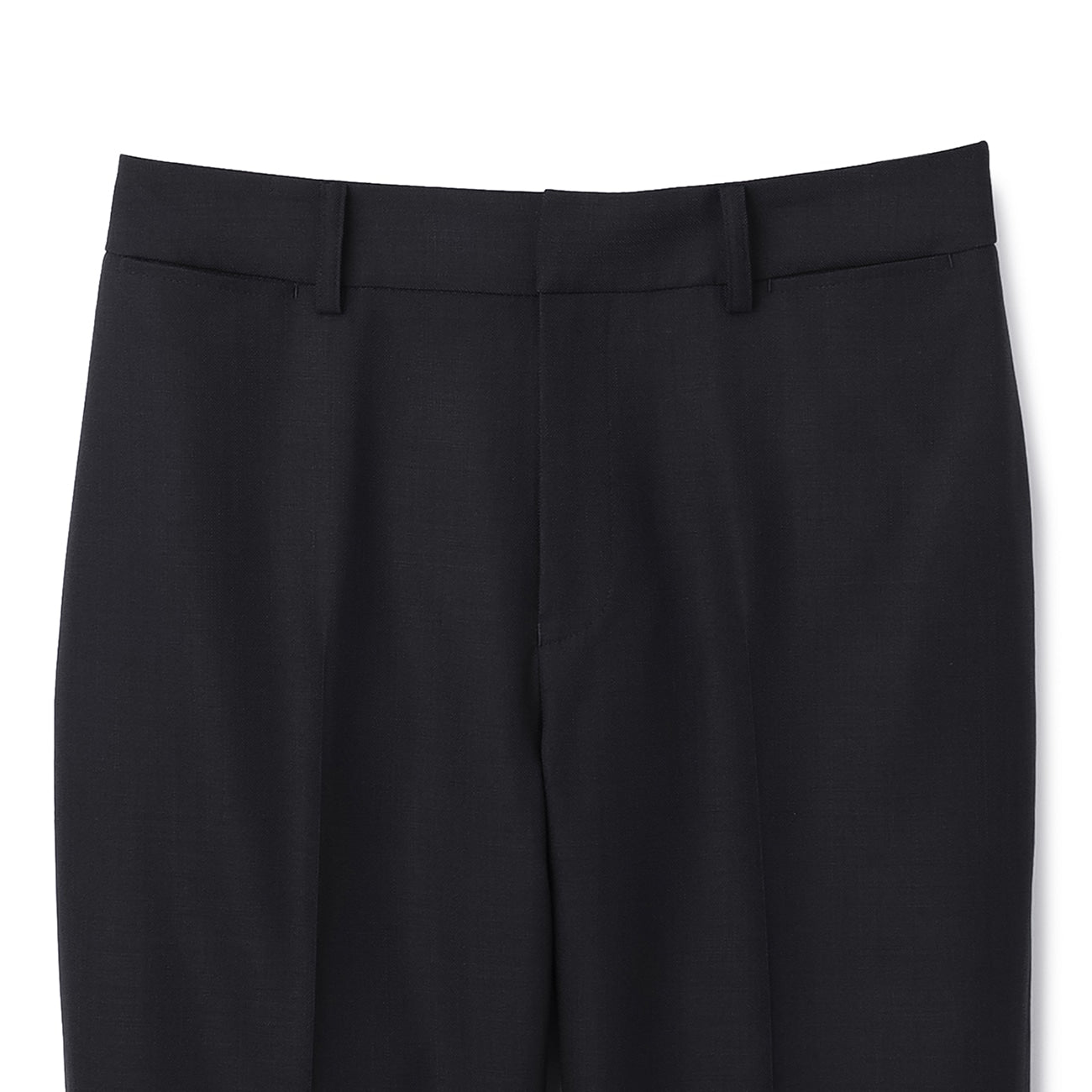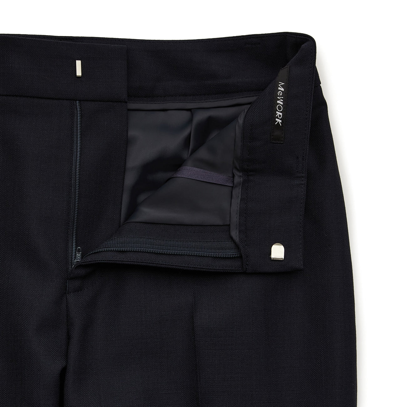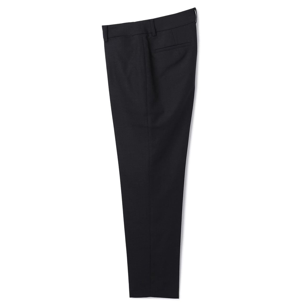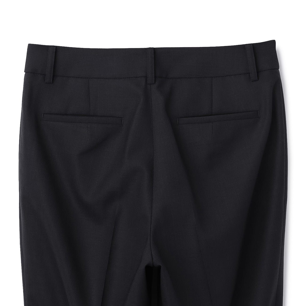 九分西装裤、裤脚已包边、有衬里、腰部与后臀有口袋