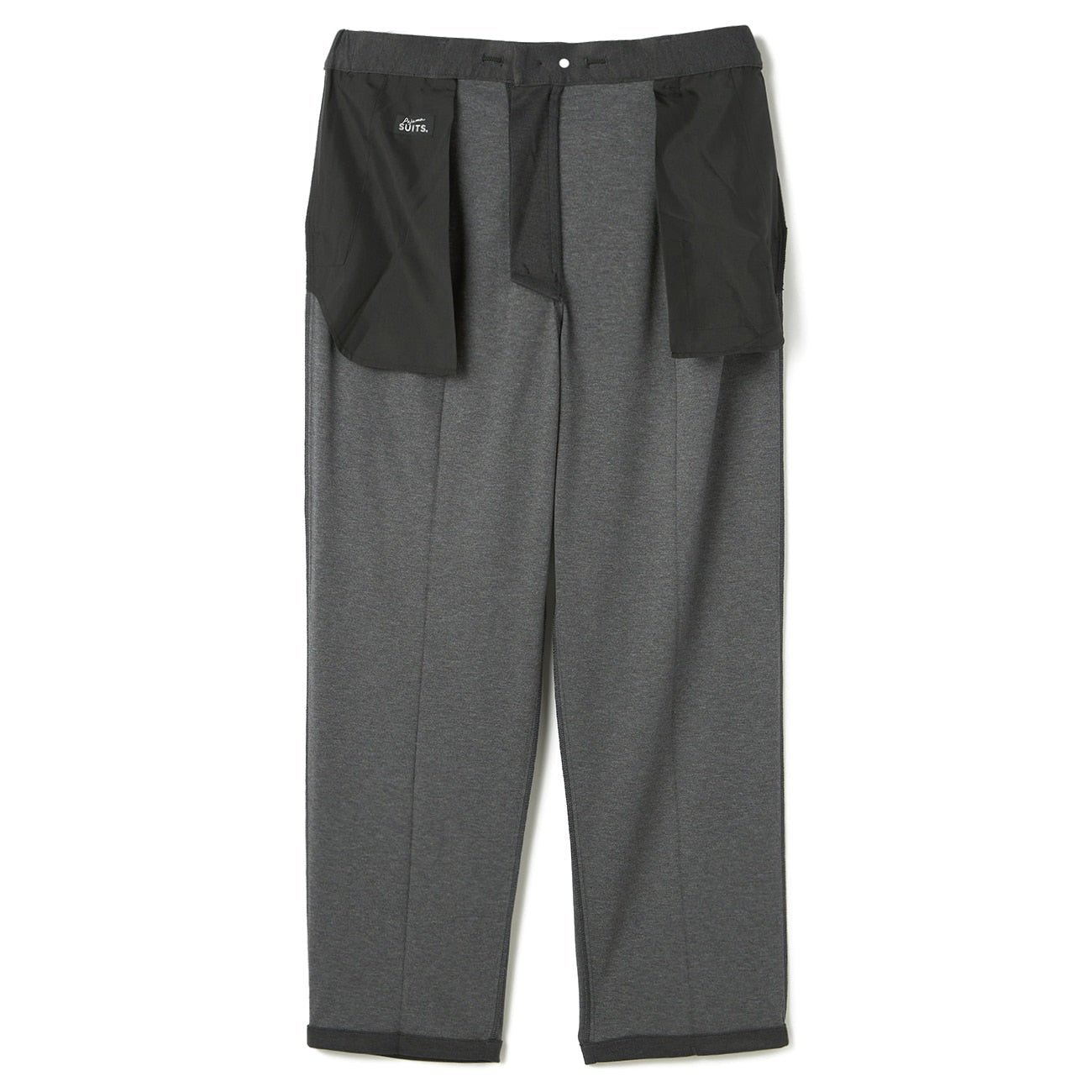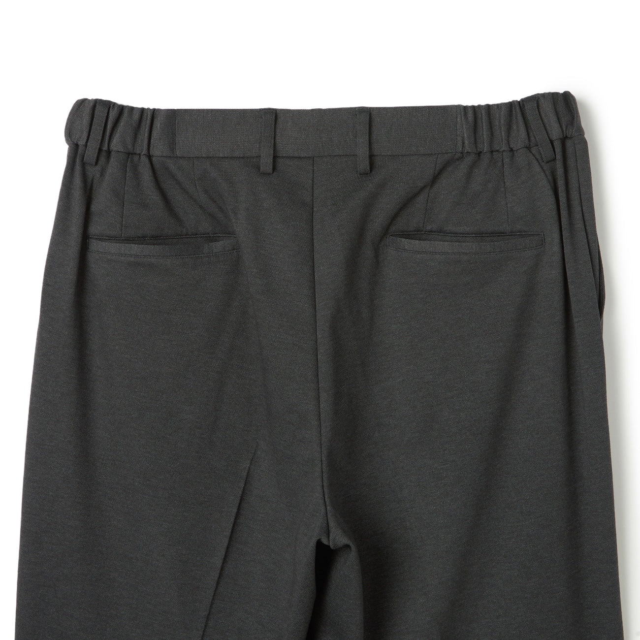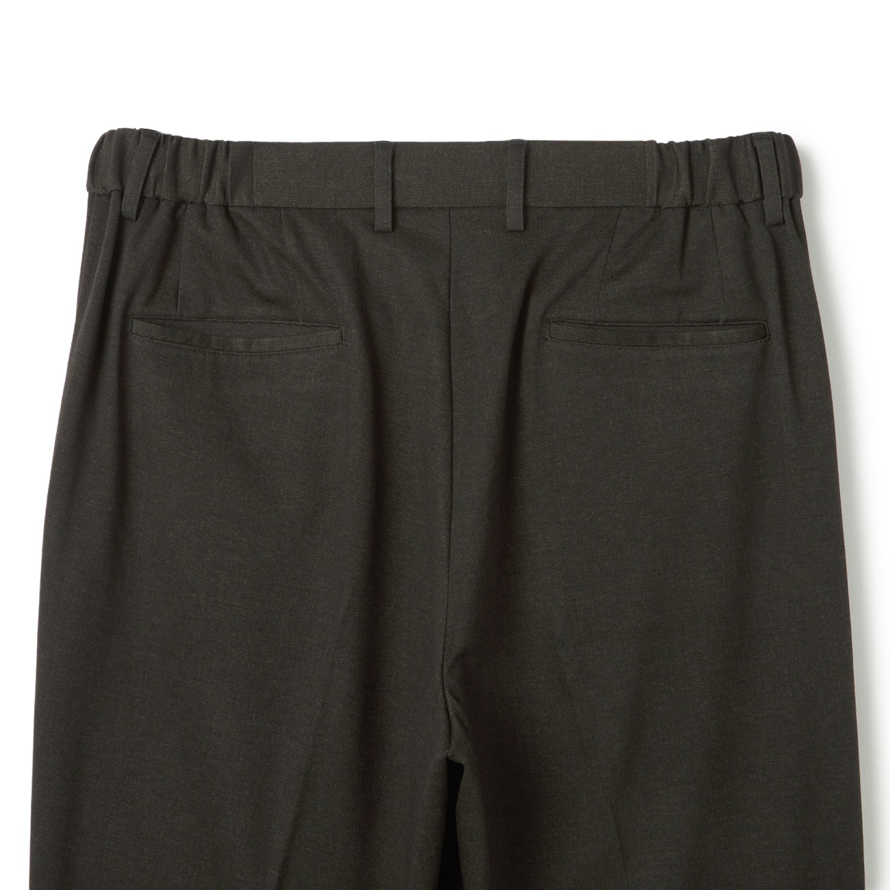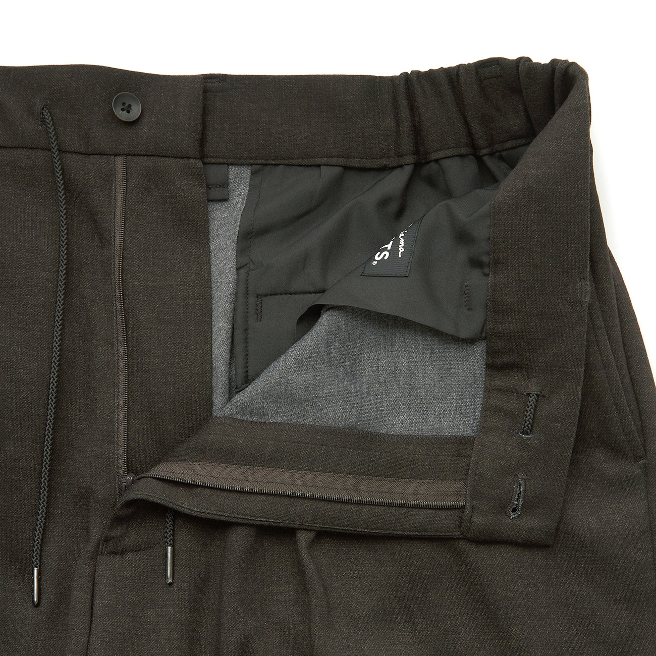 无摺西装裤、裤脚已包边、无内里、腰侧、后臀有口袋、腰部附调节绳。