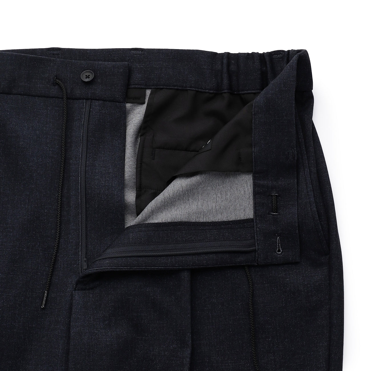 无摺西装裤、裤脚已包边、无内里、腰侧、后臀有口袋、腰部附调节绳。