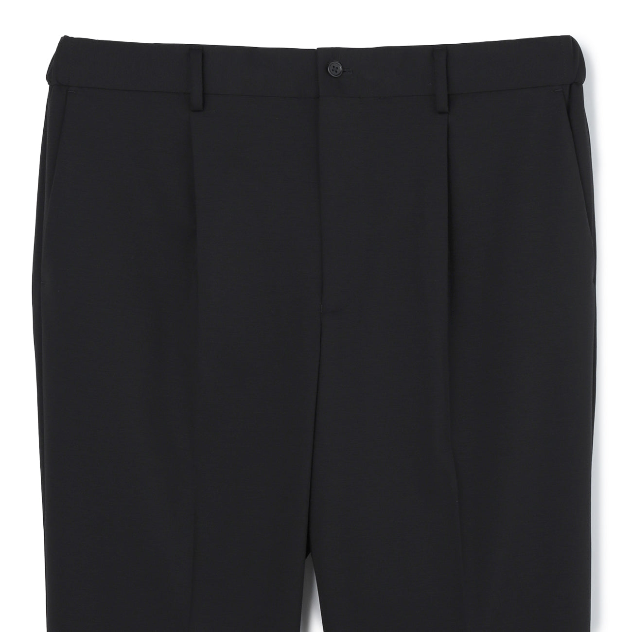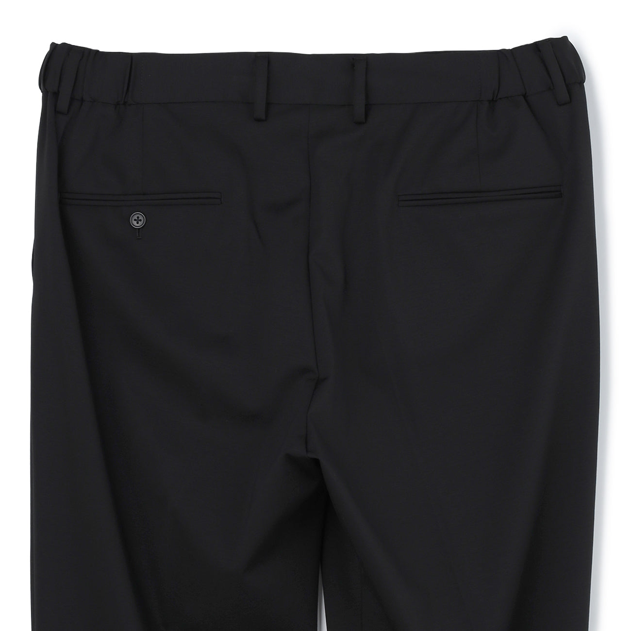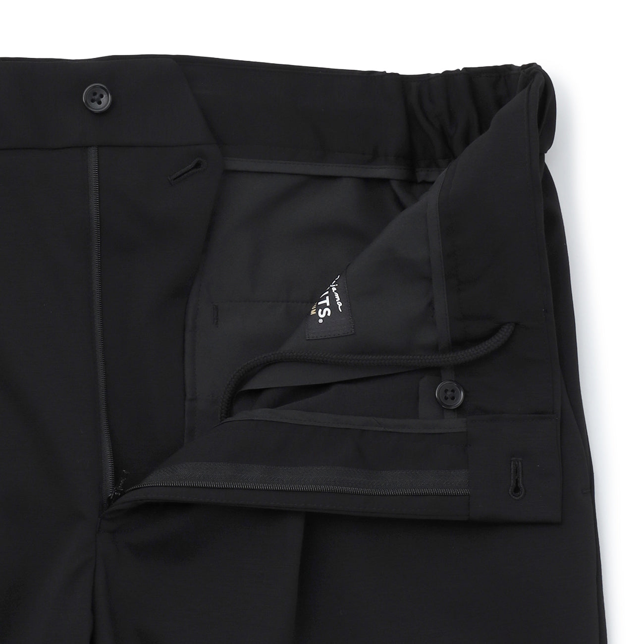 Pre-hemmed, unlined, Tengu button, waist pockets, hip pockets, inner drawstring, comfortable waistband, crease processing