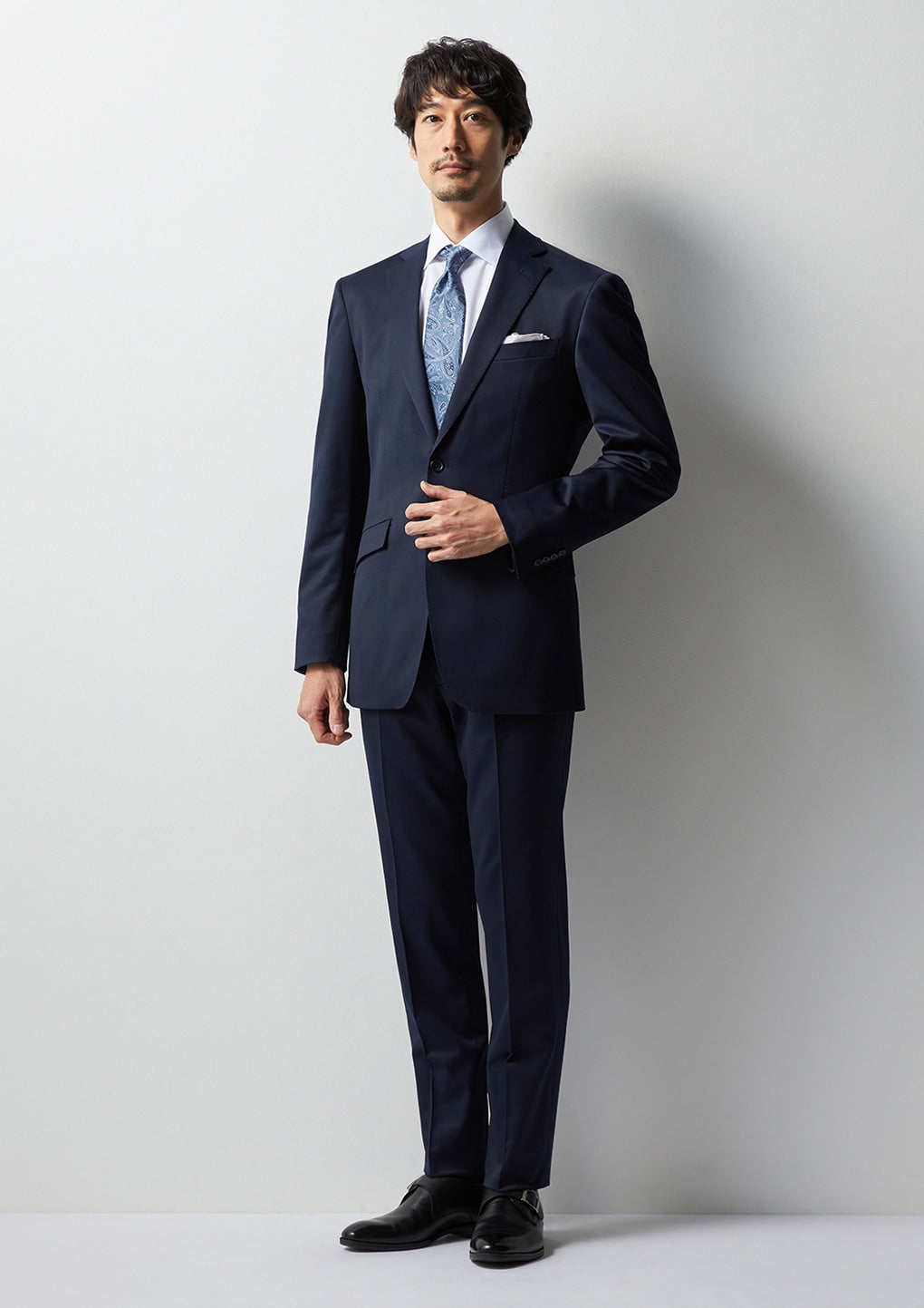 ・西裝外套:2顆鈕扣、背開中叉、袖口假扣眼、半內裏。西裝褲:無摺。