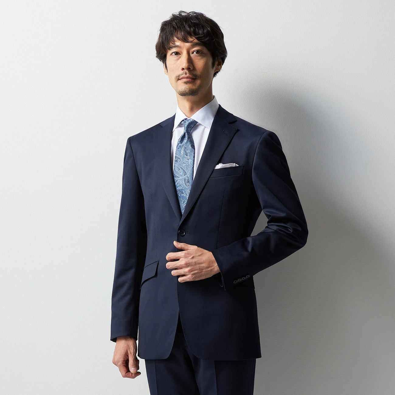 - 2-button closure, center vent, decorative sleeve buttons, half-lined, flat-front pants.