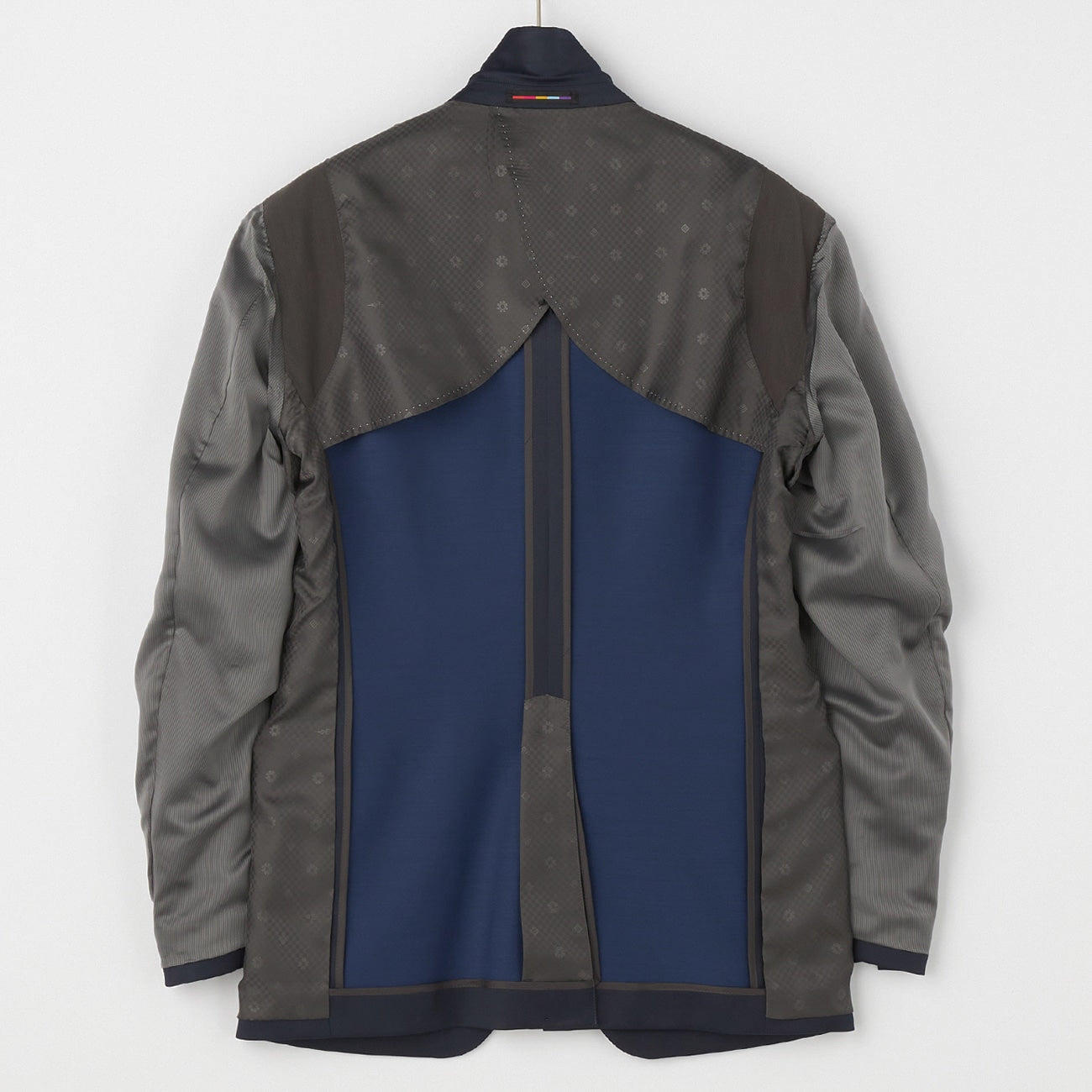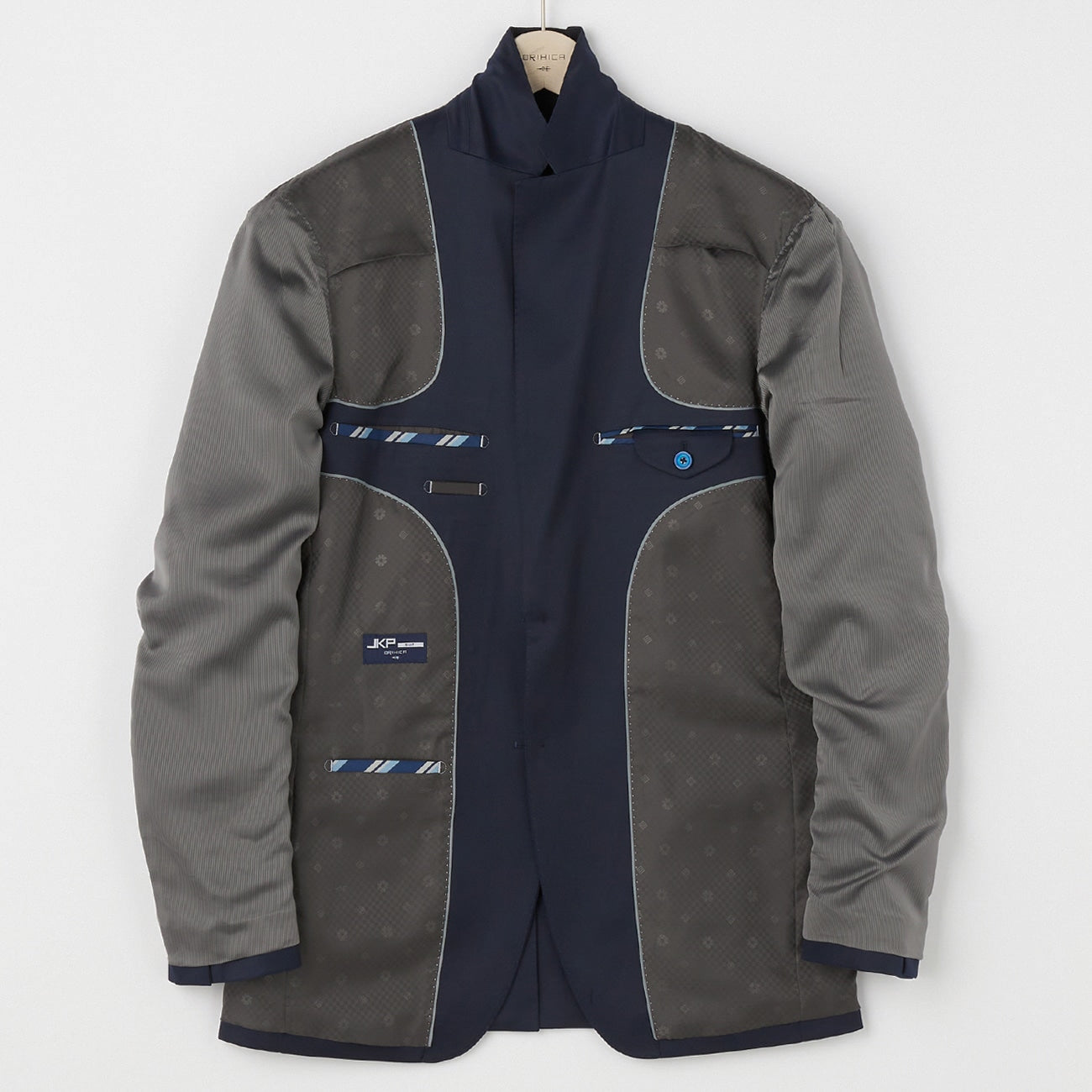 Wool blend suit combining elegant texture with synthetic fiber functionality.