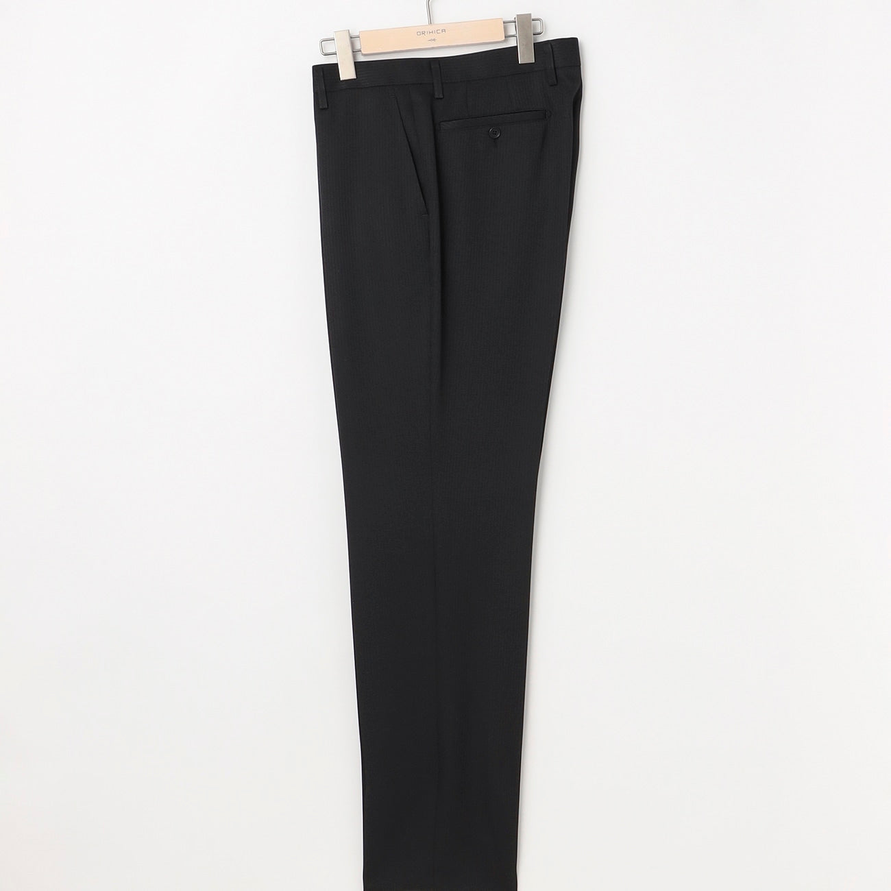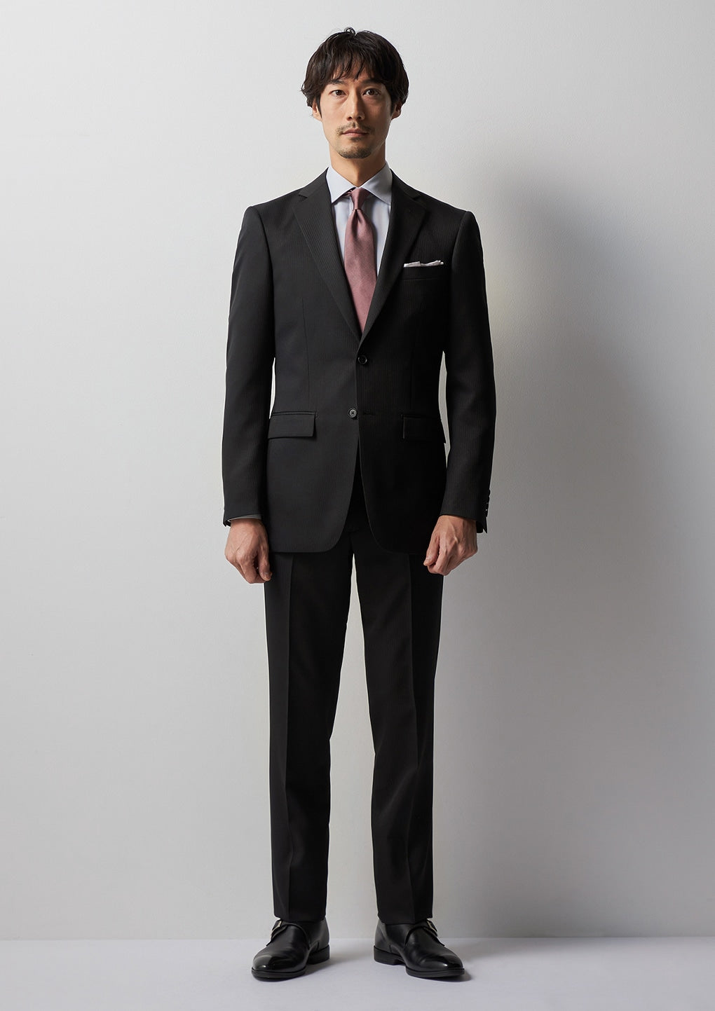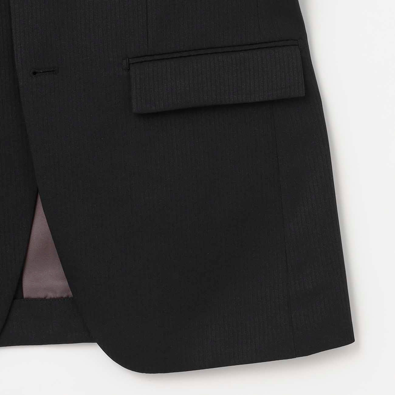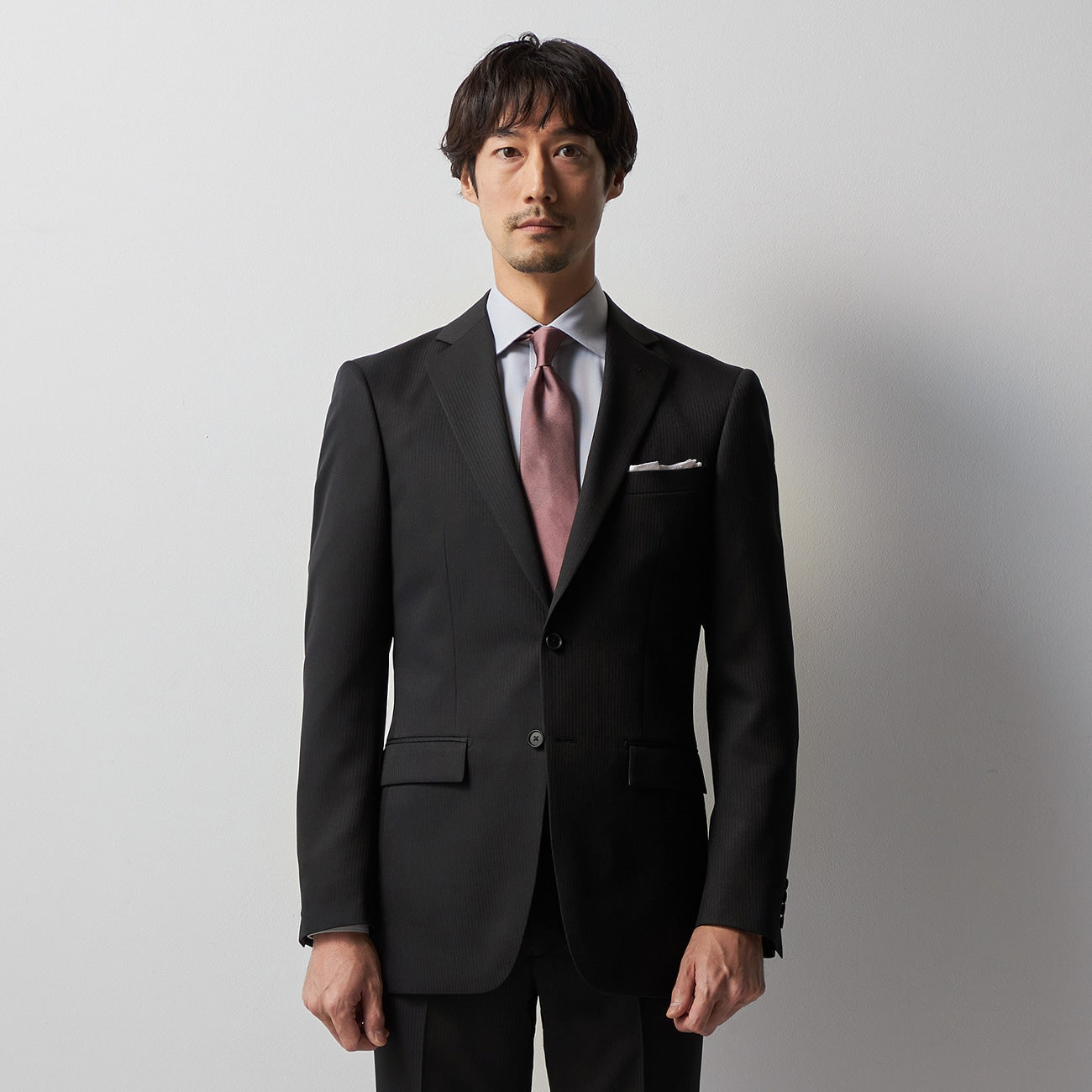 ・西裝外套:2顆鈕扣、背開中叉、袖口假扣眼、半內裏。西裝褲:無摺。