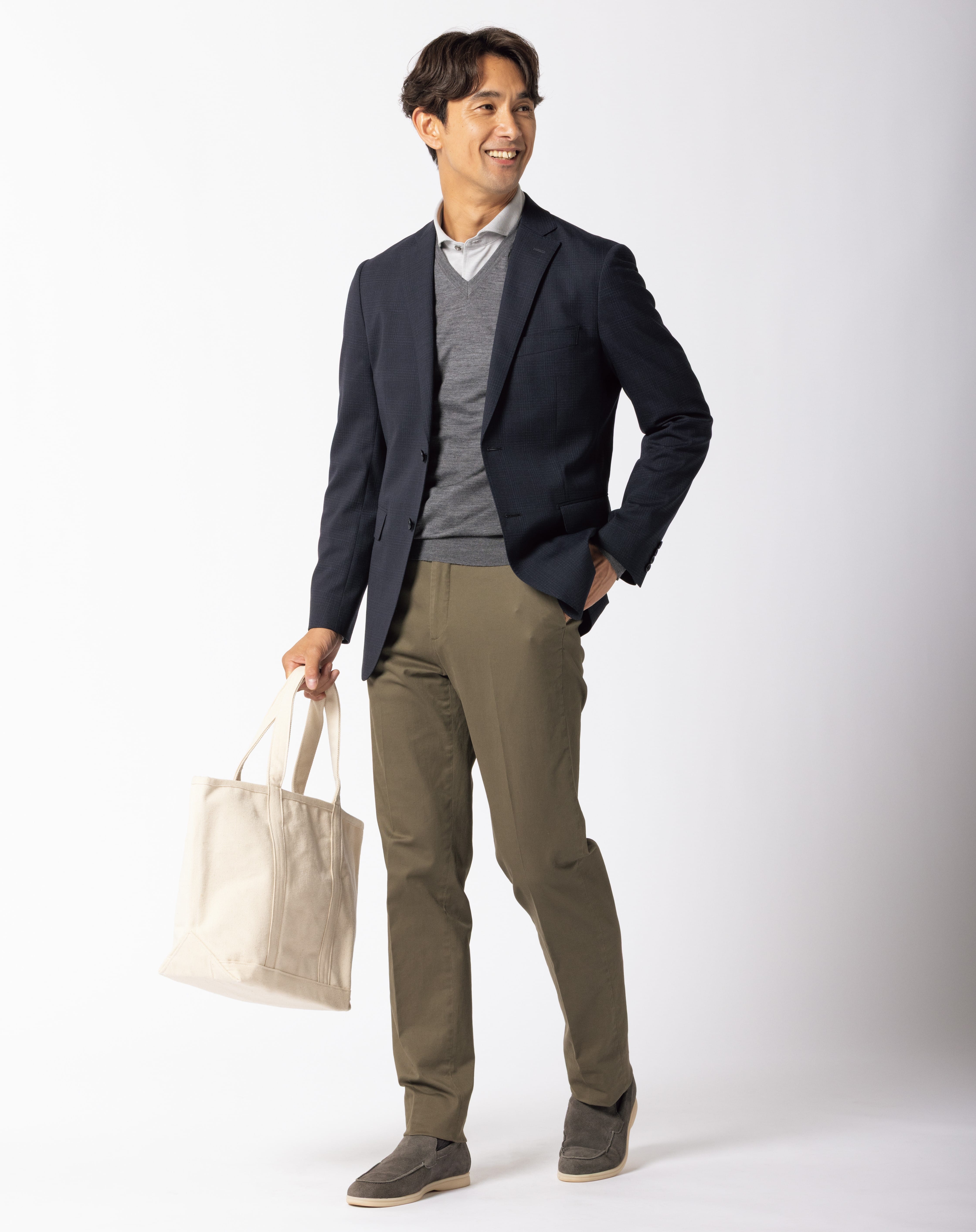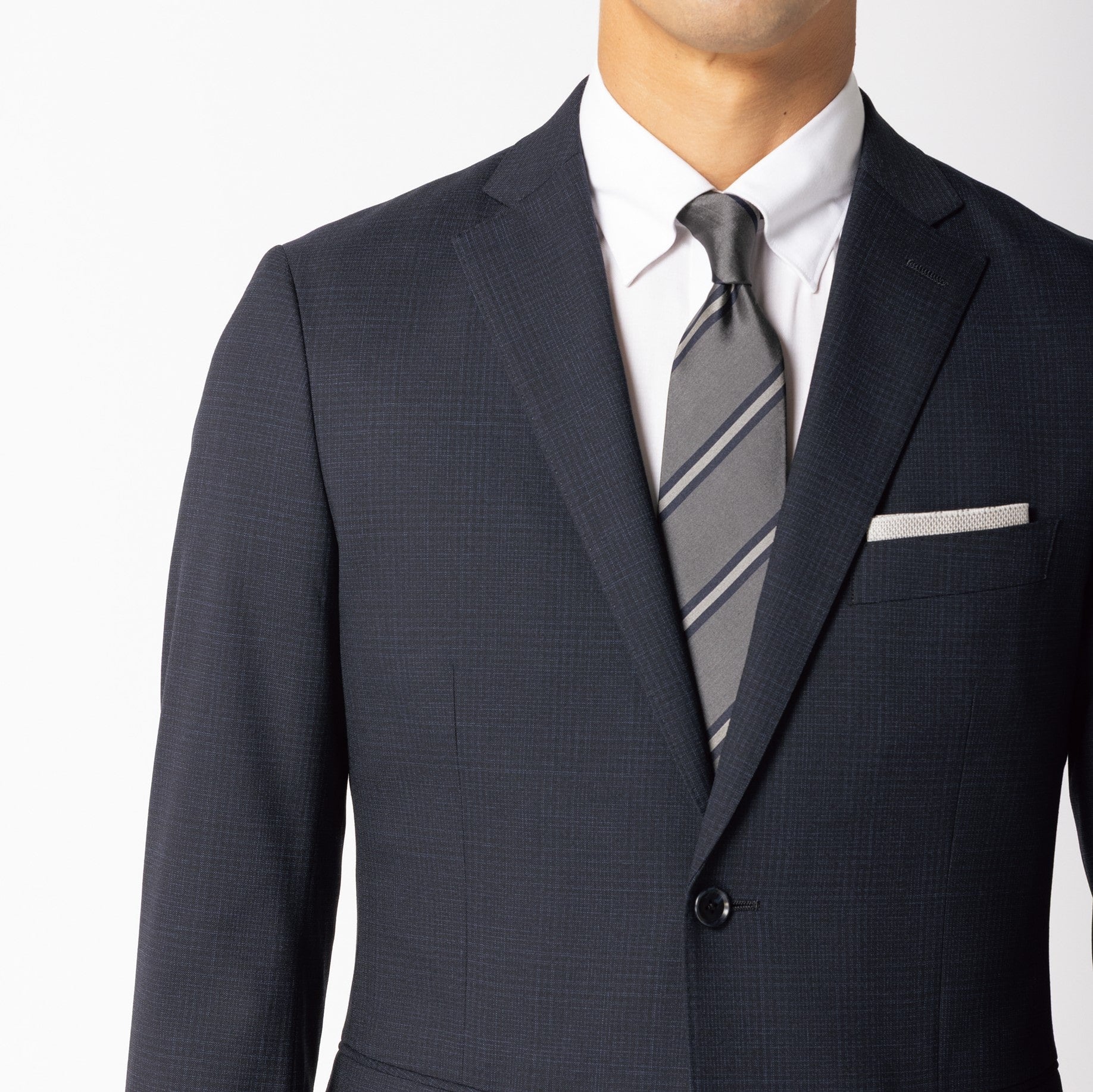 西装外套肩膀略呈圆弧线条,穿着轻松不拘束。肩宽适中、腰部略为收窄,打造出自然立体身形。西装裤为低腰锥形设计,腰围不紧绷、锥形剪裁更有修饰腿型效果。
