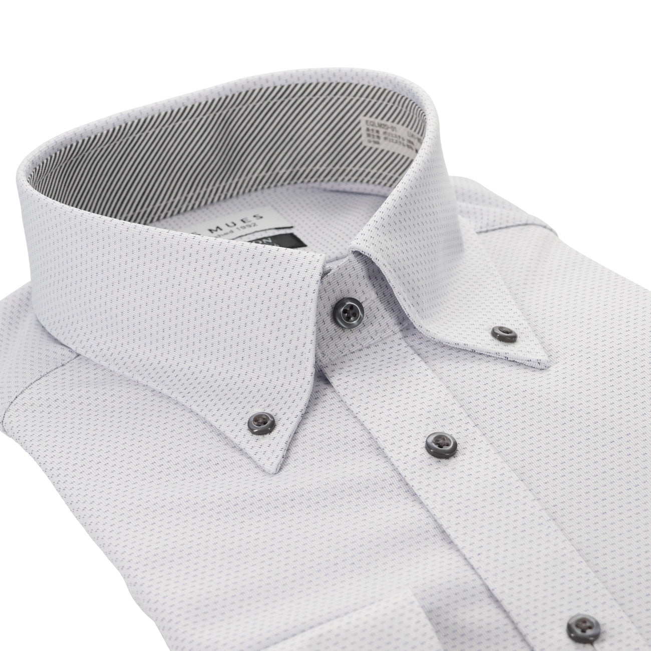 长袖、钮扣领、左胸有口袋、衣领与袖口配色设计、袖围可调整、双用袖设计