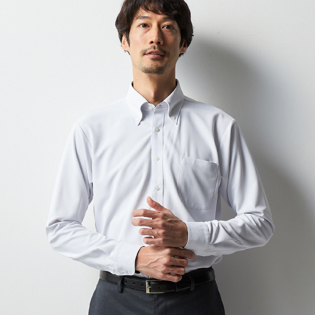 Super non-iron shirt with excellent stretch, sweat stain resistance, and anti-see-through properties.