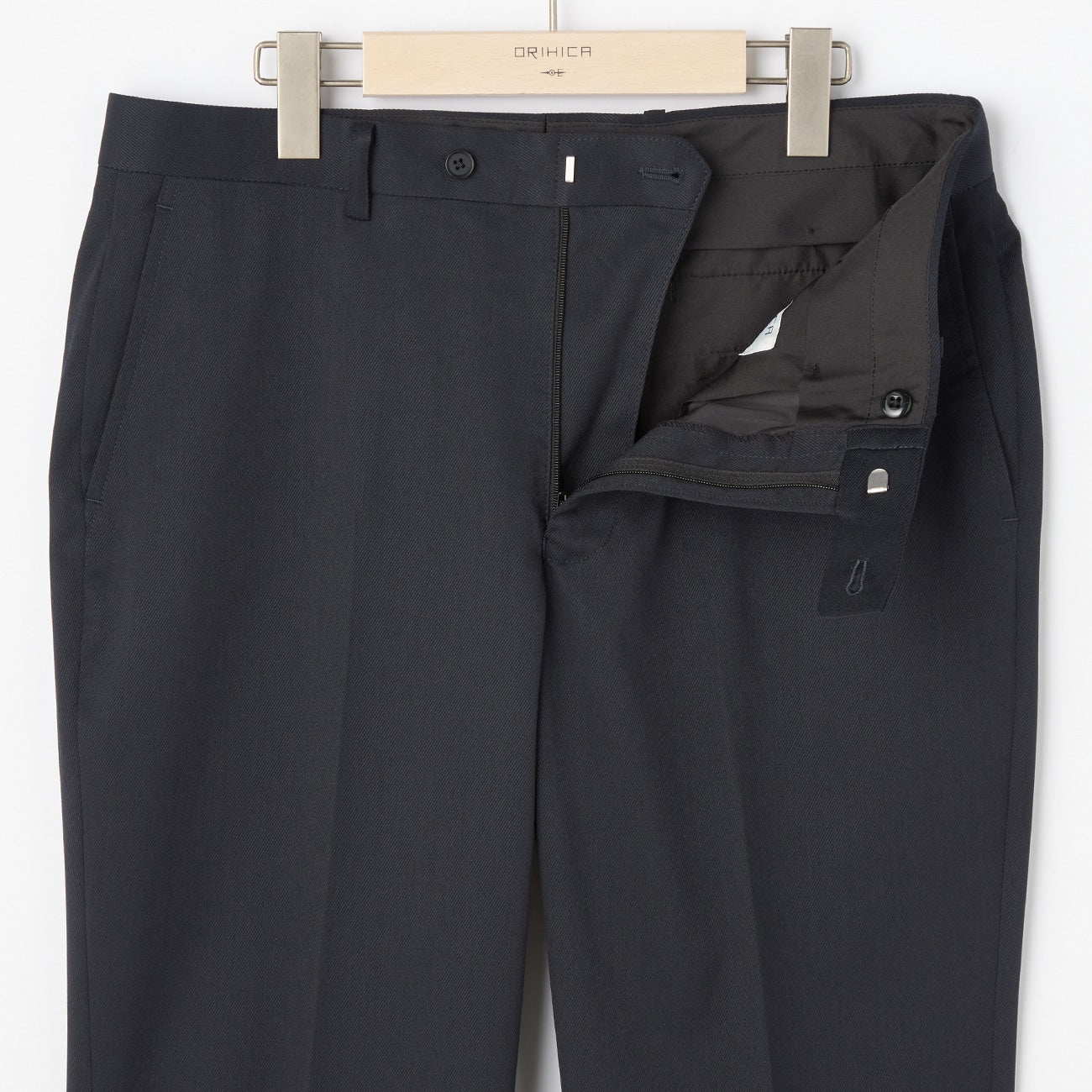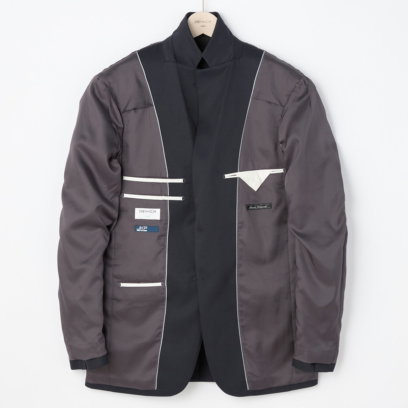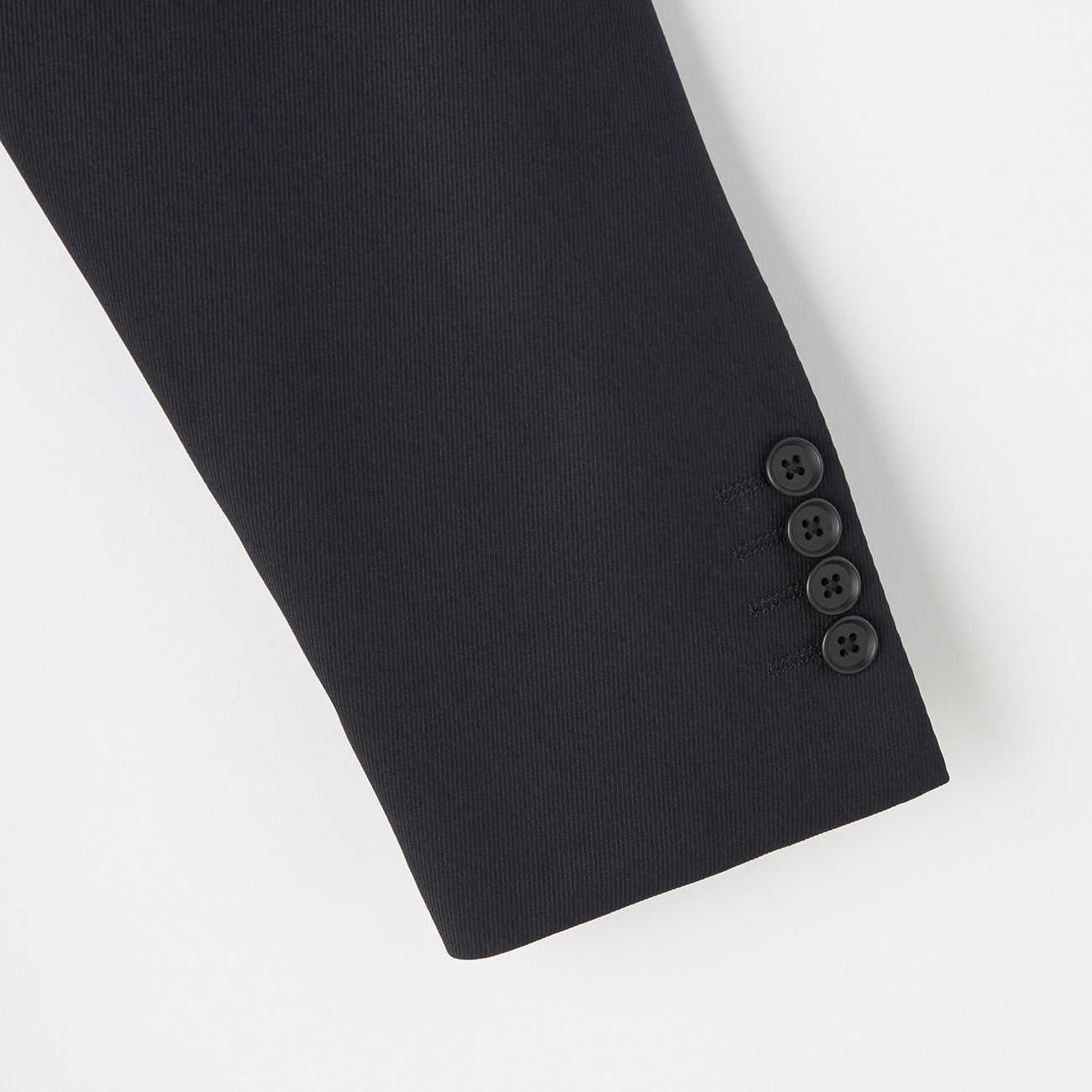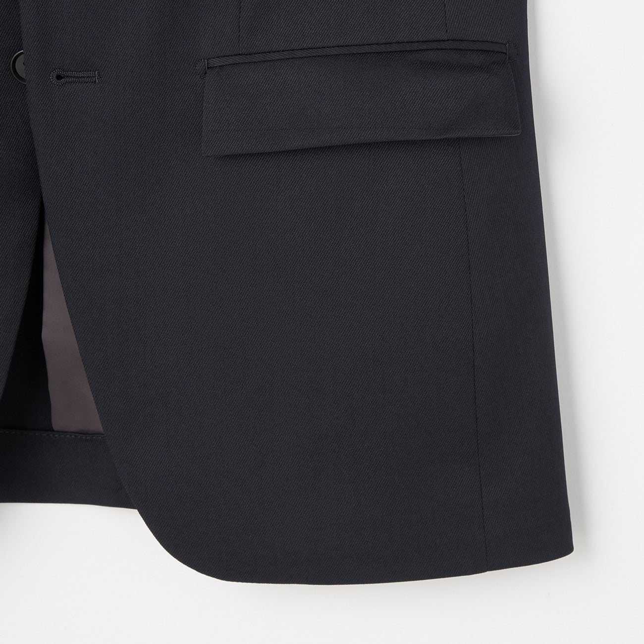 ・西装外套:2颗钮扣、背开中叉、袖口假扣眼、半衬里。西装裤:无摺。