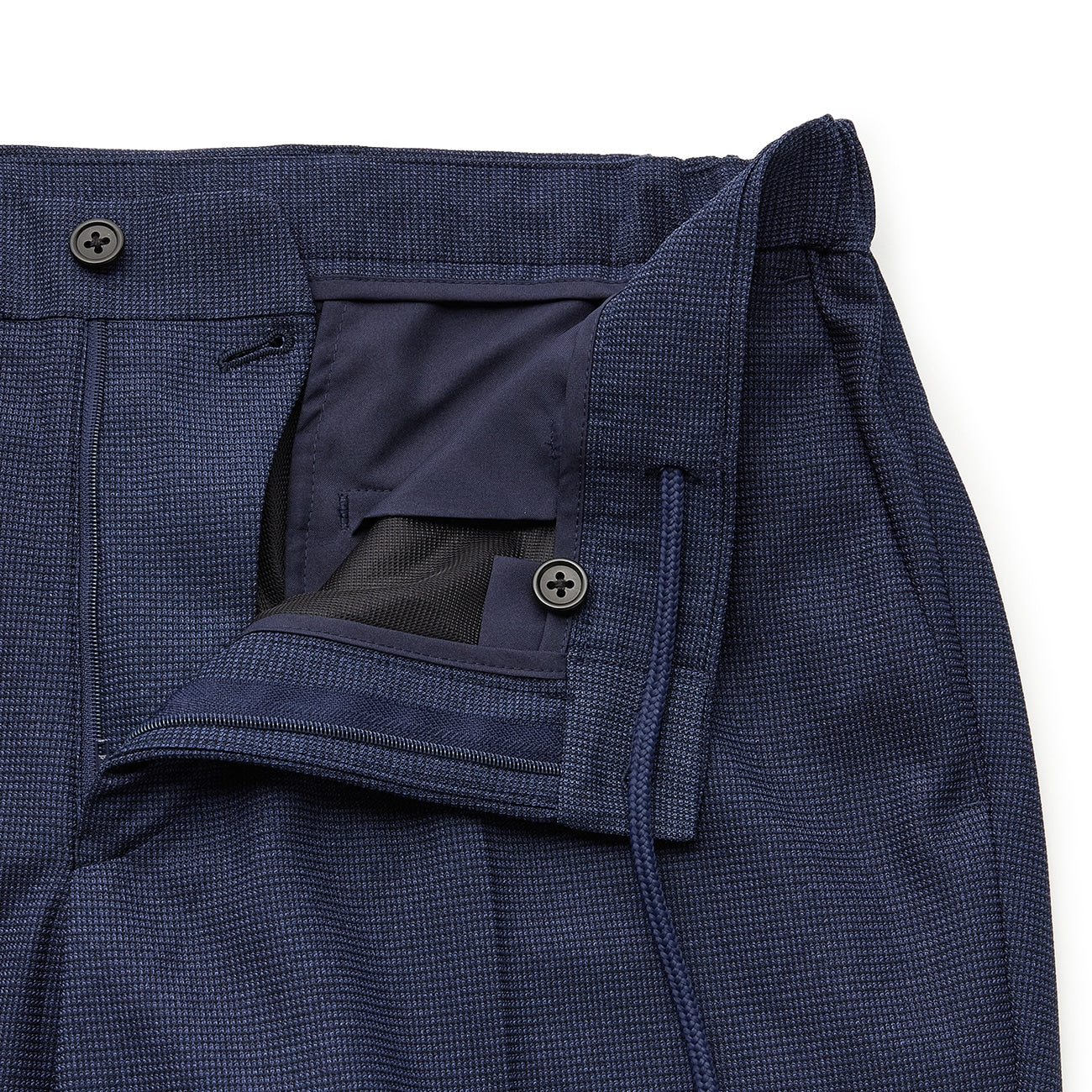 ・前側細壓線增添正式感,腰圍鬆緊帶搭配可拆式抽繩,西裝褲也能舒適不緊繃。