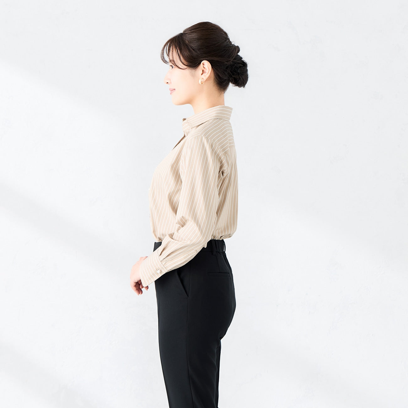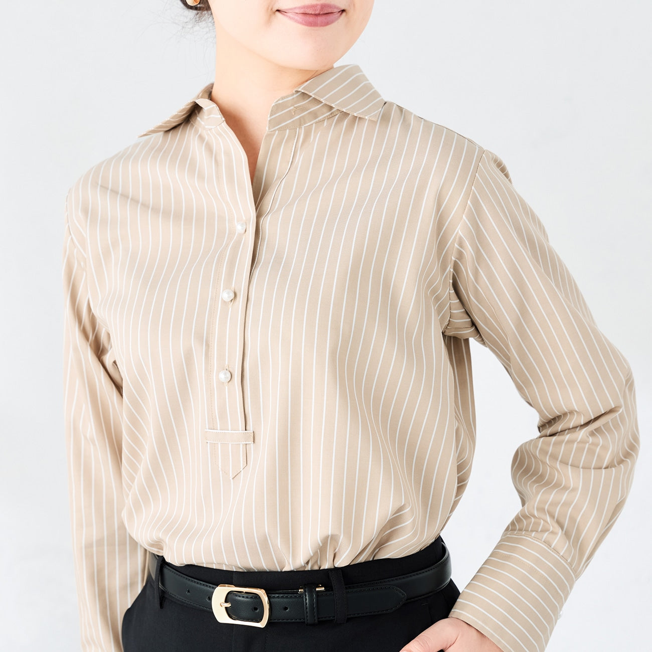 大小恰到好處的珍珠扣,搭配袖口變換角度的條紋設計,為上班襯衫增添優美細節。襯衫衣長可紮、露出下擺也顯得俐落有型。
