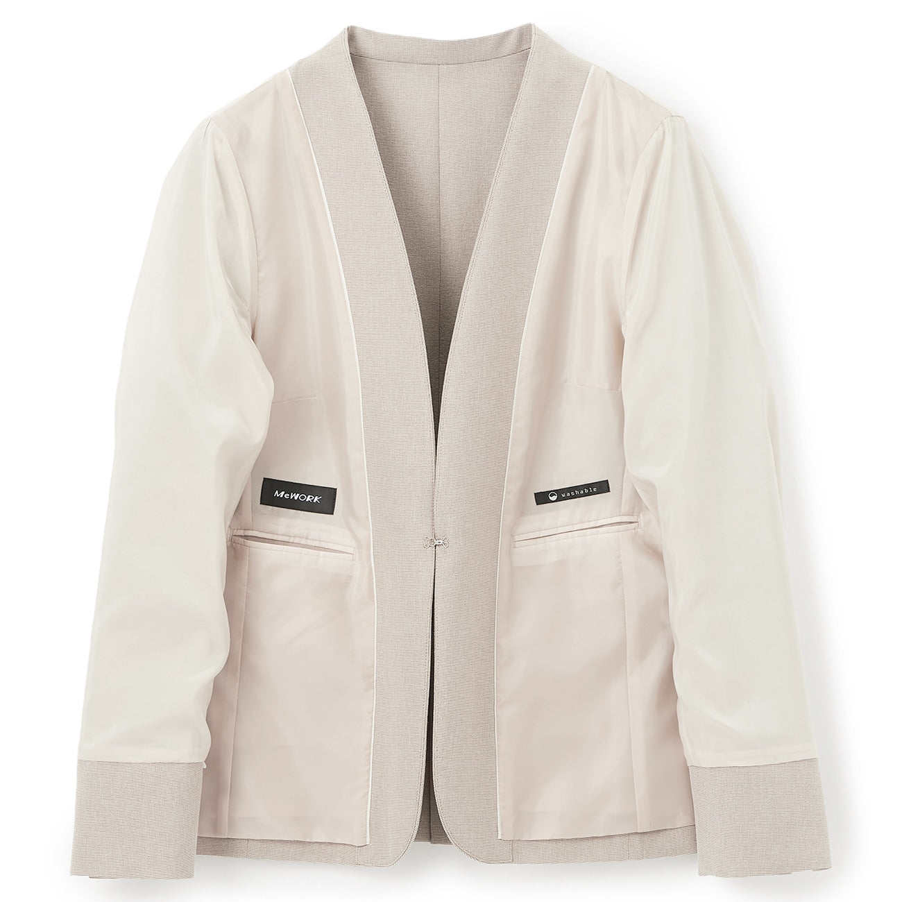 无领西装外套、半衬里、前钩扣、袖口可翻折、腰部、内侧有口袋