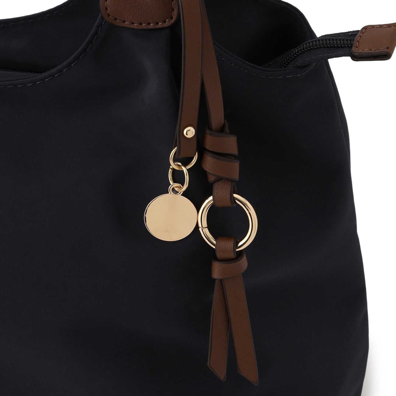 This lightweight polyester bag features striking bi-color handles with long straps for easy shoulder carrying even over thick coats, all accented by an elegant ring charm.