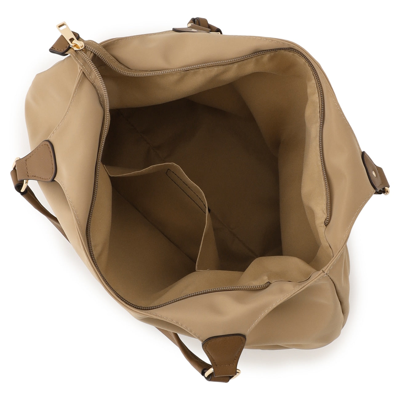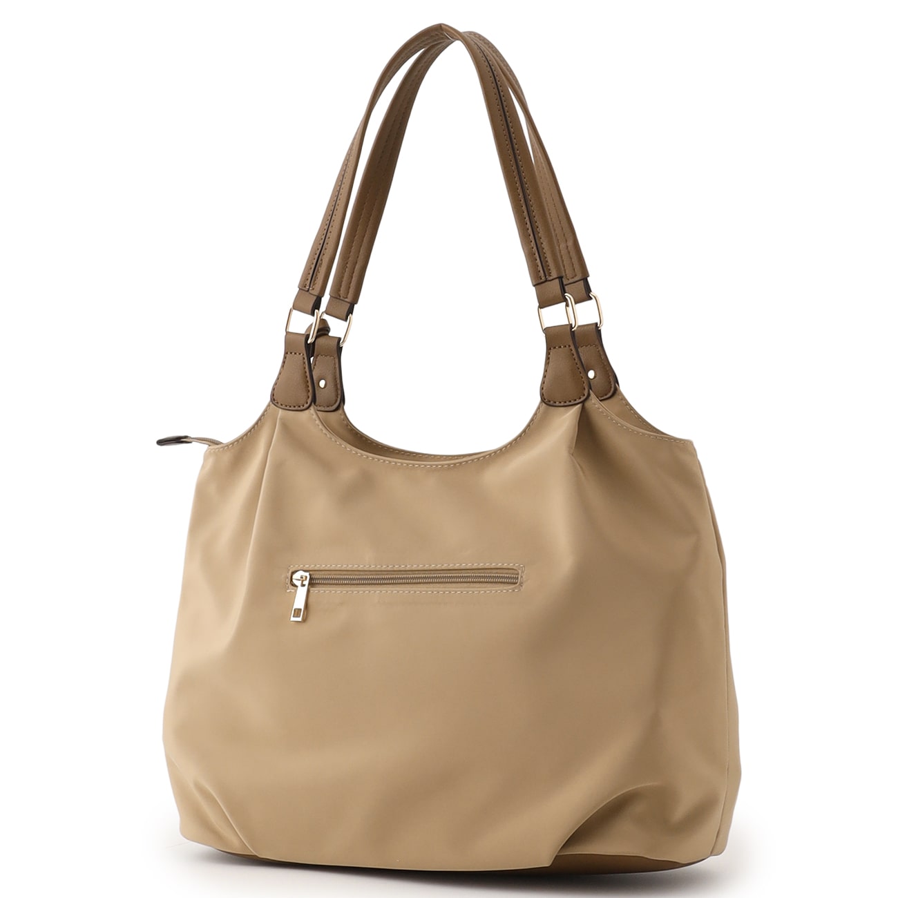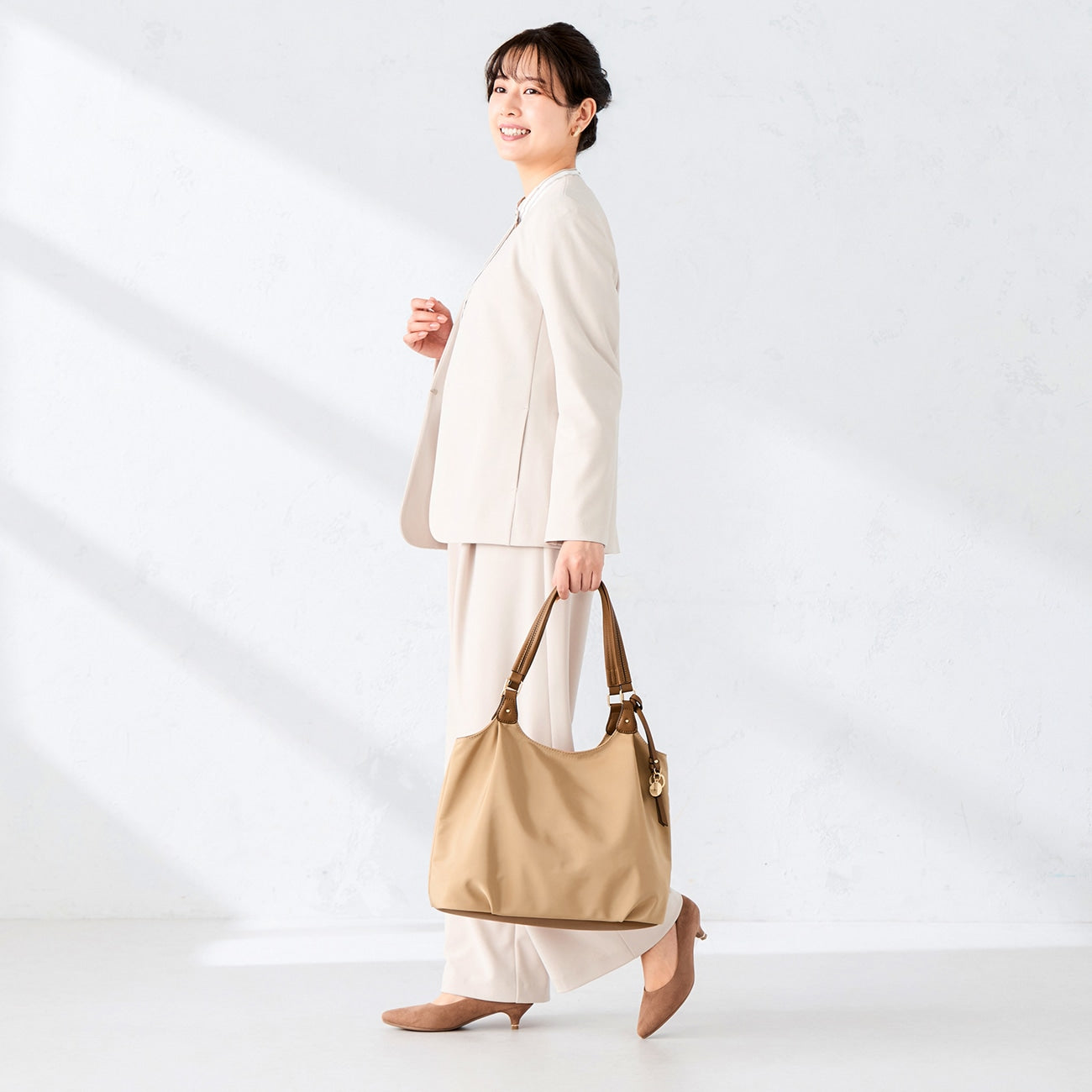 結合輕量聚酯纖維與皮質提把,增添優雅質感。提把偏長設計,可手提亦可肩背,另有金屬吊飾點綴。