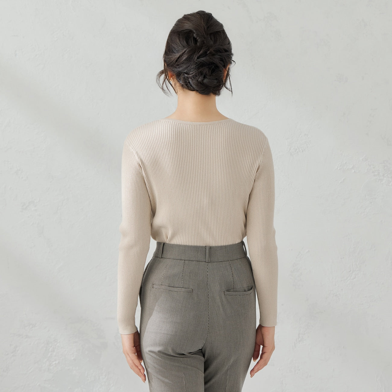 V领 完美凸显肩部曲线。精致的罗纹和三维轮廓使其看起来更加利落,所有这些都采用了柔软、无划痕的针织面料。