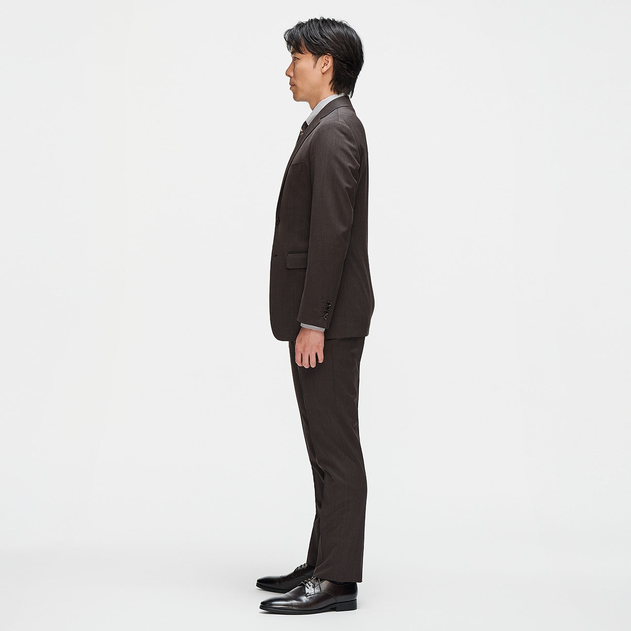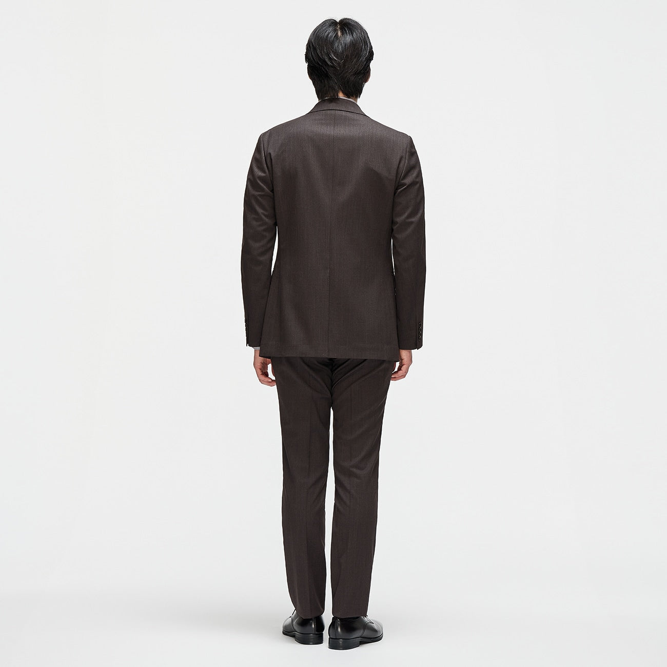 西装外套肩膀略呈圆弧线条,穿着轻松不拘束。肩宽适中、腰部略为收窄,打造出自然立体身形。西装裤为低腰锥形设计,腰围不紧绷、锥形剪裁更有修饰腿型效果。