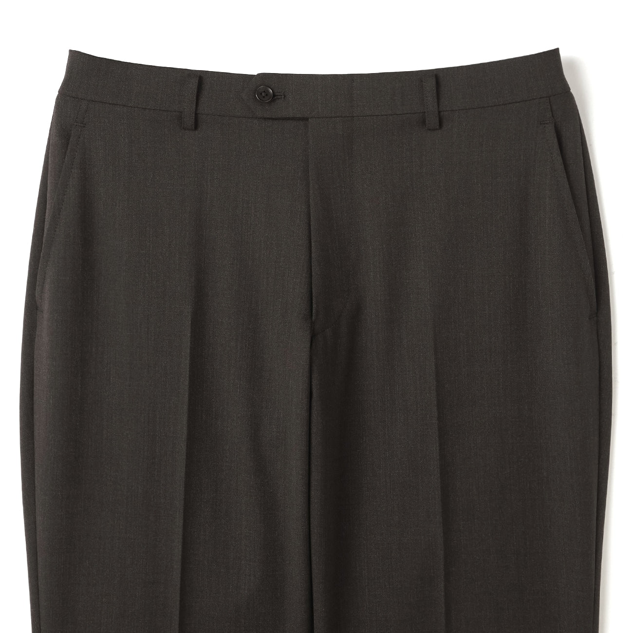 西装裤:无摺、低腰裤、中央压线处理