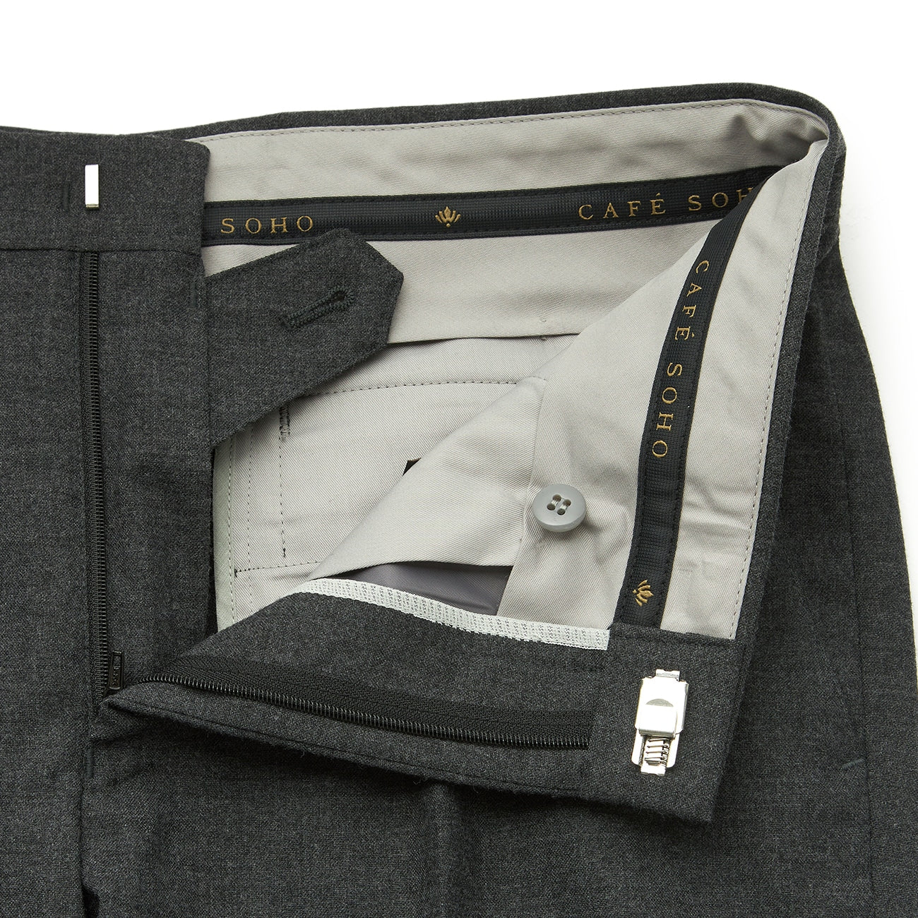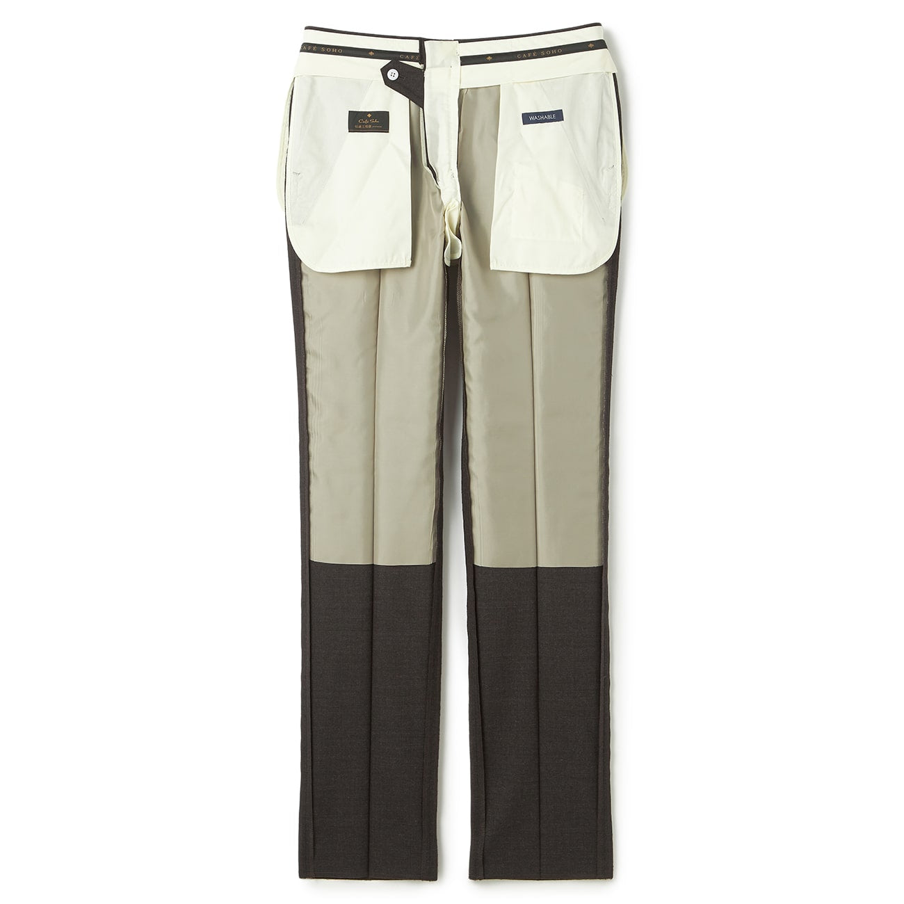 无摺西装裤、腰部内侧防滑设计、腰围伸缩扣(可伸缩1.5公分)、右口袋内有零钱袋