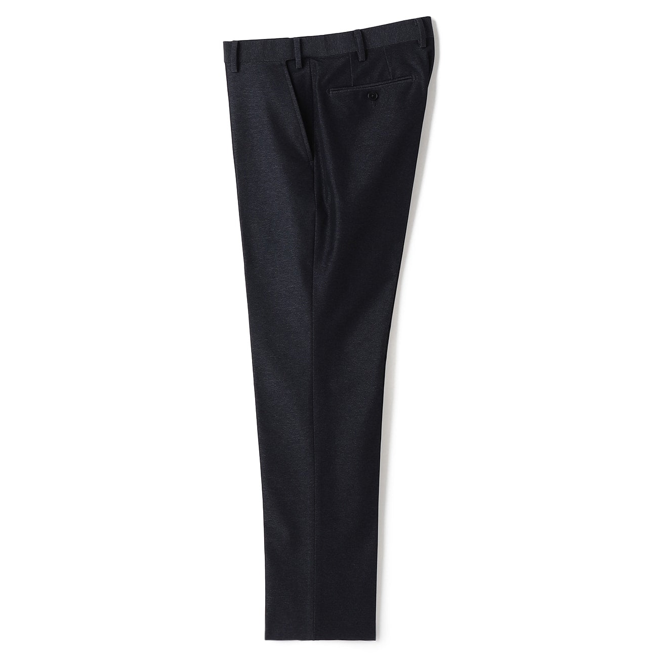 锥形裤、无摺(中央细压线)。