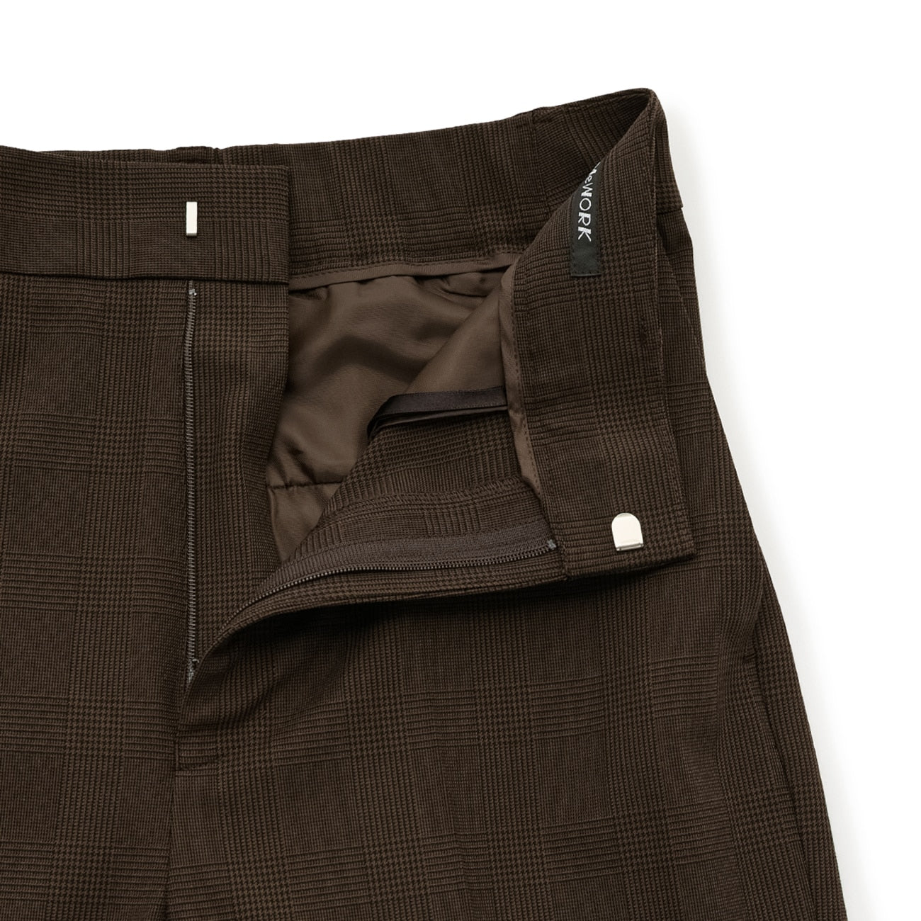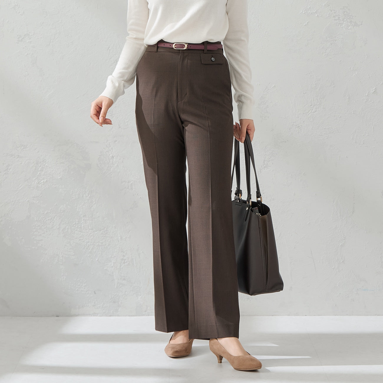 喇叭裤给人精致、整洁的印象。经典的格纹图案,迷人的硬币口袋,别致的棕色也非常适合休息日穿着。