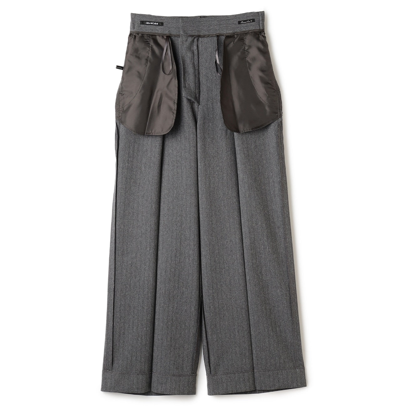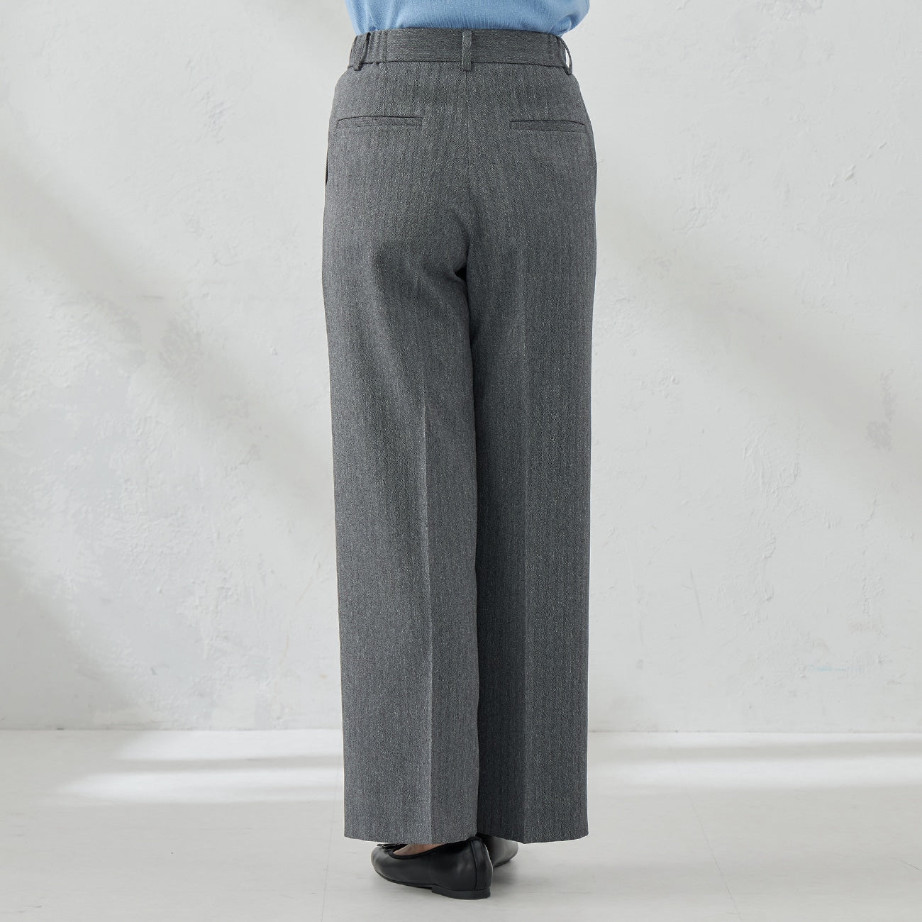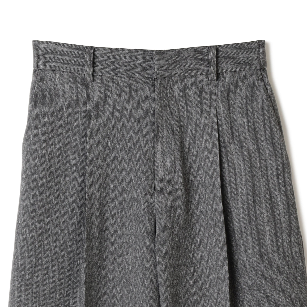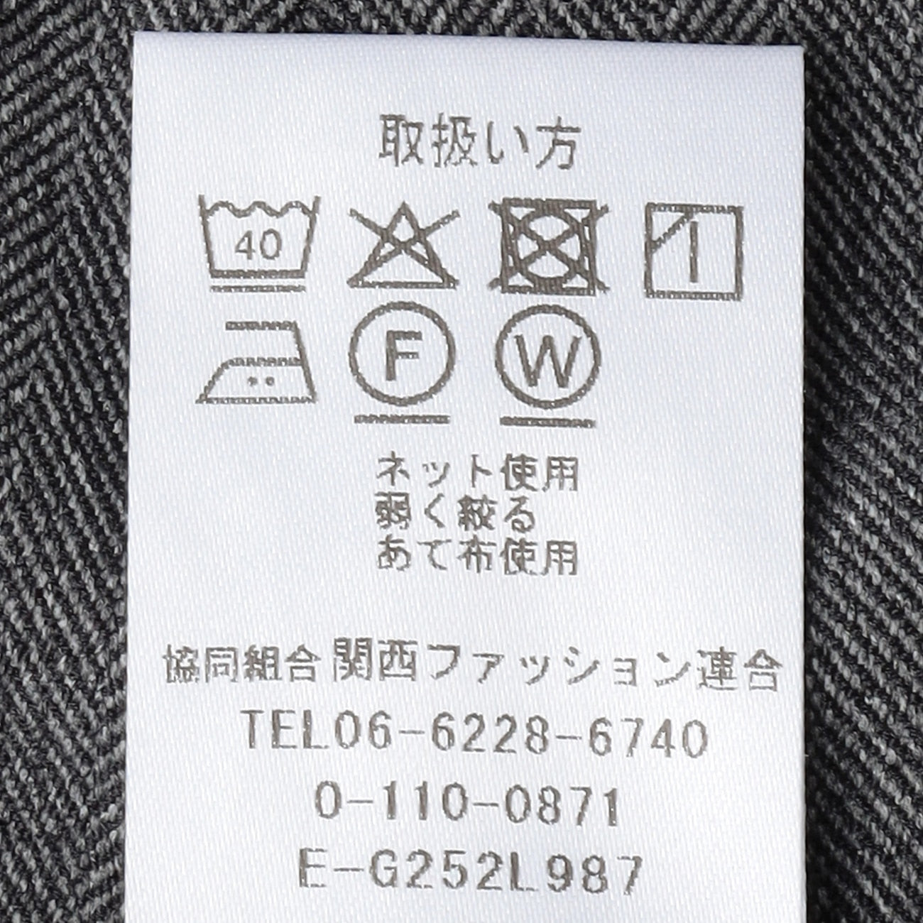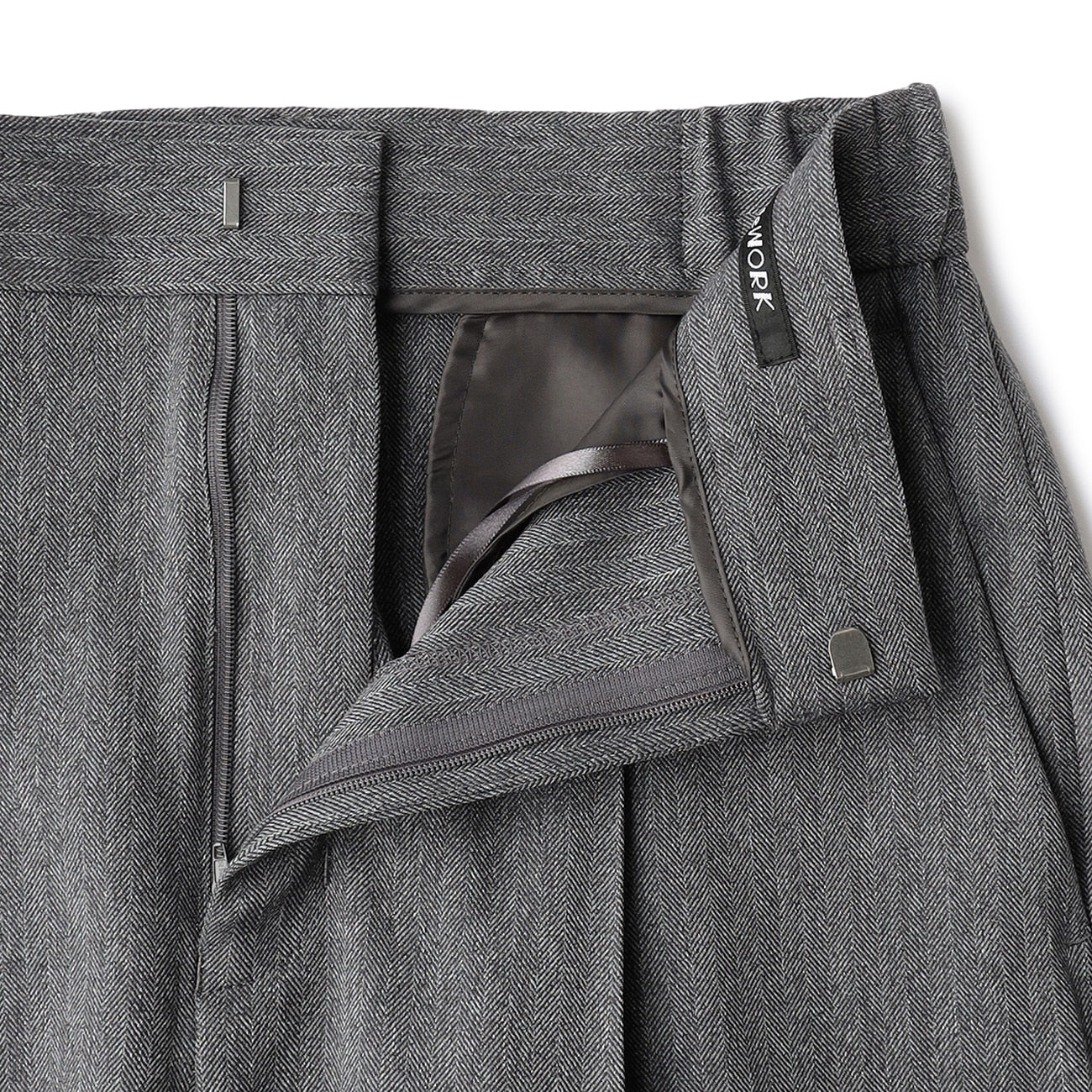 采用仿毛斜纹软呢风格的人字形面料,打造优雅的秋冬造型。前部的立体褶皱和适度的空间感营造出精致而轻松的感觉。