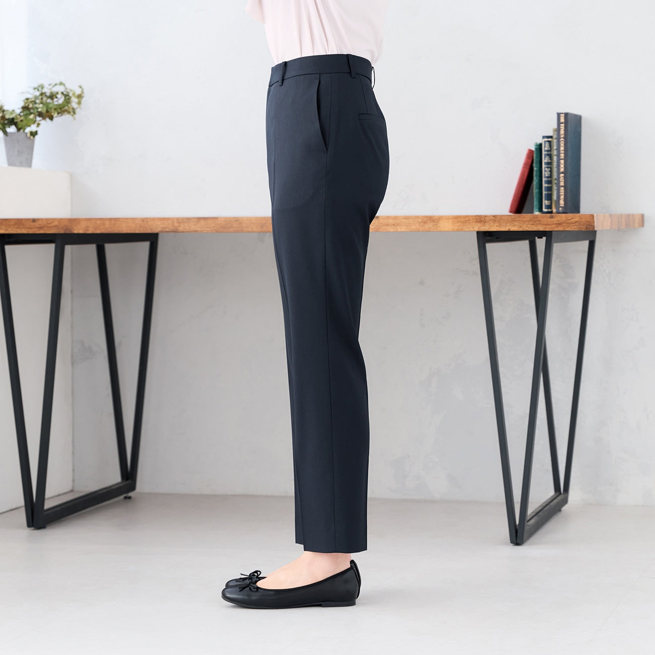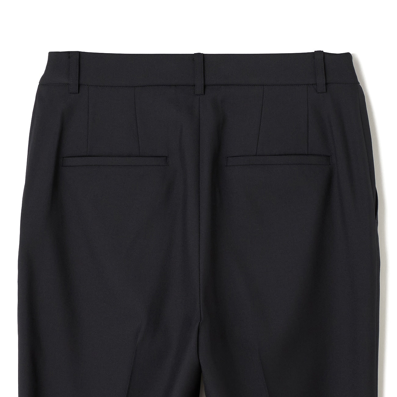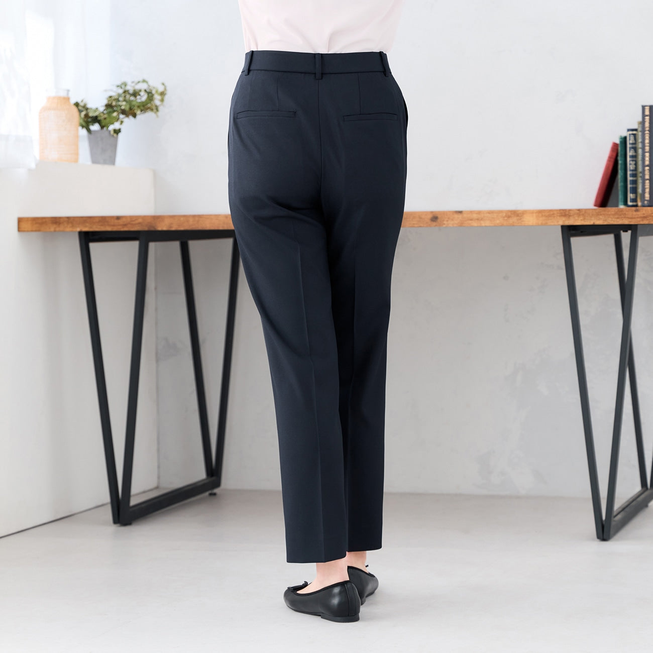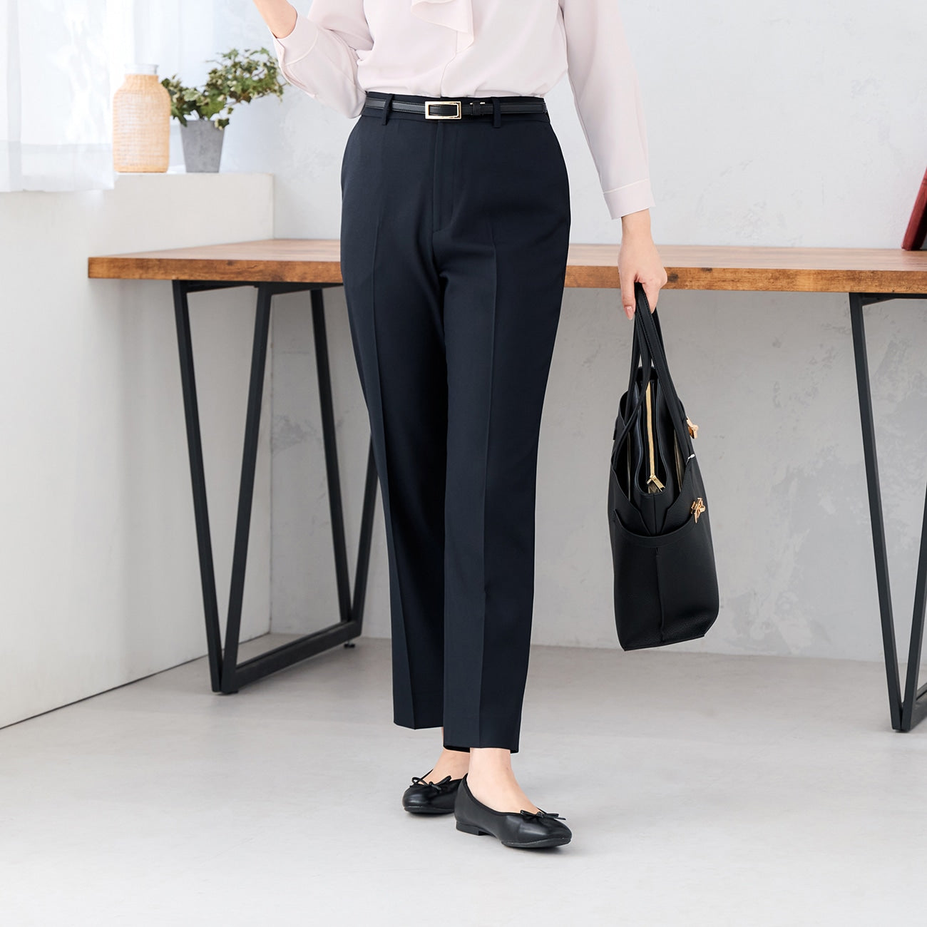 Timeless straight silhouette not influenced by trends. Moderate room that does not pick up leg lines too much emphasizes vertical lines and demonstrates leg-lengthening effect. Deep pockets where smartphones fit completely and are hard to drop. Exquisite length that looks beautiful with both heels and loafers.