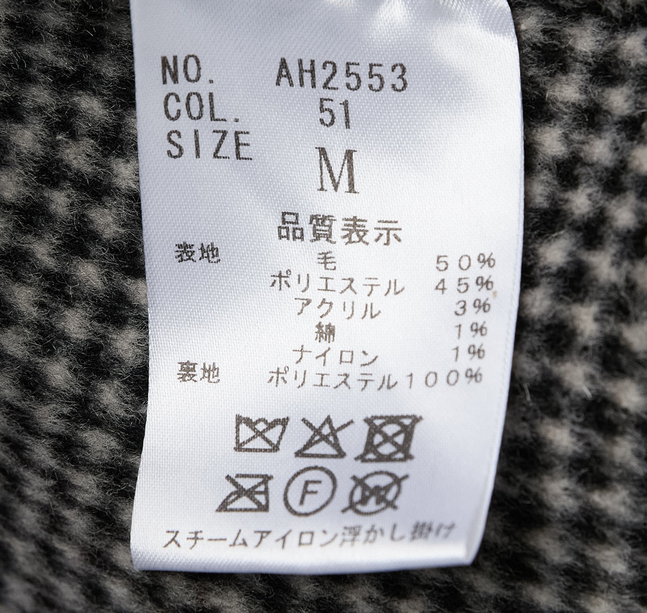 外层布料: 50%羊毛, 45%聚酯纤维, 3%腈纶, 1%棉, 1%尼龙